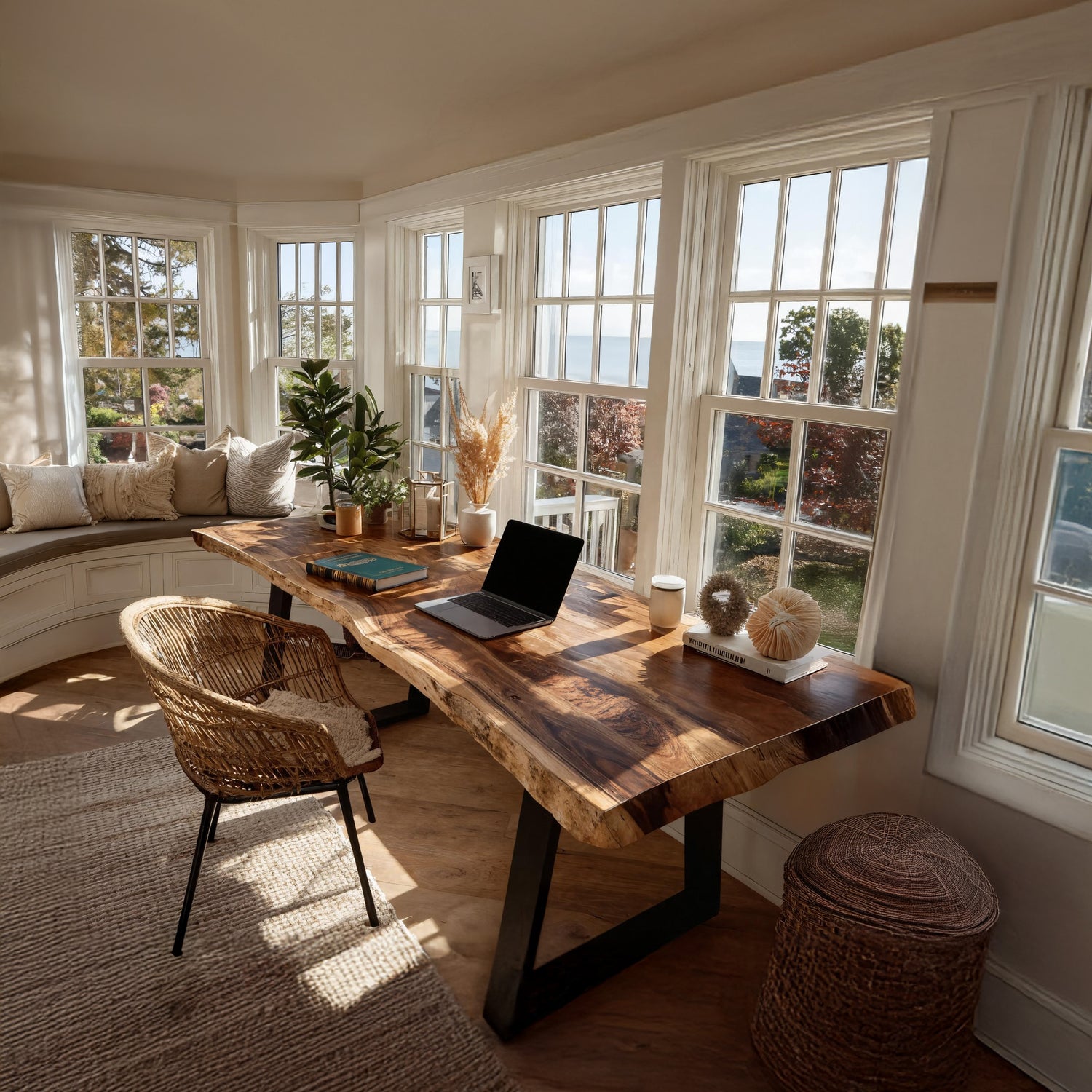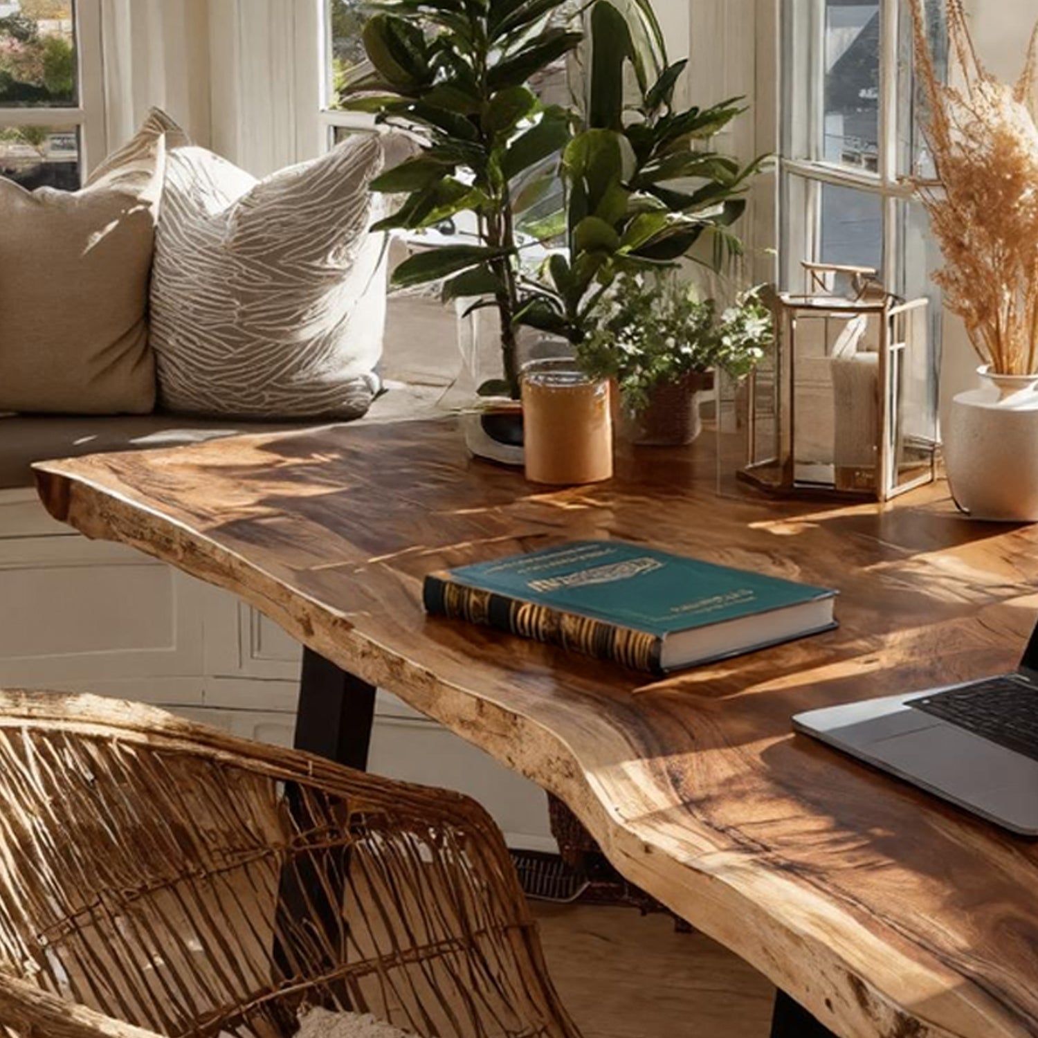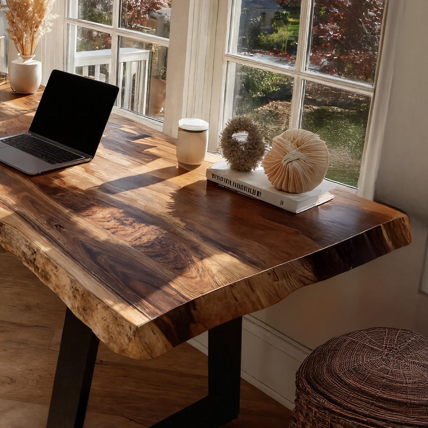 This desk is meticulously handcrafted from carefully selected solid monkey pod wood, showcasing flowing live edges, rich grain movement, and natural variations that make each piece one-of-a-kind. Designed with a timeless silhouette, it blends artisanal craftsmanship with enduring functionality, suitable for both contemporary and rustic-inspired spaces.