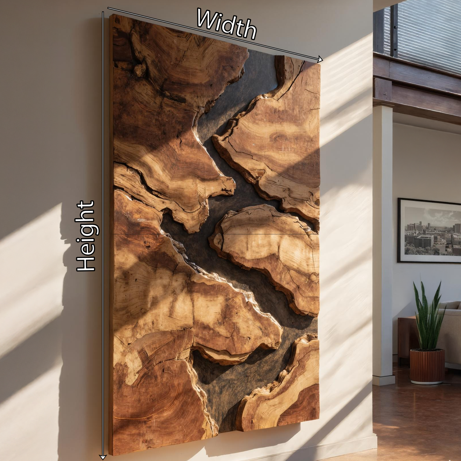 This wall-mounted sculpture blends fluid, organic contours with minimalist elegance. Hand-carved from solid hardwood, the rhythmic folds resemble ocean tides frozen in motion. The golden-toned wood grain is accentuated by deep charcoal edges, creating a striking interplay of warmth and contrast. Designed with a hidden mount, the piece floats seamlessly against your wall, enhancing its sculptural presence.