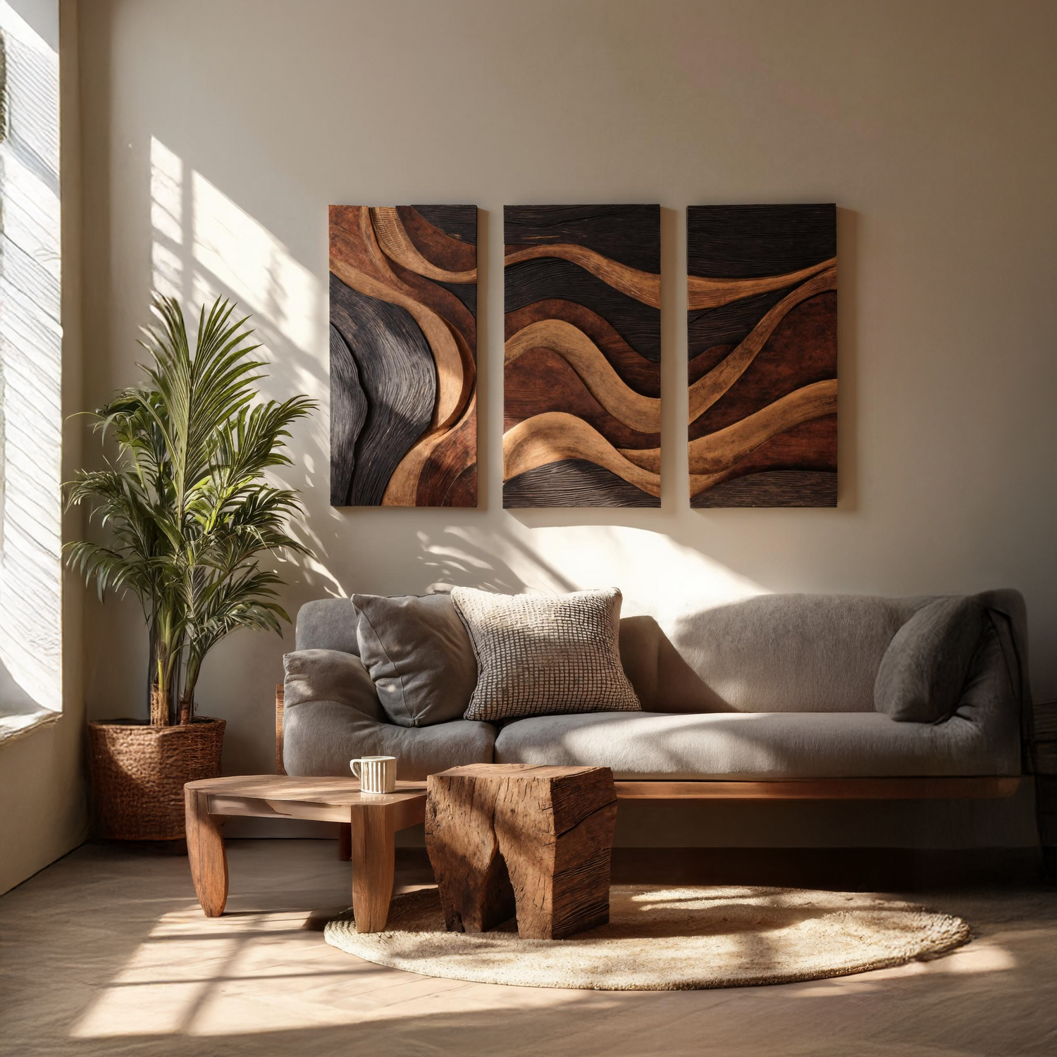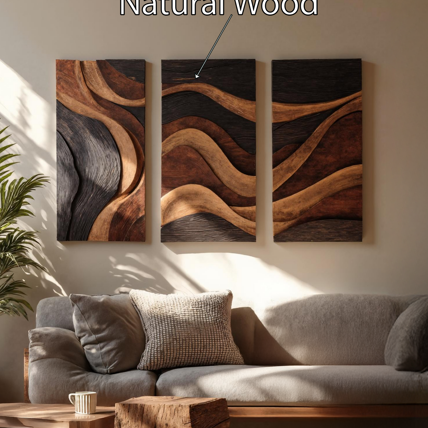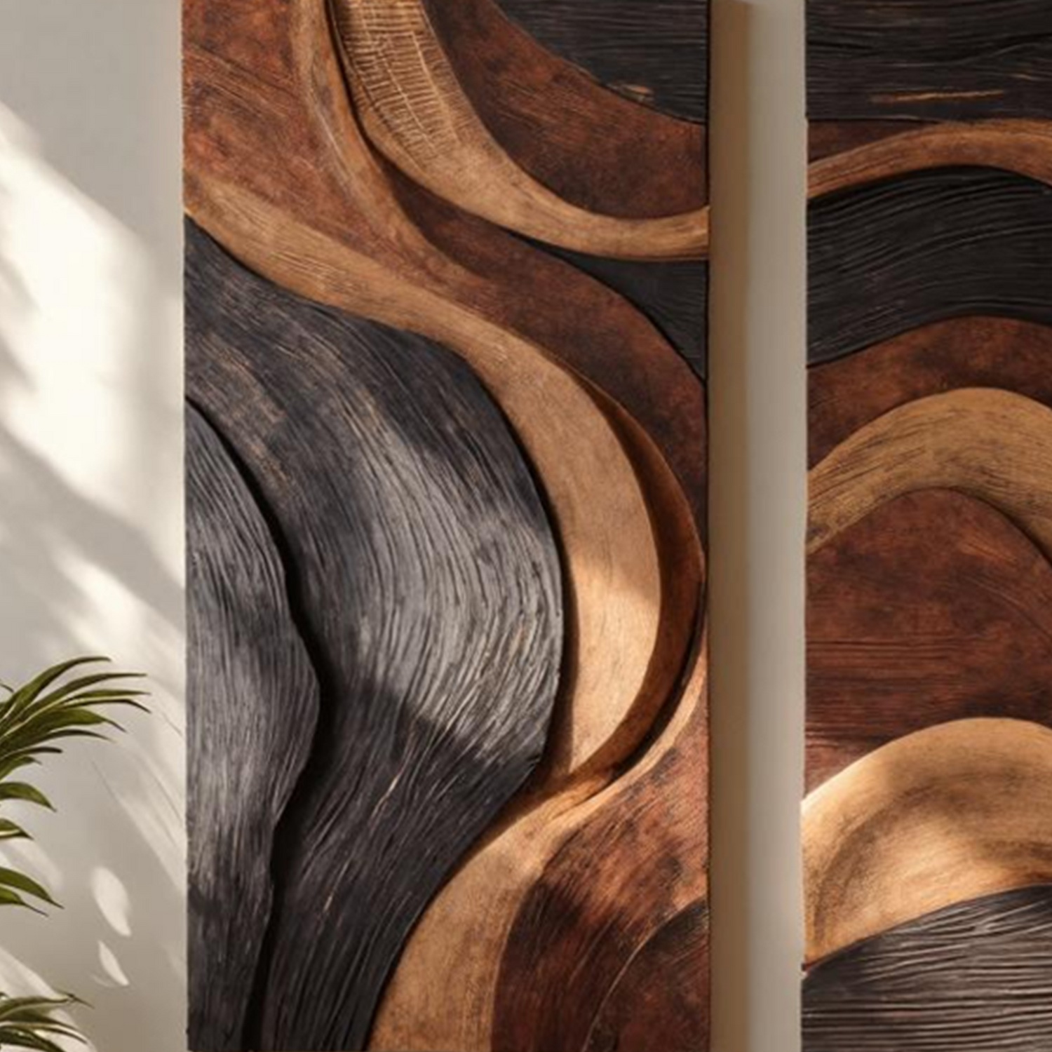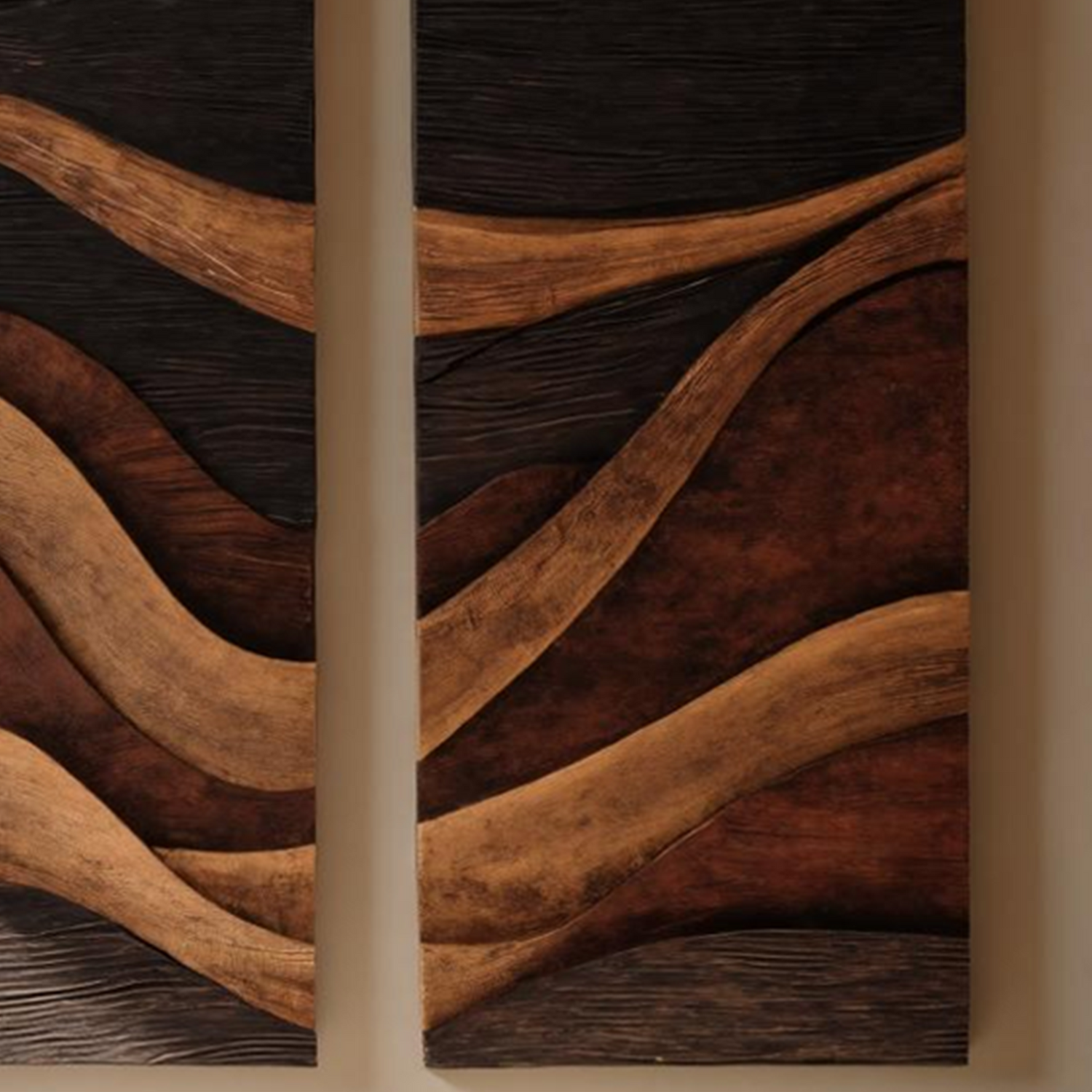 This wall-mounted sculpture blends fluid, organic contours with minimalist elegance. Hand-carved from solid hardwood, the rhythmic folds resemble ocean tides frozen in motion. The golden-toned wood grain is accentuated by deep charcoal edges, creating a striking interplay of warmth and contrast. Designed with a hidden mount, the piece floats seamlessly against your wall, enhancing its sculptural presence.