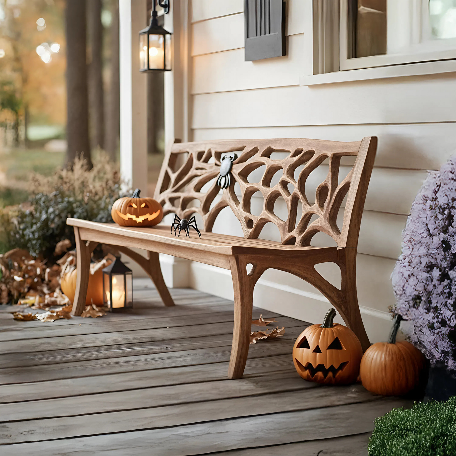 Celebrate the Halloween spirit with a bench that highlights the natural character of wood. Each piece features distinctive knots, live edges, and organic patterns, making your bench truly one of a kind. Its seasonal charm and artisanal details turn your porch or entryway into a warm, inviting space for fall celebrations.