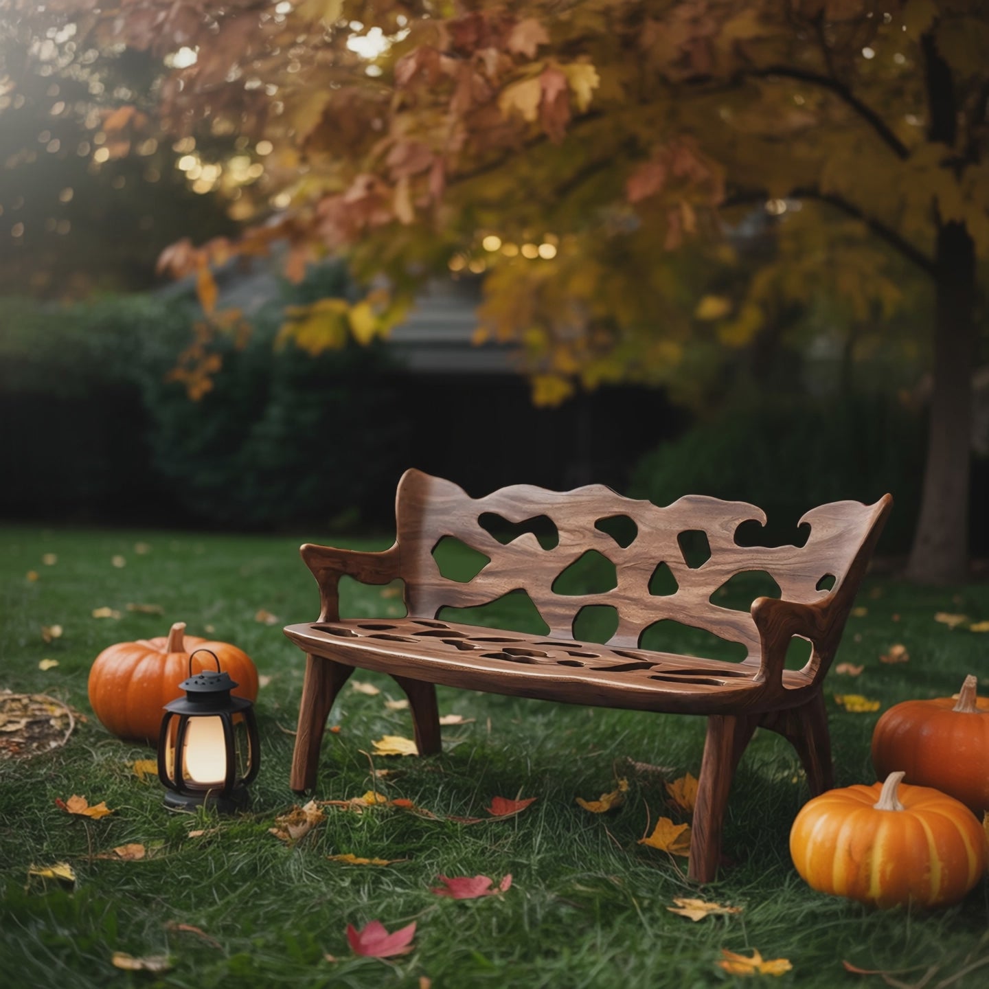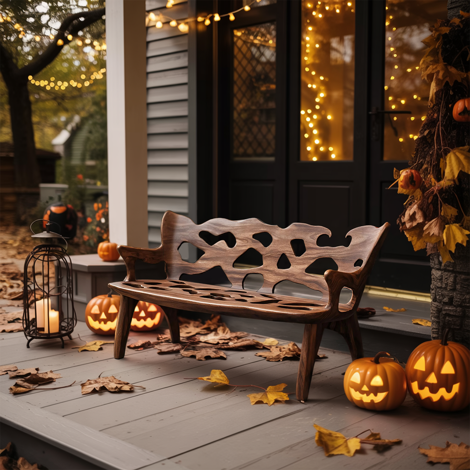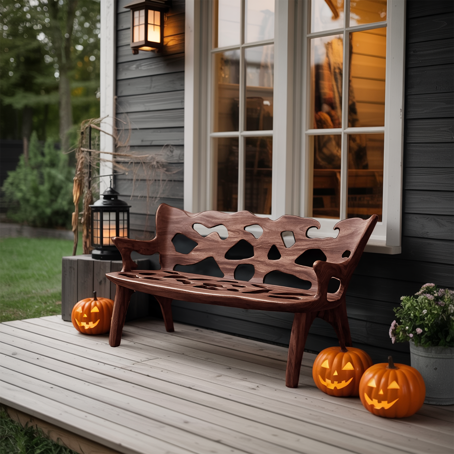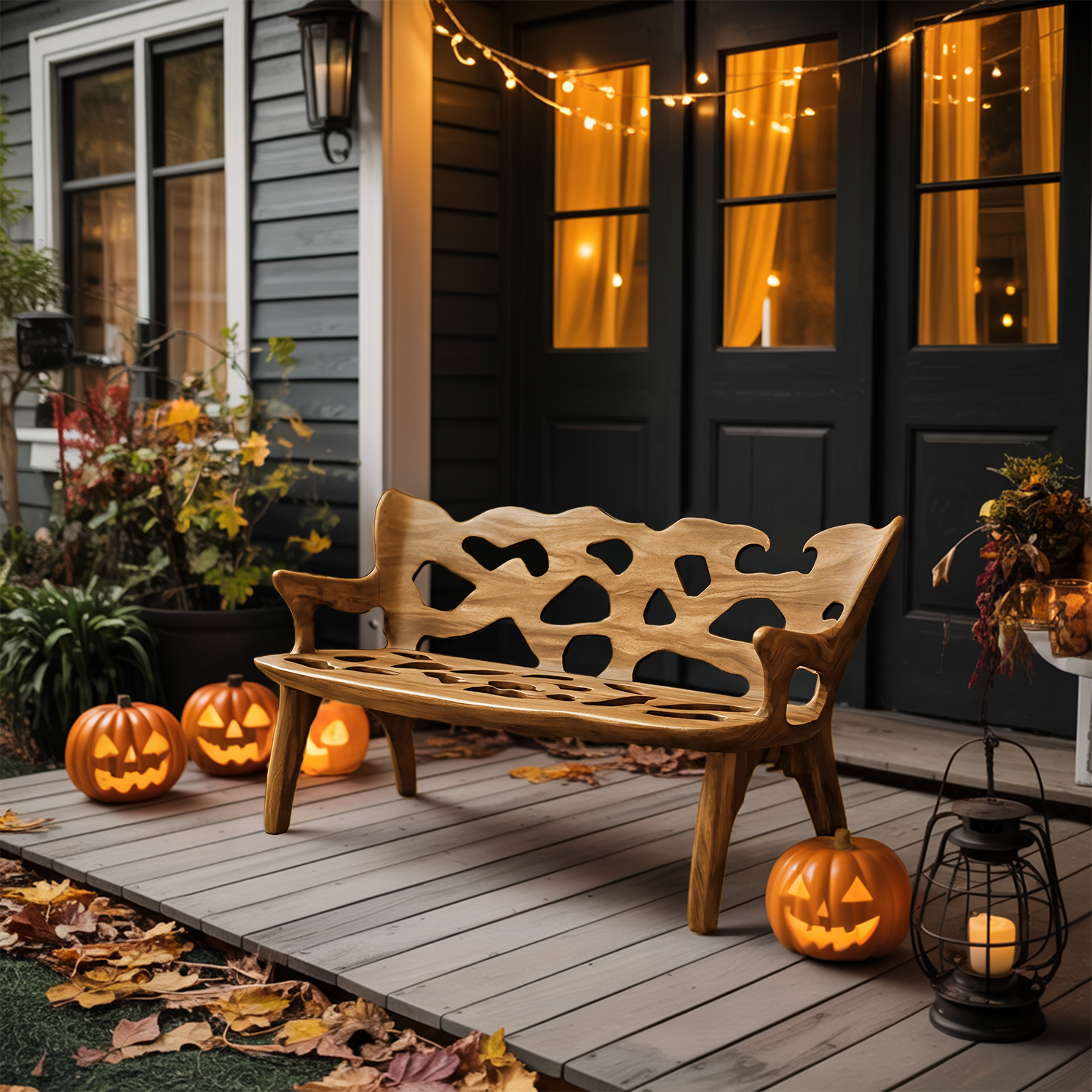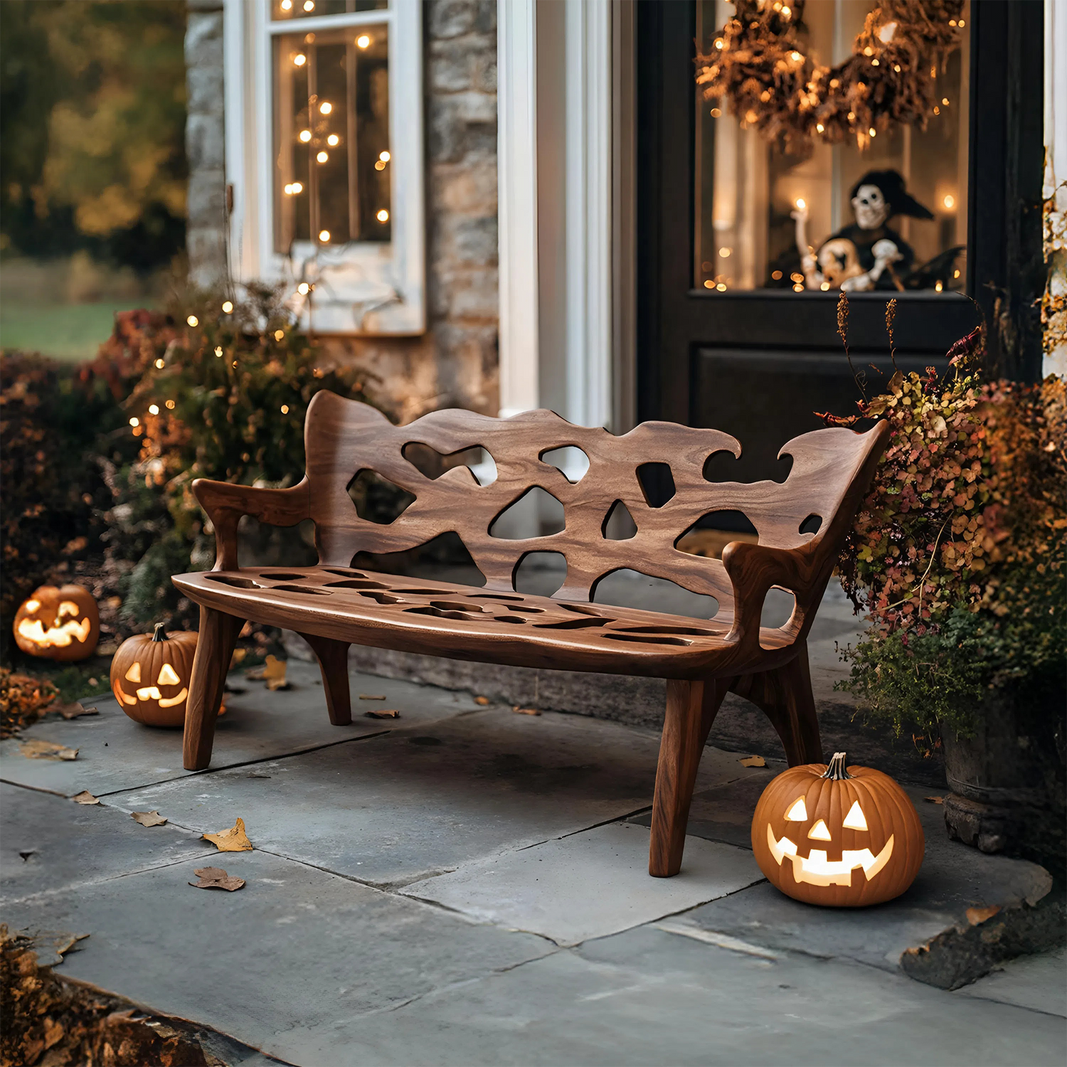 Celebrate the Halloween spirit with a bench that highlights the natural character of wood. Each piece features distinctive knots, live edges, and organic patterns, making your bench truly one of a kind. Its seasonal charm and artisanal details turn your porch or entryway into a warm, inviting space for fall celebrations.