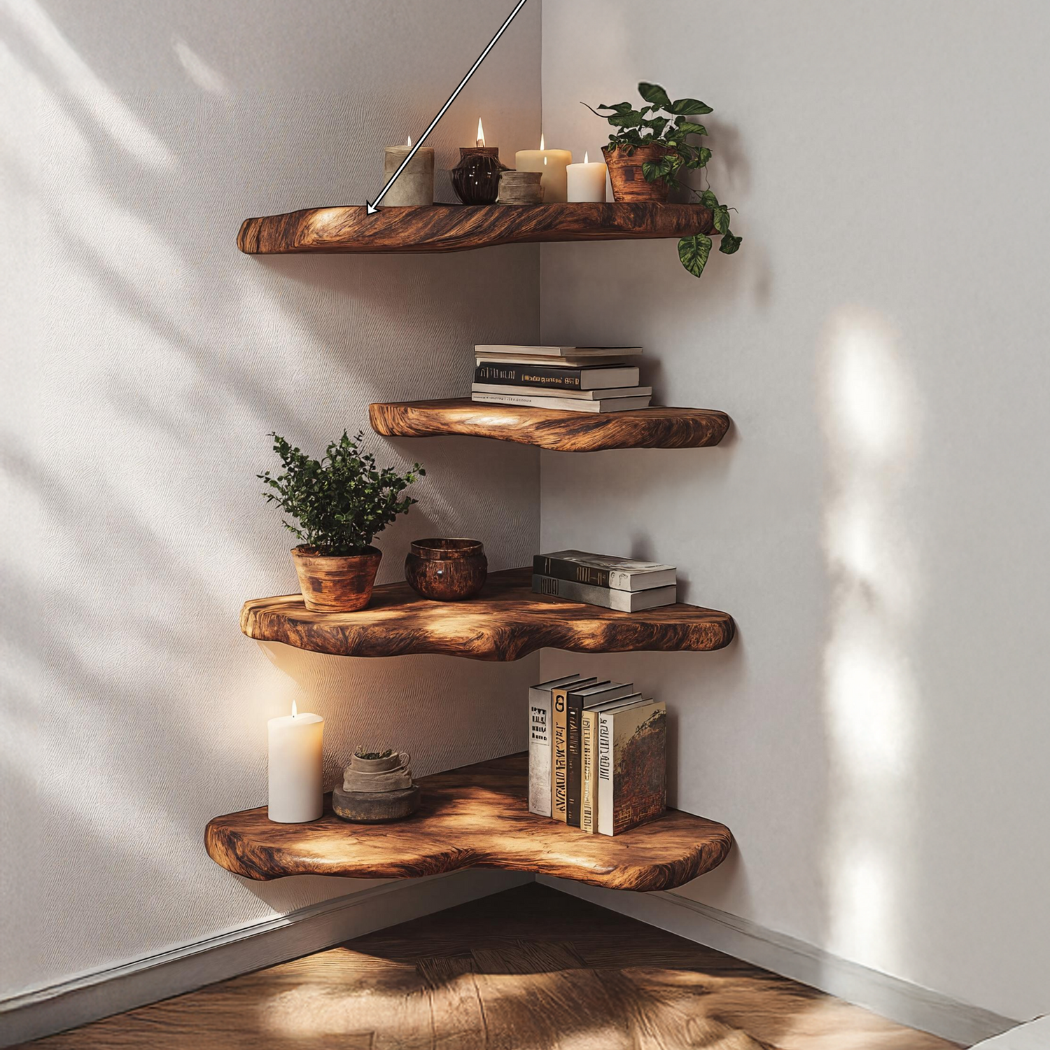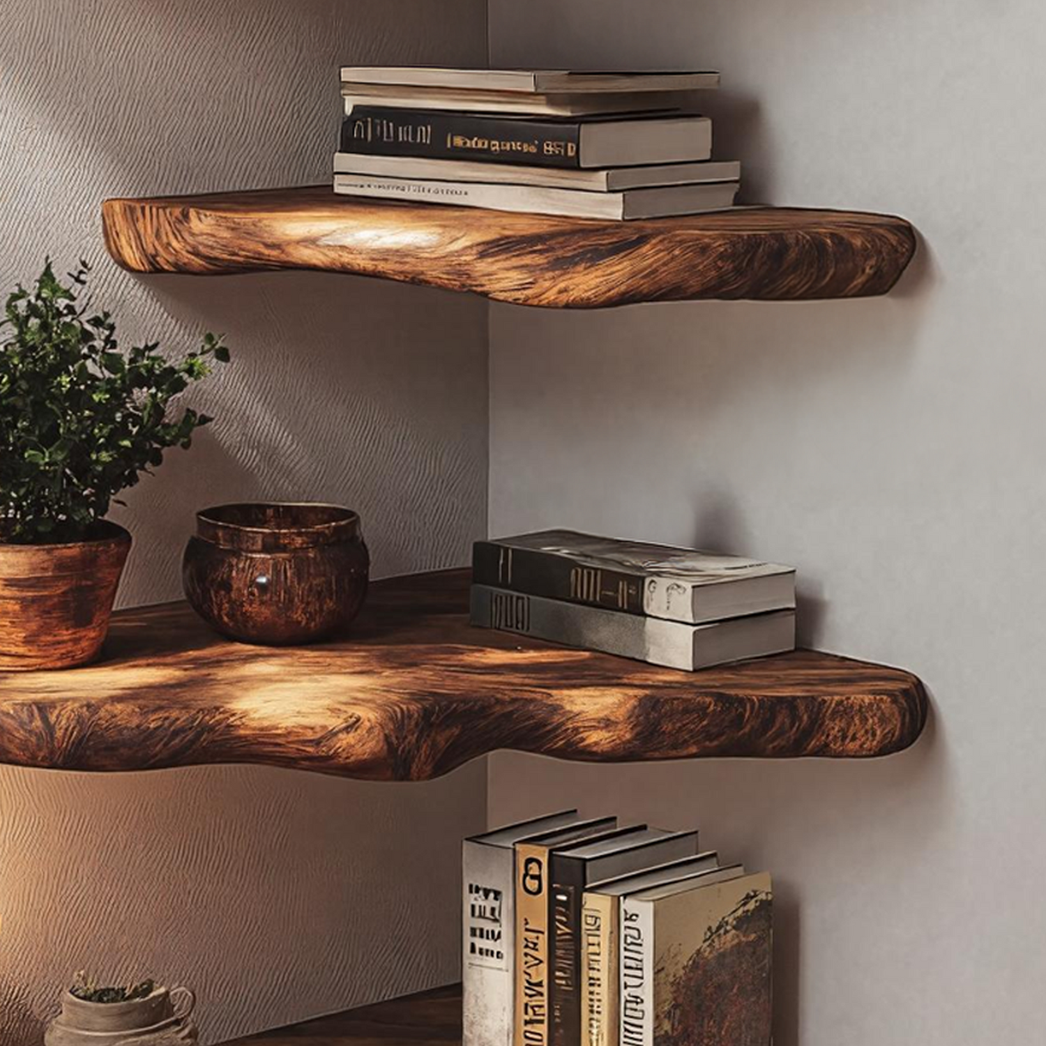 Created to bring subtle structure to unused corners, the Mid Century Wooden Live Edge Corner Shelf For Living Room Decor blends clean mid-century lines with the organic character of natural wood. It provides a simple yet intentional display surface, helping living spaces feel curated, open, and visually grounded.