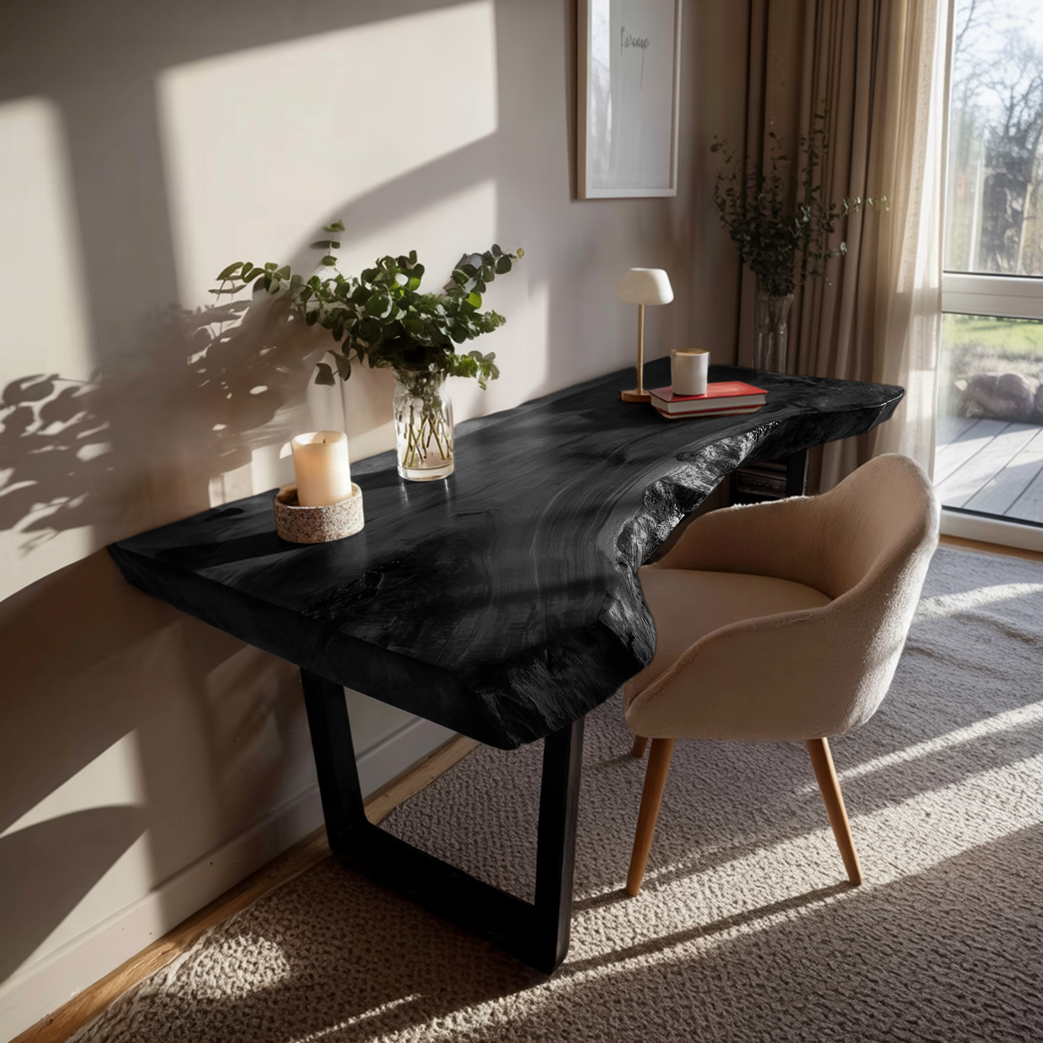 This desk is meticulously handcrafted from carefully selected solid monkey pod wood, showcasing flowing live edges, rich grain movement, and natural variations that make each piece one-of-a-kind. Designed with a timeless silhouette, it blends artisanal craftsmanship with enduring functionality, suitable for both contemporary and rustic-inspired spaces.