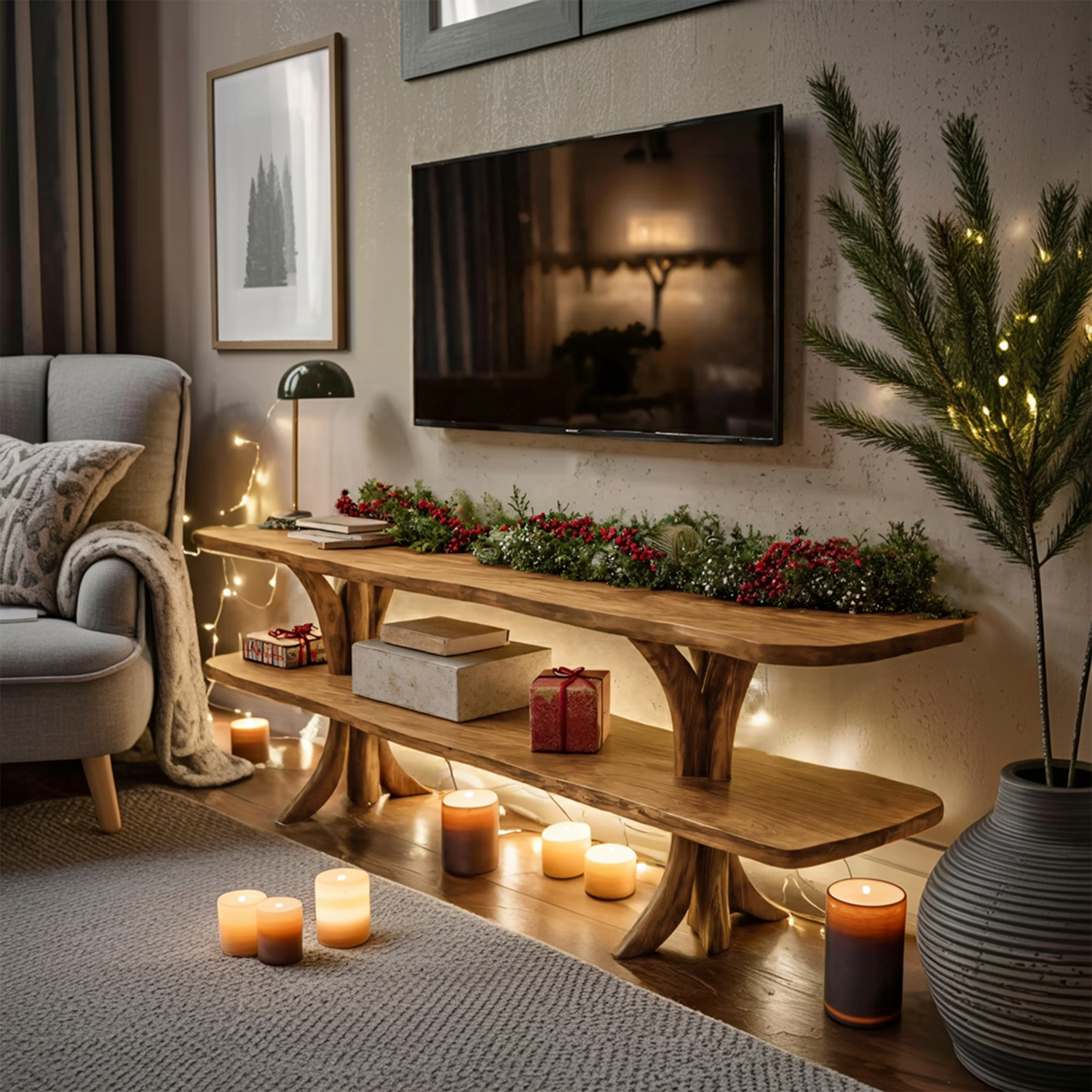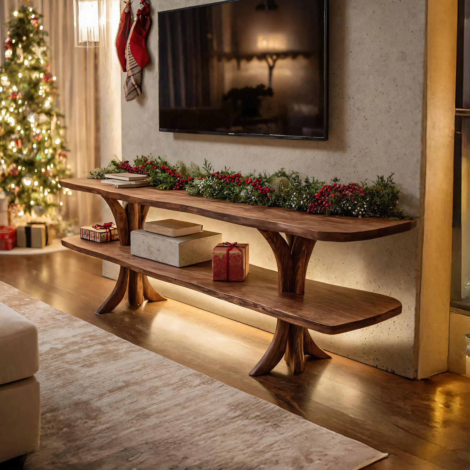 Bring timeless elegance and festive warmth to your home with the Mid Century Wooden Live Edge TV Console For Christmas Living Room Decor. Handcrafted from solid wood, it features sleek mid-century lines paired with a natural live edge that showcases the beauty of authentic craftsmanship. Designed to balance functionality and style, this console provides ample space for media, décor, and seasonal accents — creating a cozy and sophisticated centerpiece for your living room during the holidays and beyond.