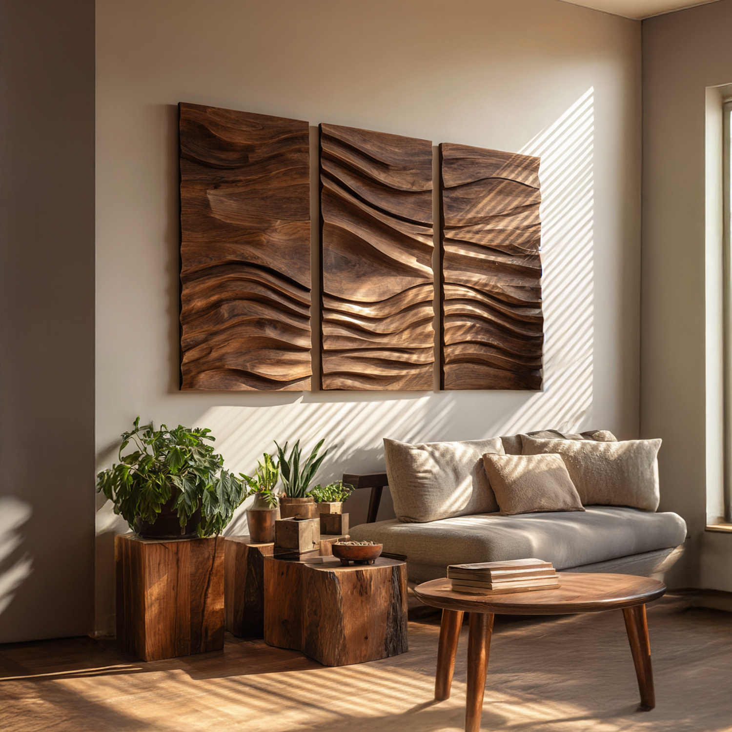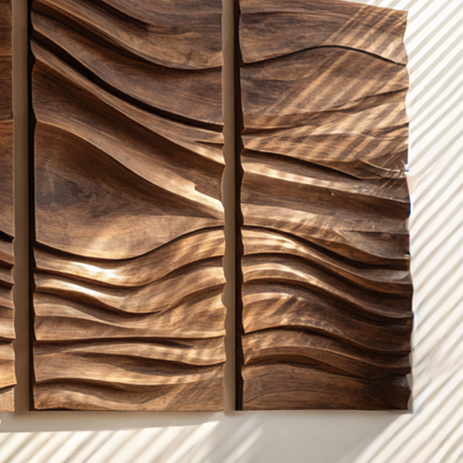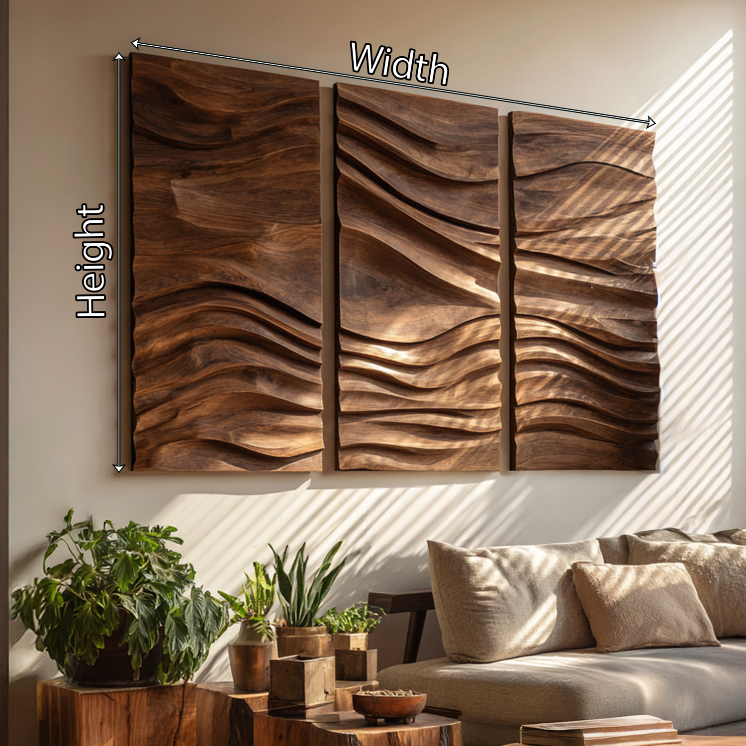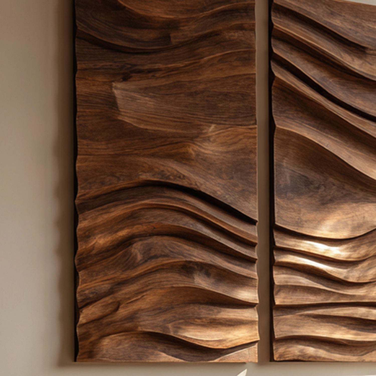 This wall-mounted sculpture blends fluid, organic contours with minimalist elegance. Hand-carved from solid hardwood, the rhythmic folds resemble ocean tides frozen in motion. The golden-toned wood grain is accentuated by deep charcoal edges, creating a striking interplay of warmth and contrast. Designed with a hidden mount, the piece floats seamlessly against your wall, enhancing its sculptural presence.