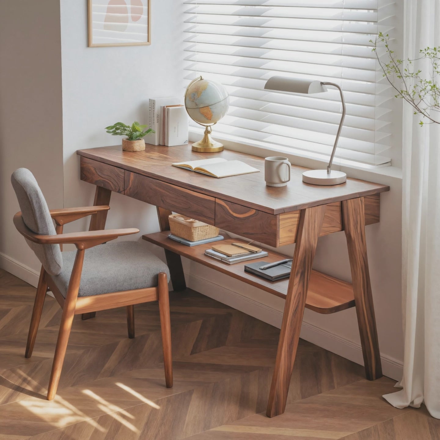Bring understated elegance and practical storage to your workspace with our Mid Century Wooden Writing Desk With Drawers And Shelf For Home Office, thoughtfully designed to create a balanced blend of style and functionality. Its warm tones and streamlined form make it an inviting focal point in any room.