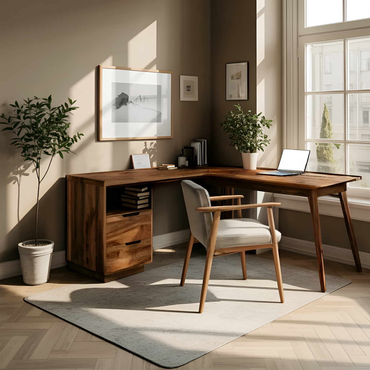 This L-shaped desk features a simple, refined silhouette with a streamlined tabletop and balanced leg structure. The corner layout maximizes usable space without overwhelming the room, while built-in drawers and open shelving provide convenient storage for books, work items, or personal essentials. Its unobtrusive design fits naturally into bright home offices, bedrooms, or compact study areas.