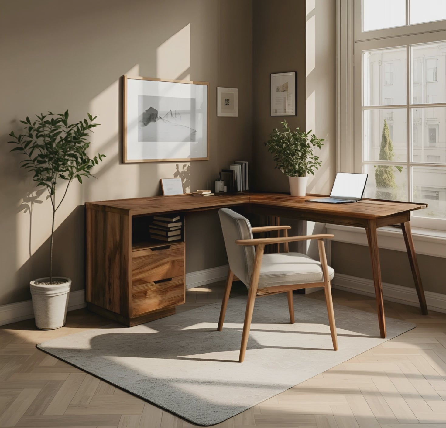 Create a calm and efficient work environment with the Minimal L Shaped Desk For Home Workspace, designed to offer clarity, comfort, and ample surface area. Its clean geometry, slim legs, and open corner layout bring a sense of lightness while supporting everyday tasks, whether reading, writing, or working on a laptop.