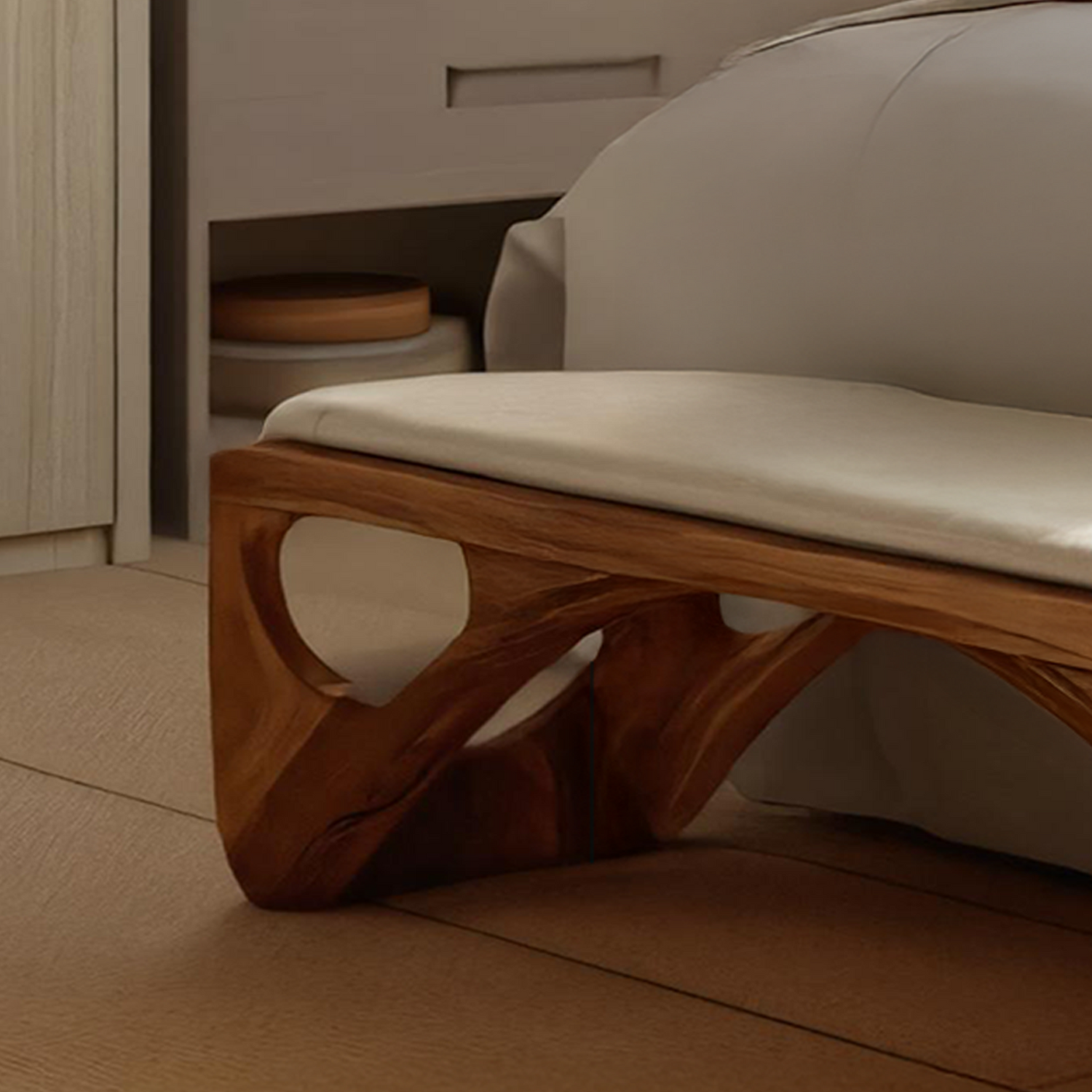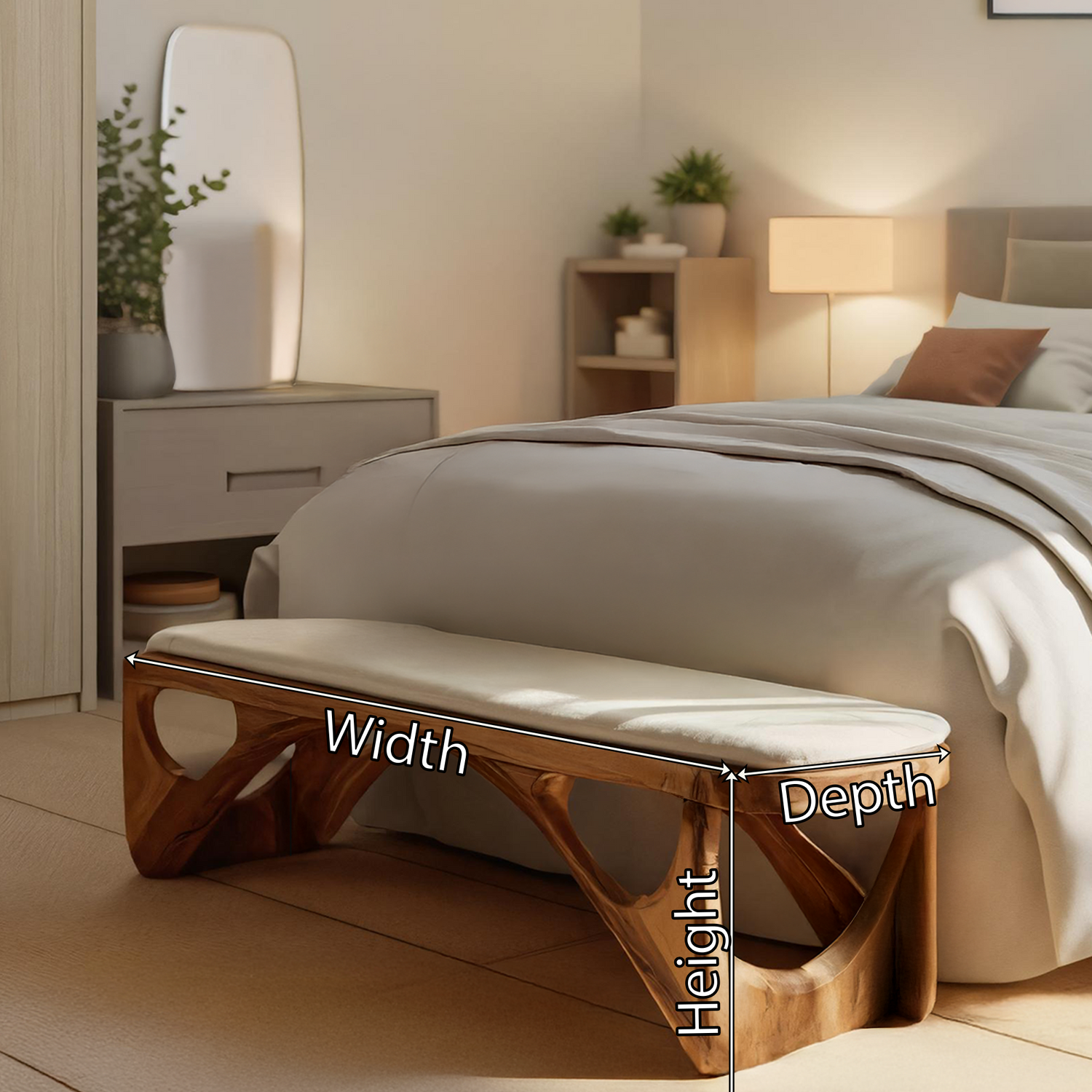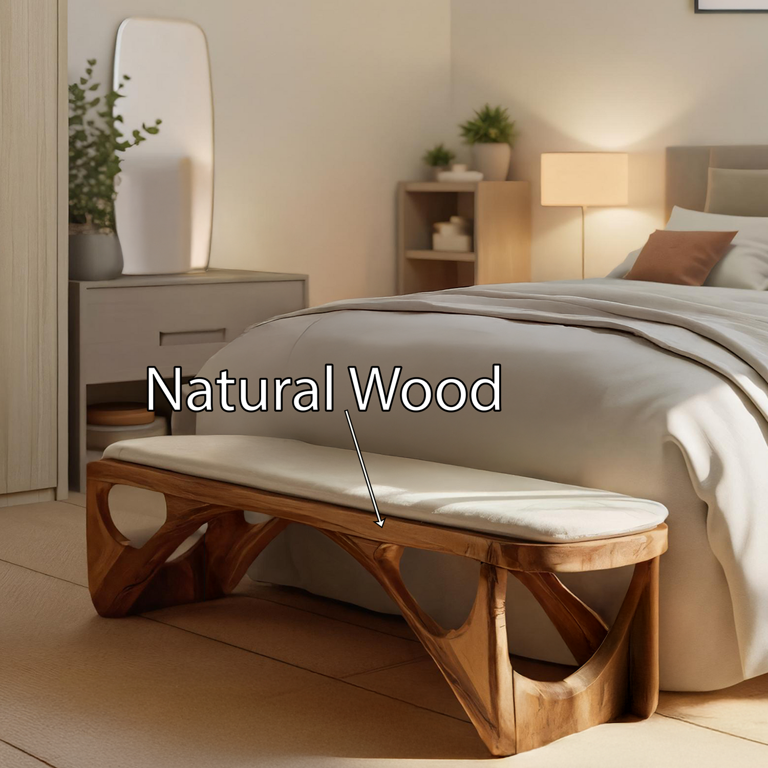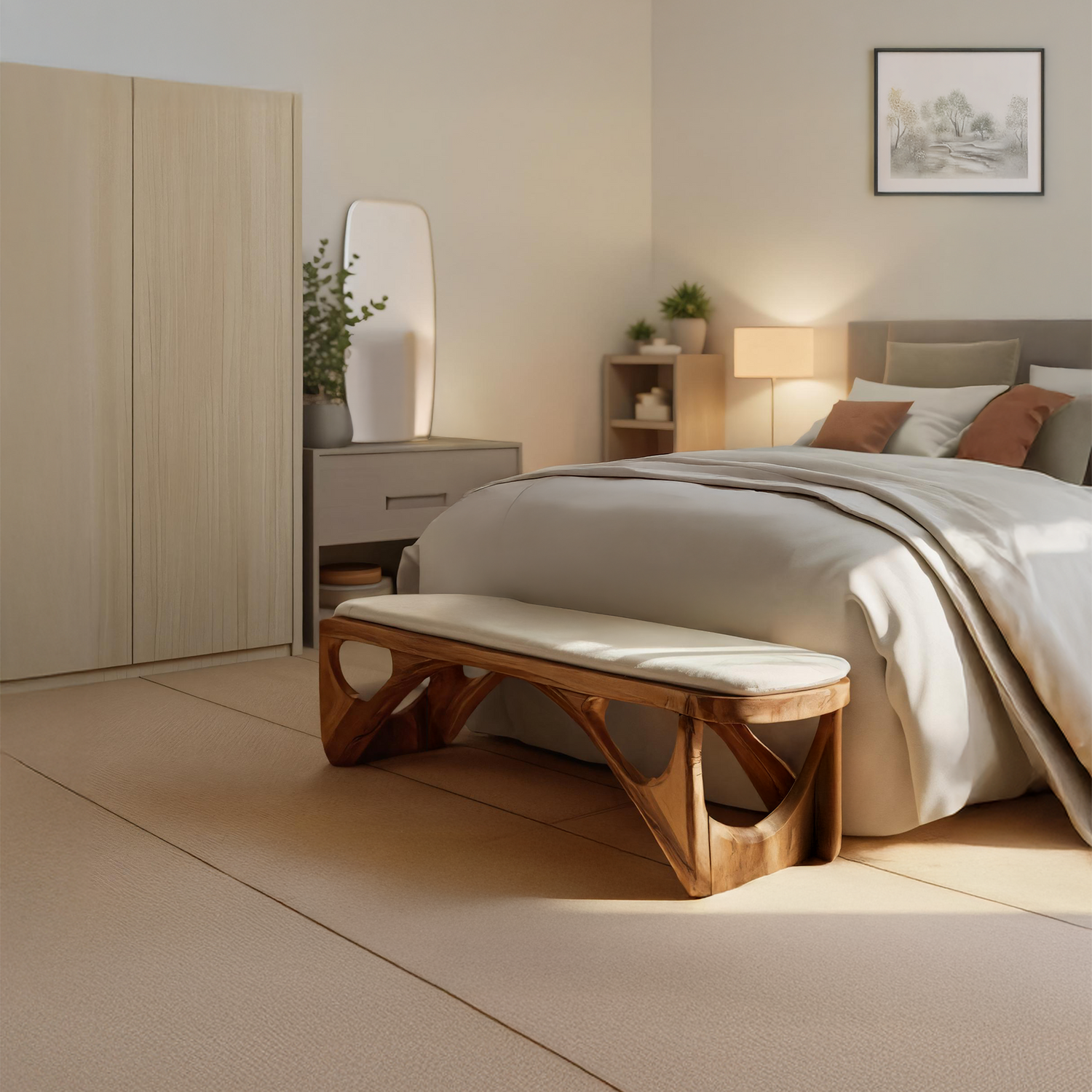 Minimalist Curved Wood Bench For End-of-Bed Design introduces a soft, contemporary accent to calm bedroom interiors. Crafted from solid wood and defined by gentle curves and balanced proportions, this bench offers functional seating while maintaining a light, uncluttered presence. Its refined form sits naturally at the end of the bed, adding warmth and subtle movement without disrupting the overall simplicity of the space.