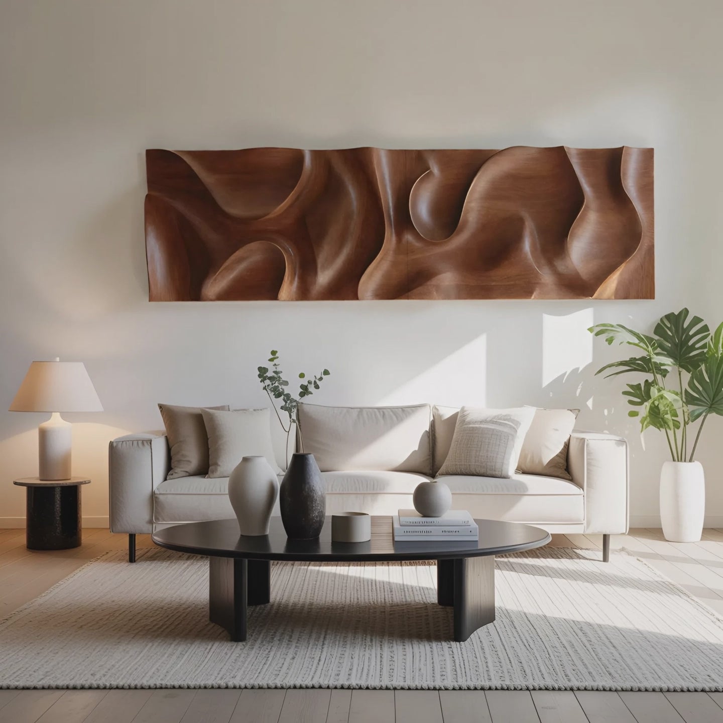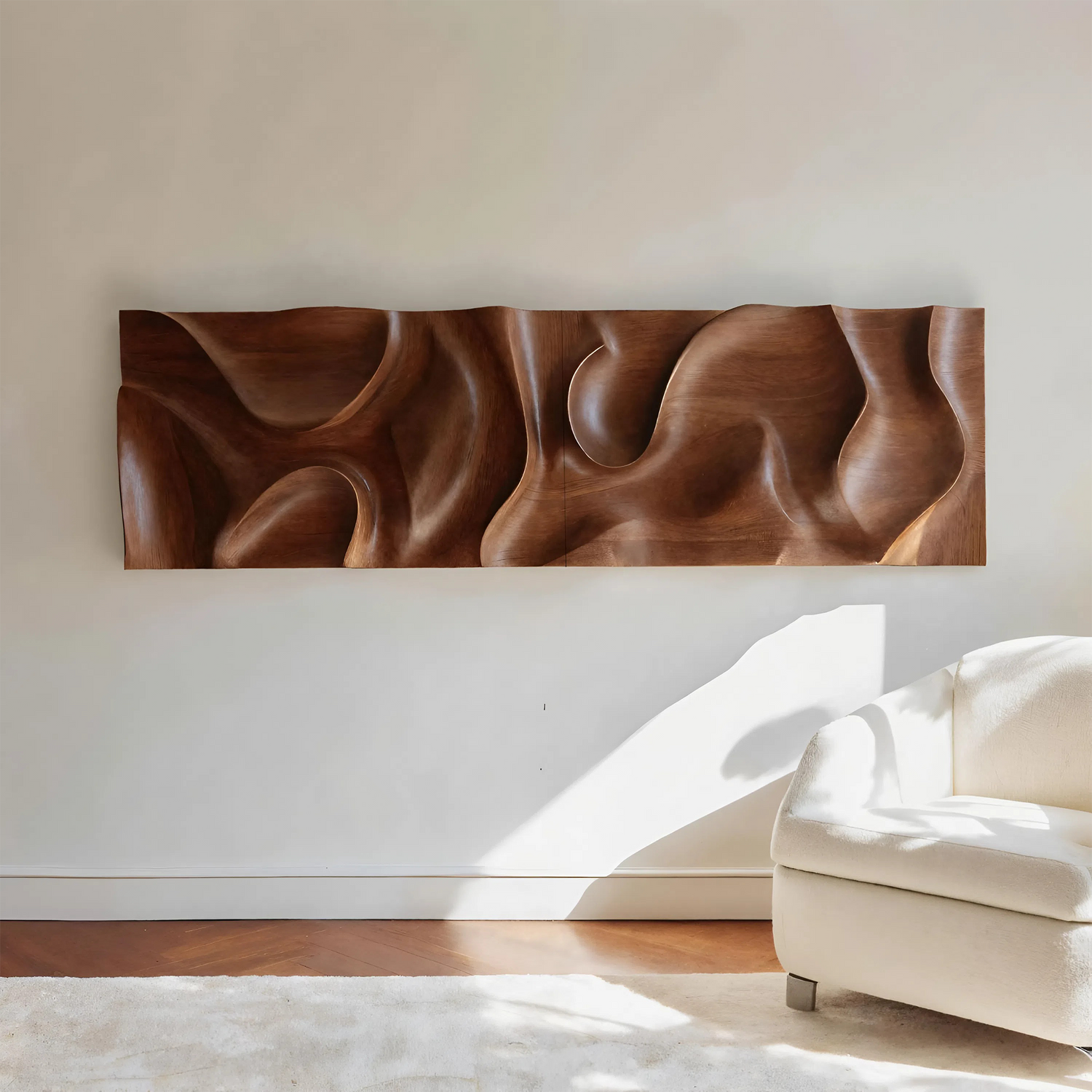This wall art piece features a continuous 3D carved surface shaped by gentle curves and smooth transitions. The natural flow of the contours creates a subtle interplay of light and shadow, giving the artwork a calm yet expressive presence. Its wide horizontal format makes it ideal for anchoring large wall areas while maintaining a clean, minimal look.