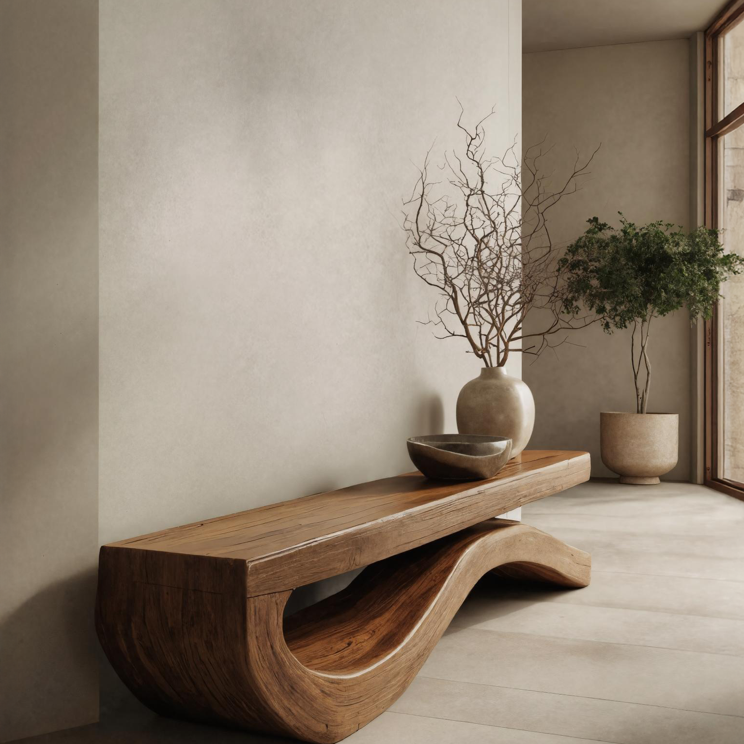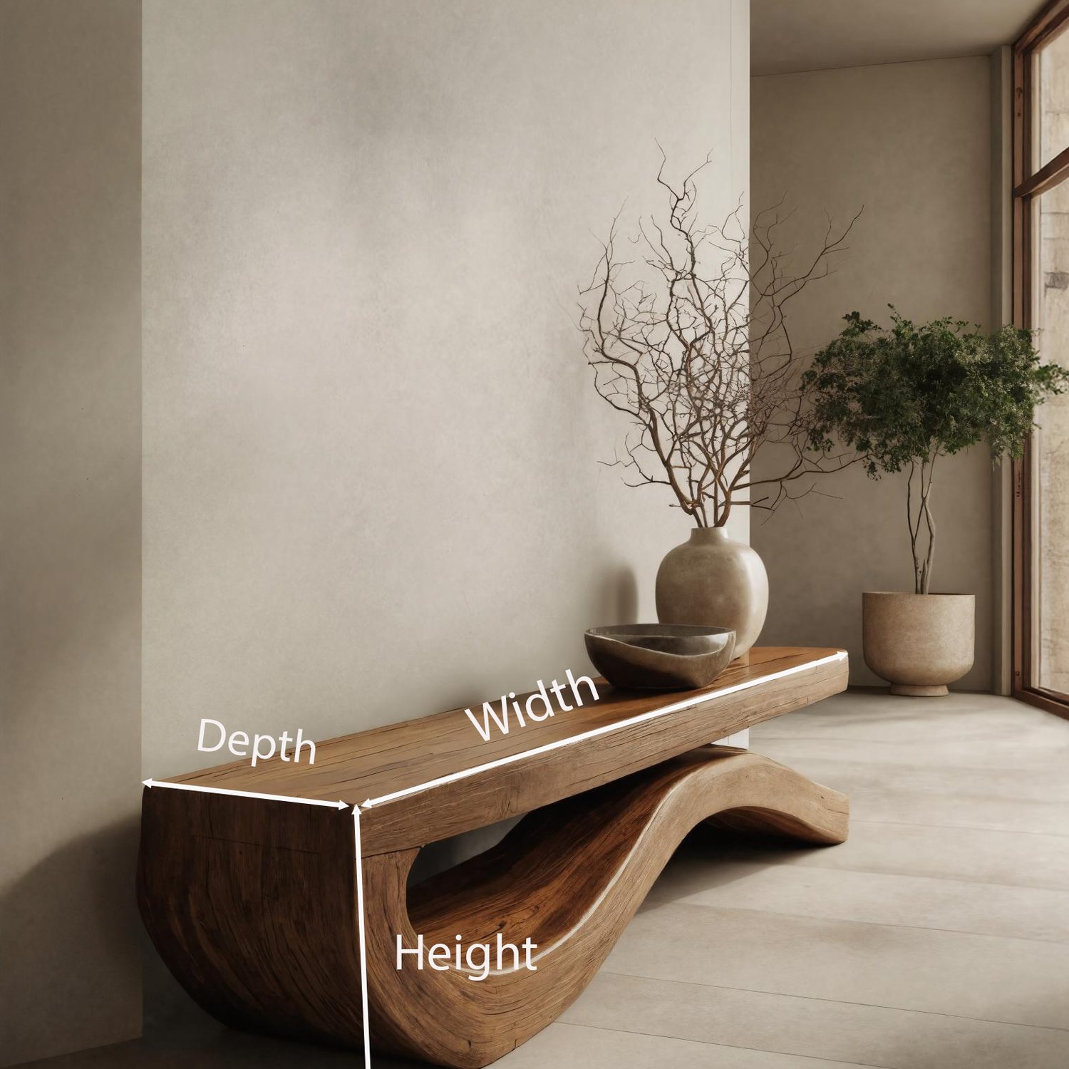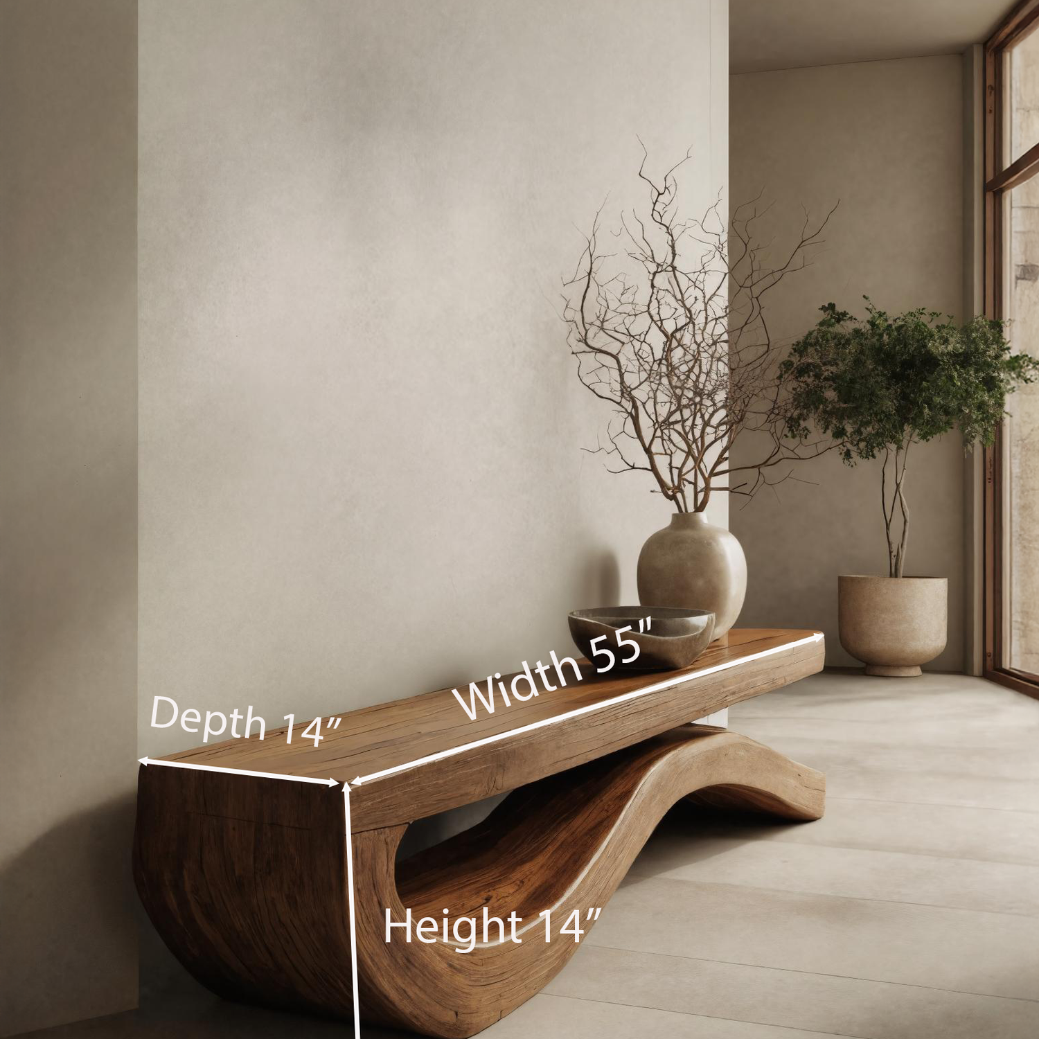This bench features a flowing curved base that merges strength with artistry, emphasizing balance and organic form. Crafted from solid wood, it highlights natural grain variations while maintaining a sleek silhouette. Perfect for modern interiors, it functions as seating, display, or a focal point that elevates your entryway or living space.