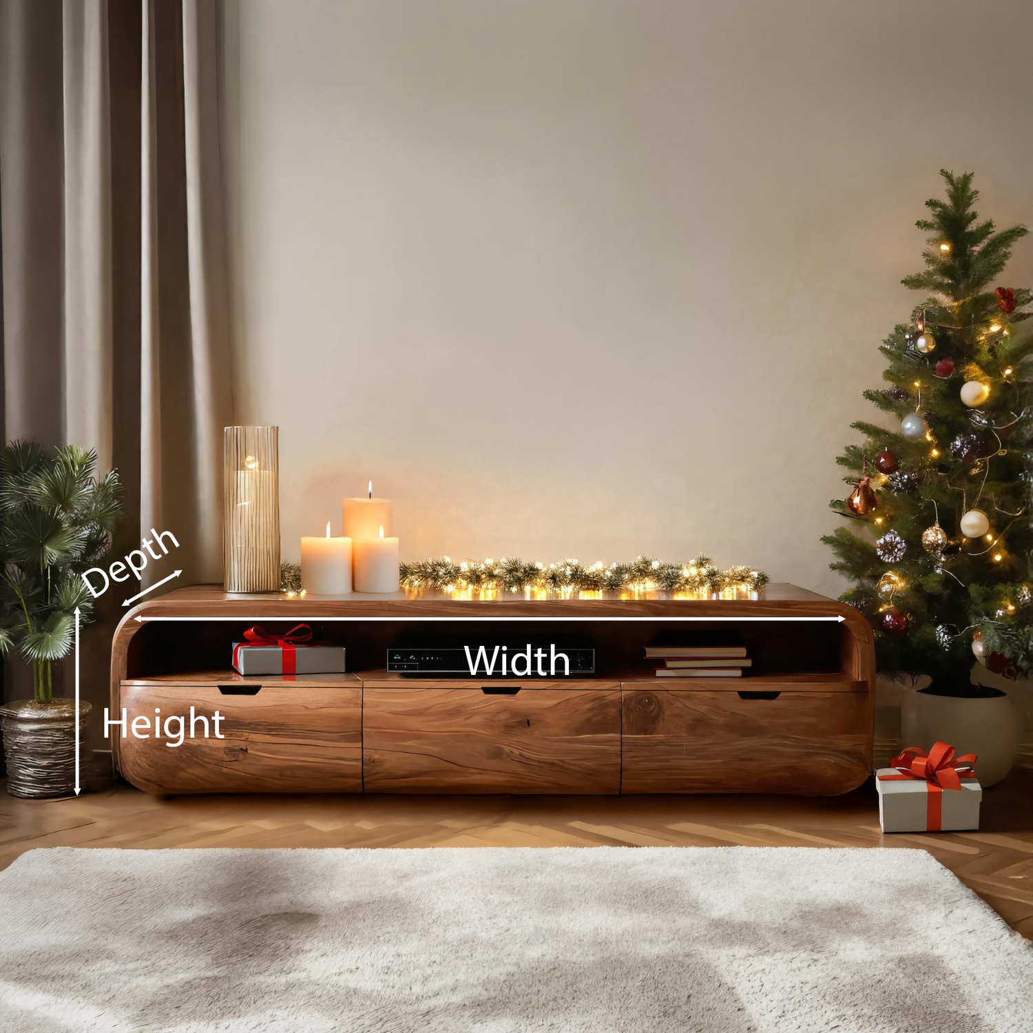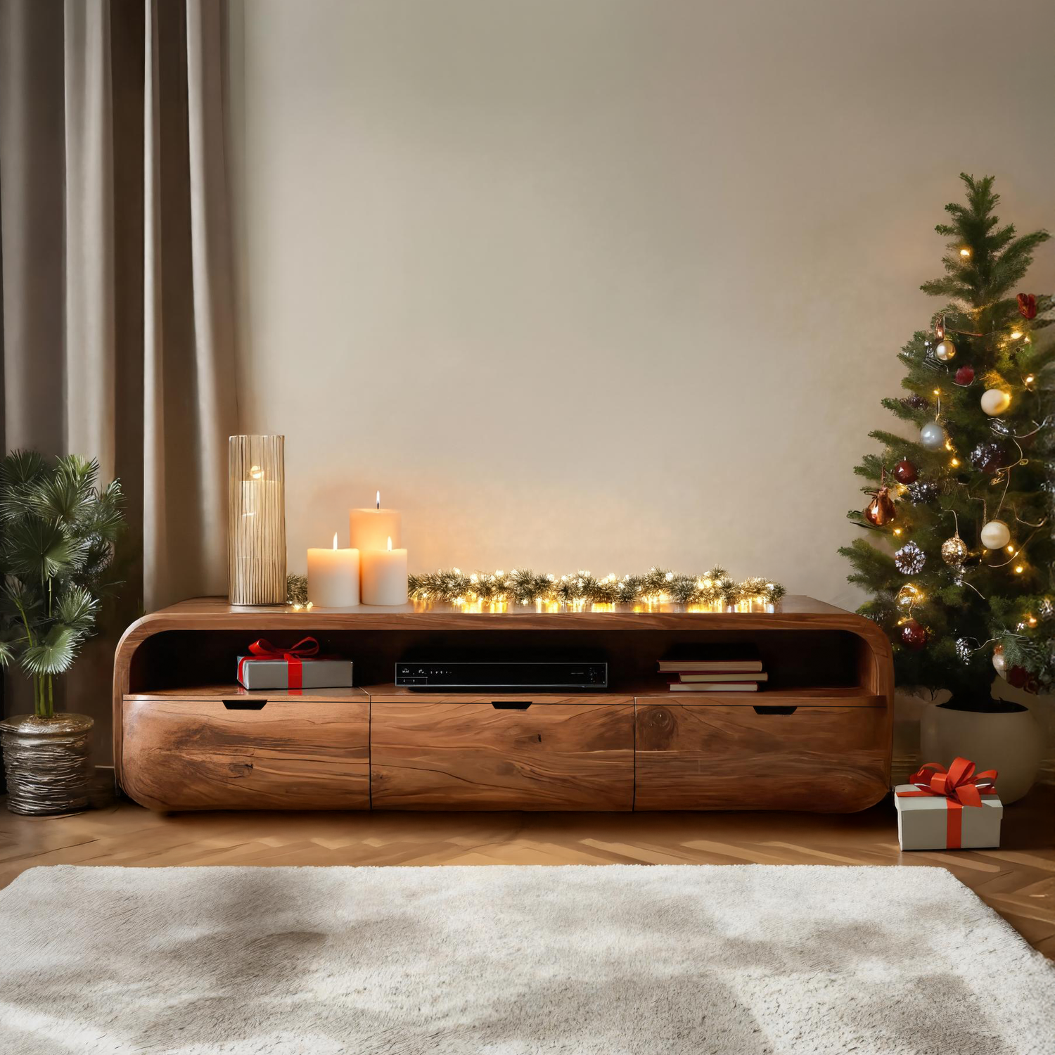 Bring elegance and festive warmth into your living space with the Modern Curved SideBoard For Holiday Decoration, a refined centerpiece that merges sculptural beauty with practical design. Its smooth, rounded contours and rich wooden tones create a cozy yet contemporary ambiance — the perfect backdrop for candles, garlands, and seasonal accents.