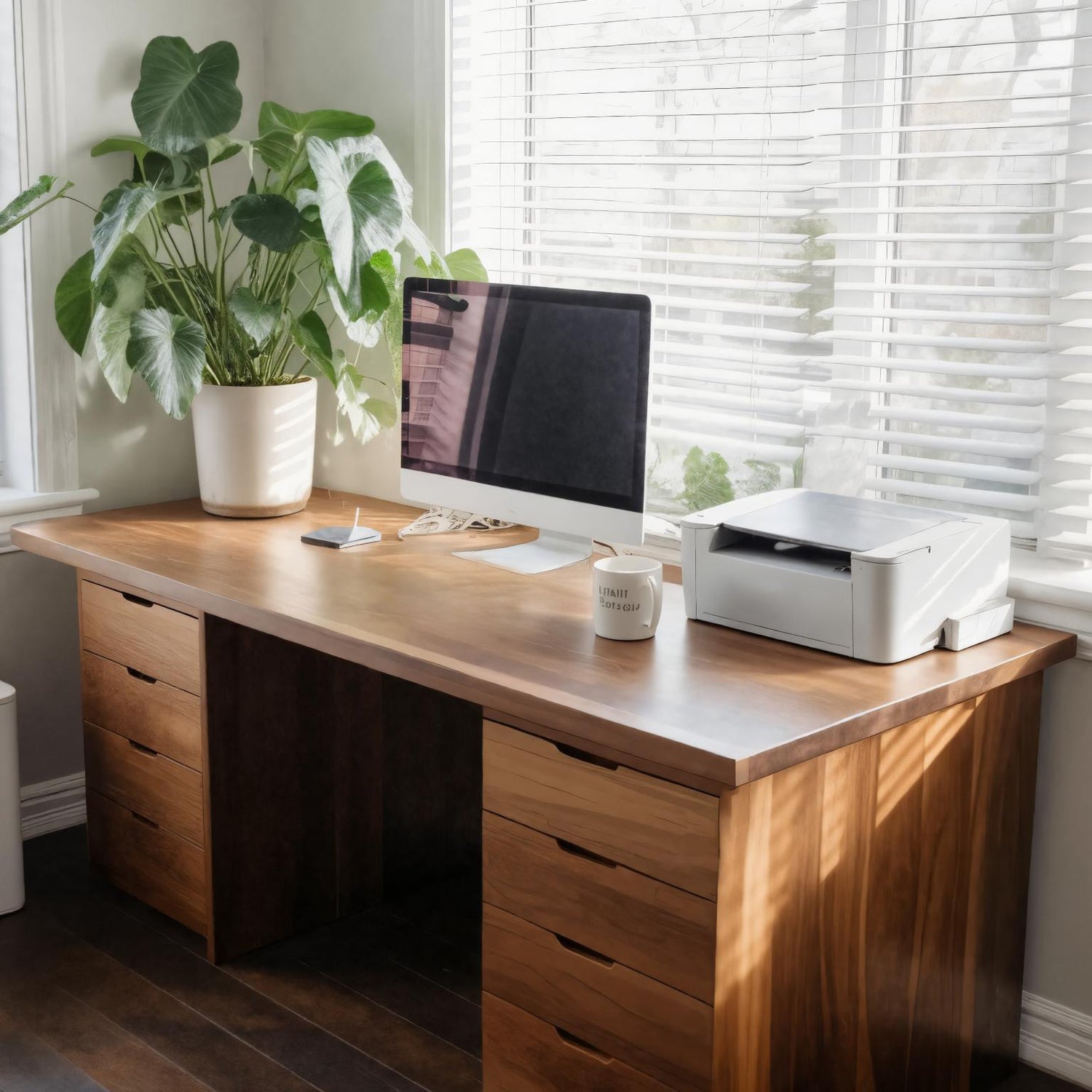 This desk features a broad surface with sleek, integrated drawers on both sides, making it ideal for anyone who values both function and aesthetic appeal in a home office setting.