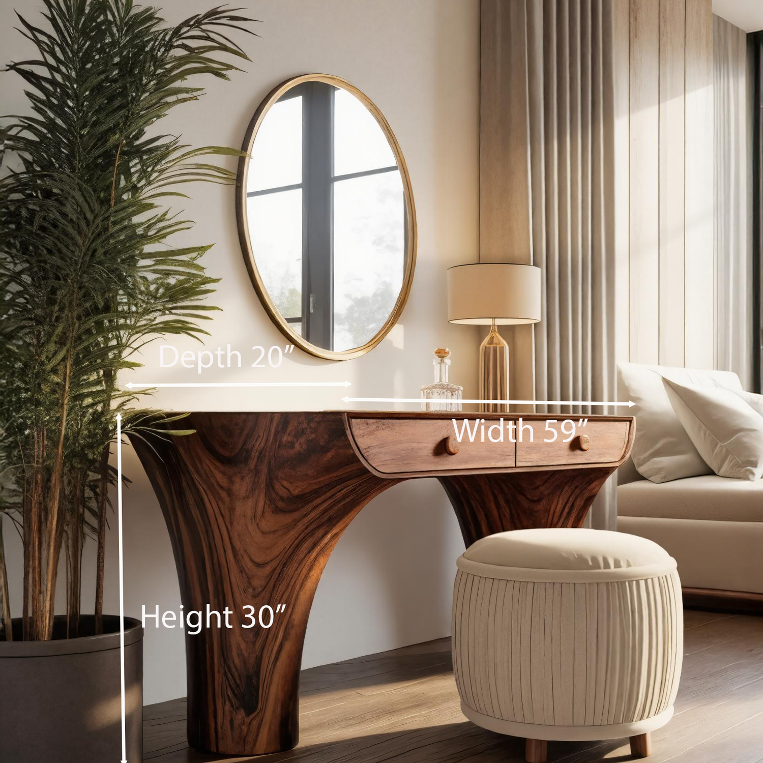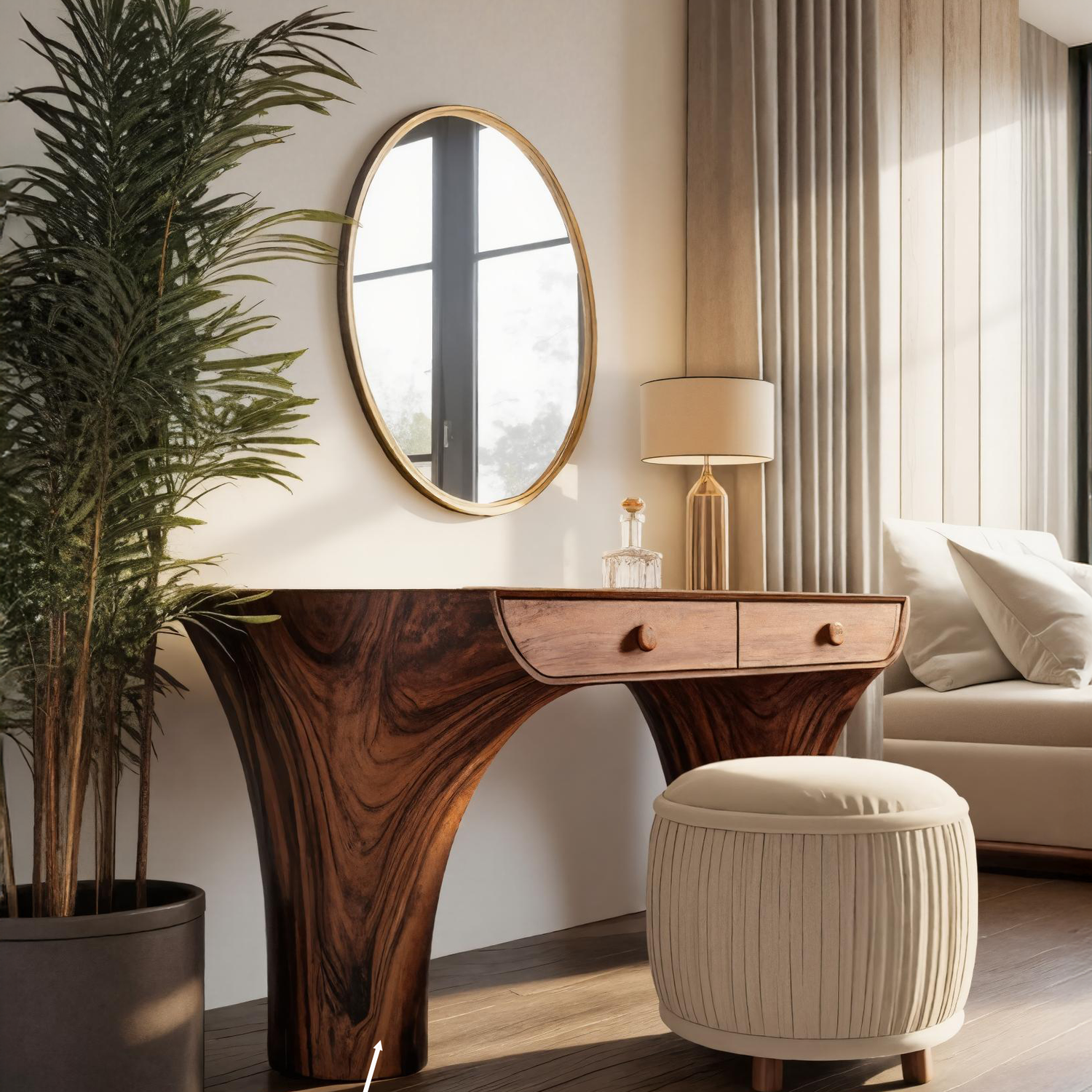 This vanity desk features a distinctive arched base that flows seamlessly into a gracefully curved tabletop, creating a sculptural form that captures the organic rhythm of nature. Two integrated drawers provide space for daily essentials while maintaining a clean, minimalist profile. Its refined silhouette and handcrafted character make it a striking yet functional addition to modern bedroom interiors.