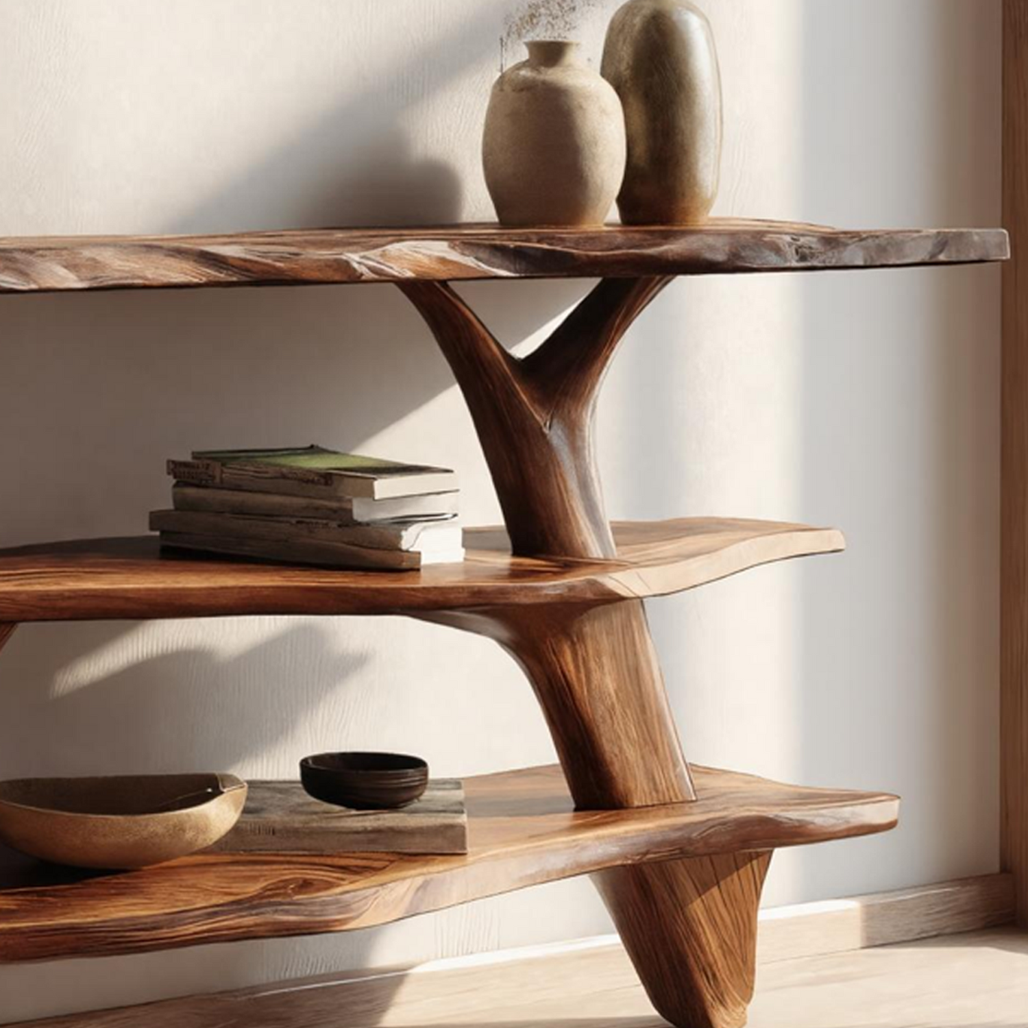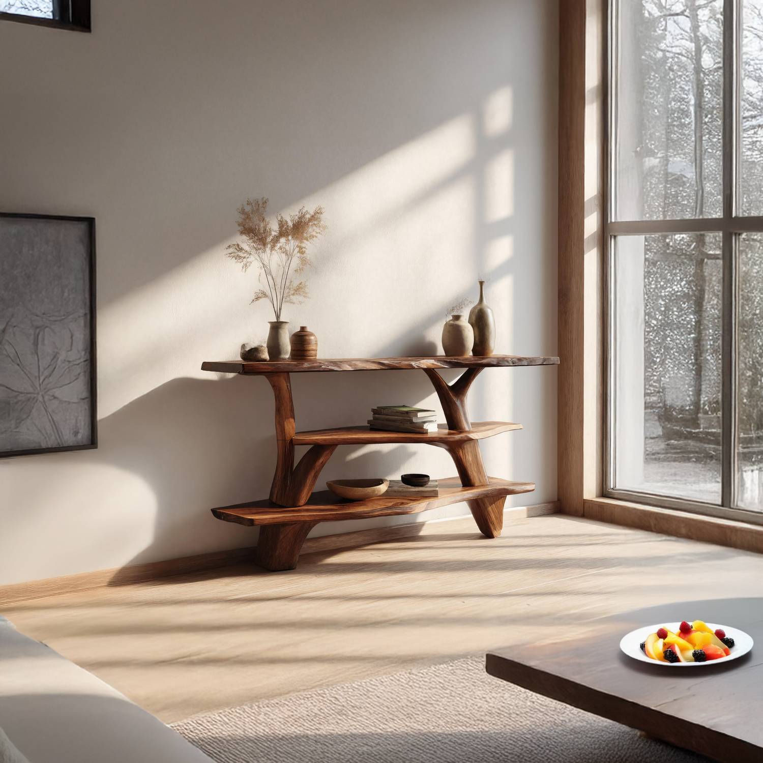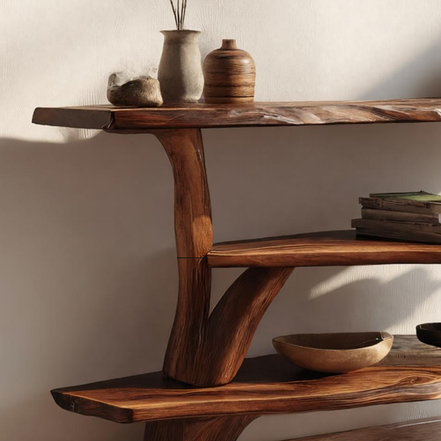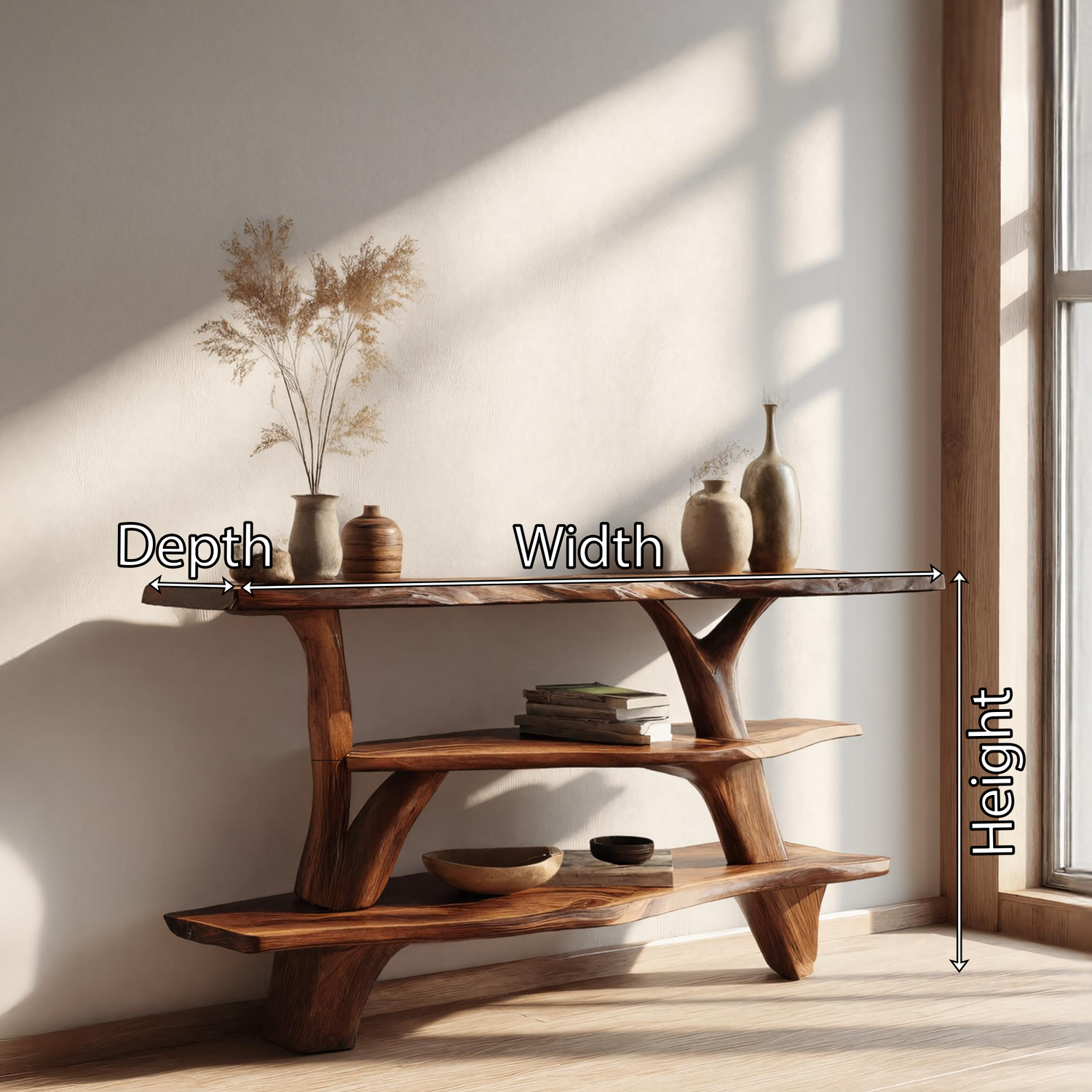 Each console table is unique, showcasing the natural beauty of solid wood through its organic grain, textures, and subtle imperfections. Every edge retains the lively character of the wood, ensuring no two pieces are ever the same. Finished with care, the surface highlights the wood’s depth and warmth—creating a centerpiece that combines practicality with understated sophistication.