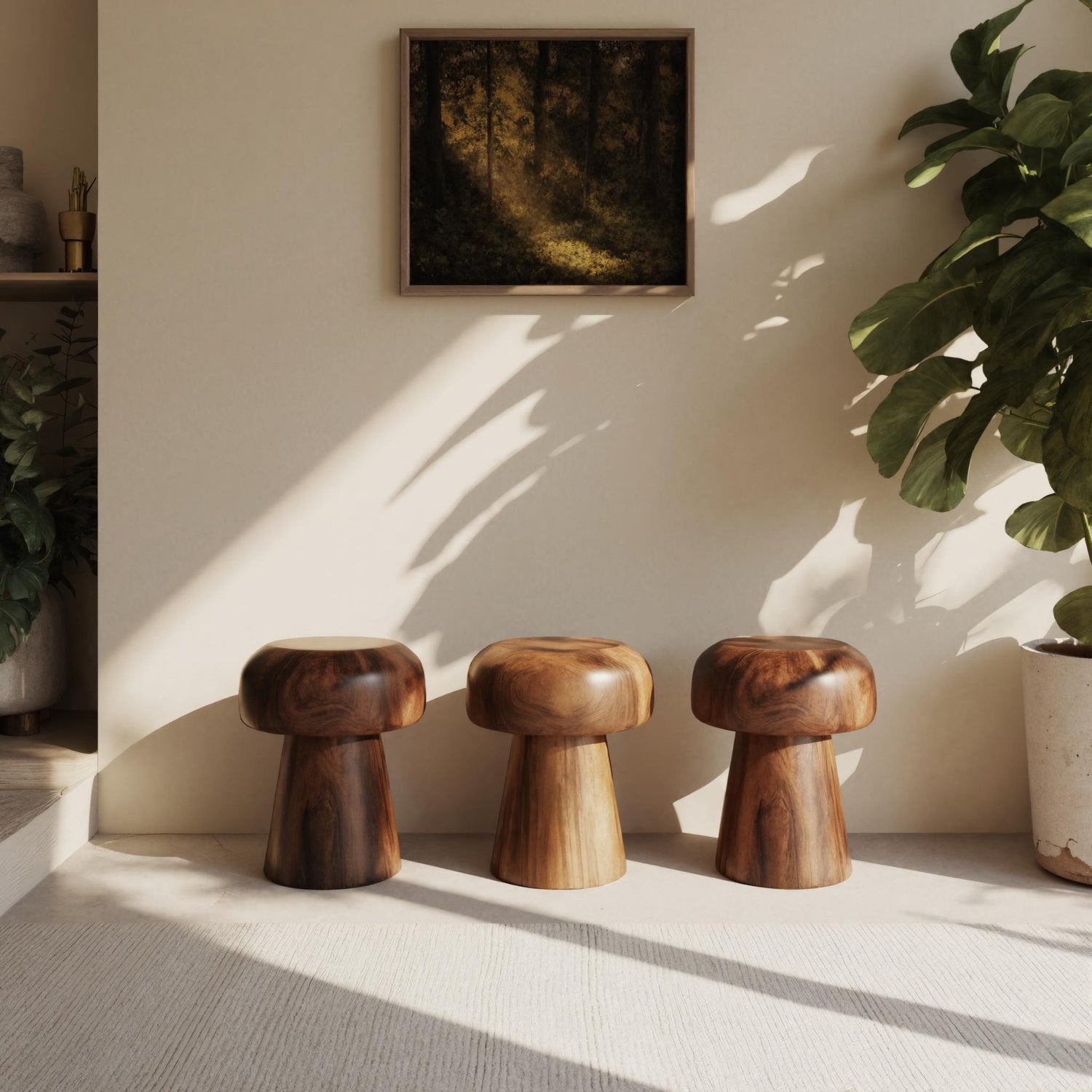 These mushroom-inspired stools feature smooth, curved forms that highlight the beauty of natural grain while adding a whimsical, modern character. Their compact size makes them ideal for use as side tables, occasional seating, or accent furniture in both intimate and open interiors.