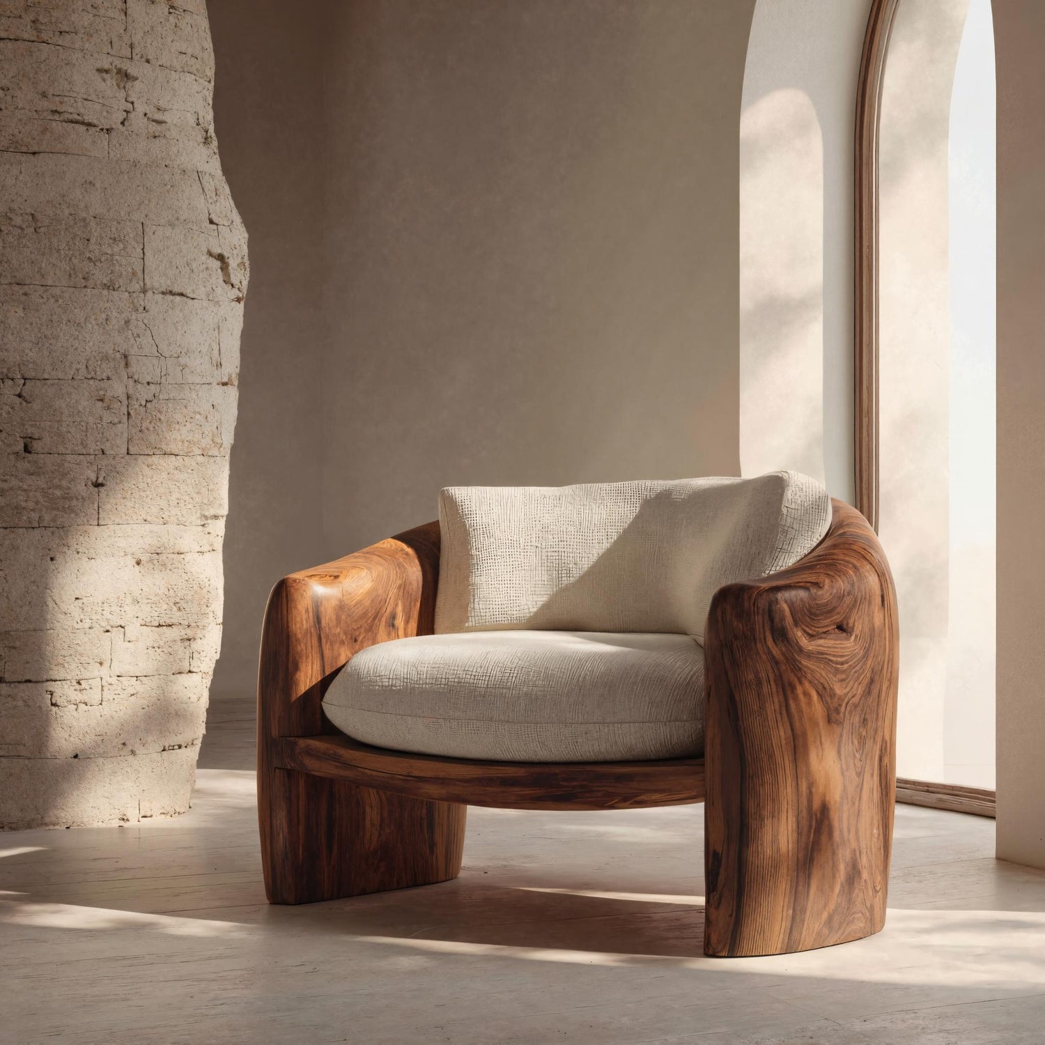 A sculptural seating piece shaped by organic curves and grounded proportions, Modern Organic Lounge Chair Sculptural Form For Living Room, created to introduce softness, warmth, and visual balance into contemporary living spaces. With its solid wooden frame and gently contoured cushions, this lounge chair offers a calm presence that blends function with sculptural expression. The rounded arm structure and low-profile form create a sense of enclosure while maintaining openness and flow. Natural wood grain remains fully visible across the frame, allowing light to interact with the surface and highlight subtle movement within the material.