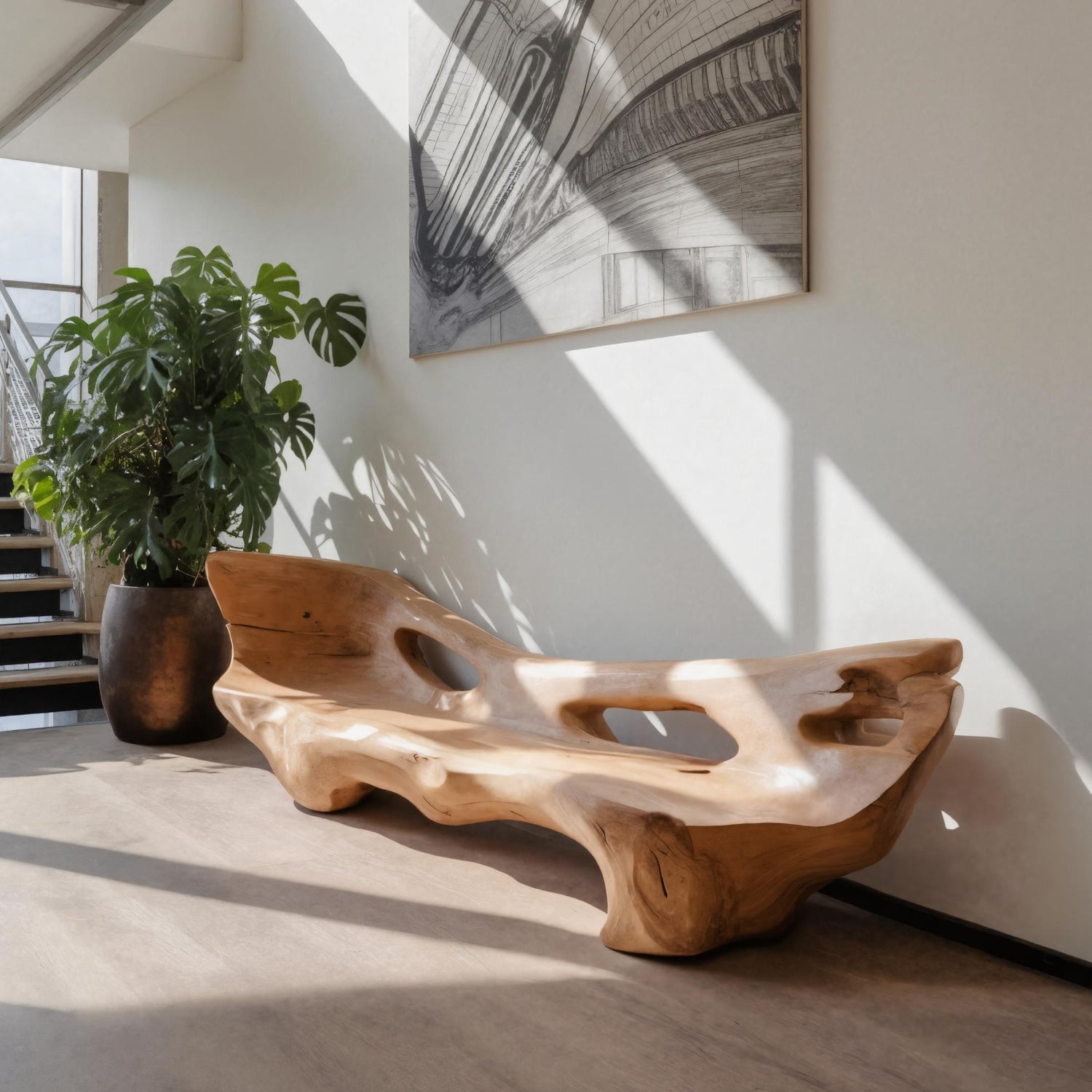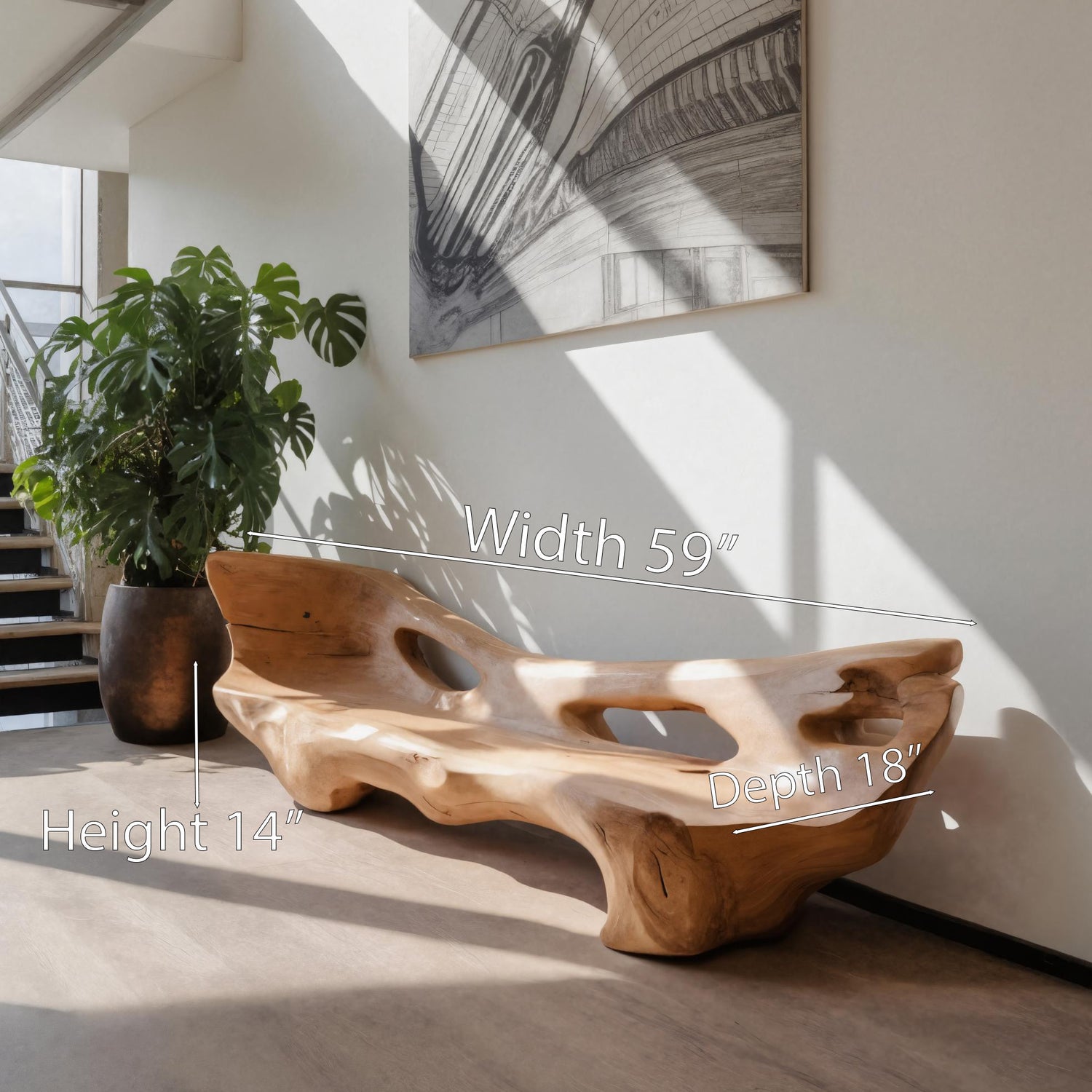 This sculptural bench showcases fluid lines and organic cut-outs, emphasizing the beauty of form and negative space. Its contemporary silhouette makes it a striking addition to living rooms, entryways, and open interiors, where it naturally becomes the focal point while still serving as functional seating.