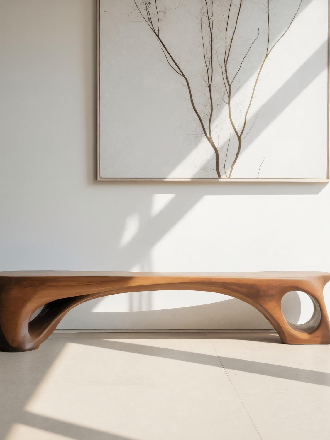 This bench is defined by its bold, curved profile and hollowed details that highlight the play of light and shadow. The organic flow of the frame emphasizes balance and movement, while the wide surface provides functionality as seating or display. Designed to stand out, it brings a refined sense of artistry to contemporary living rooms and open interiors.