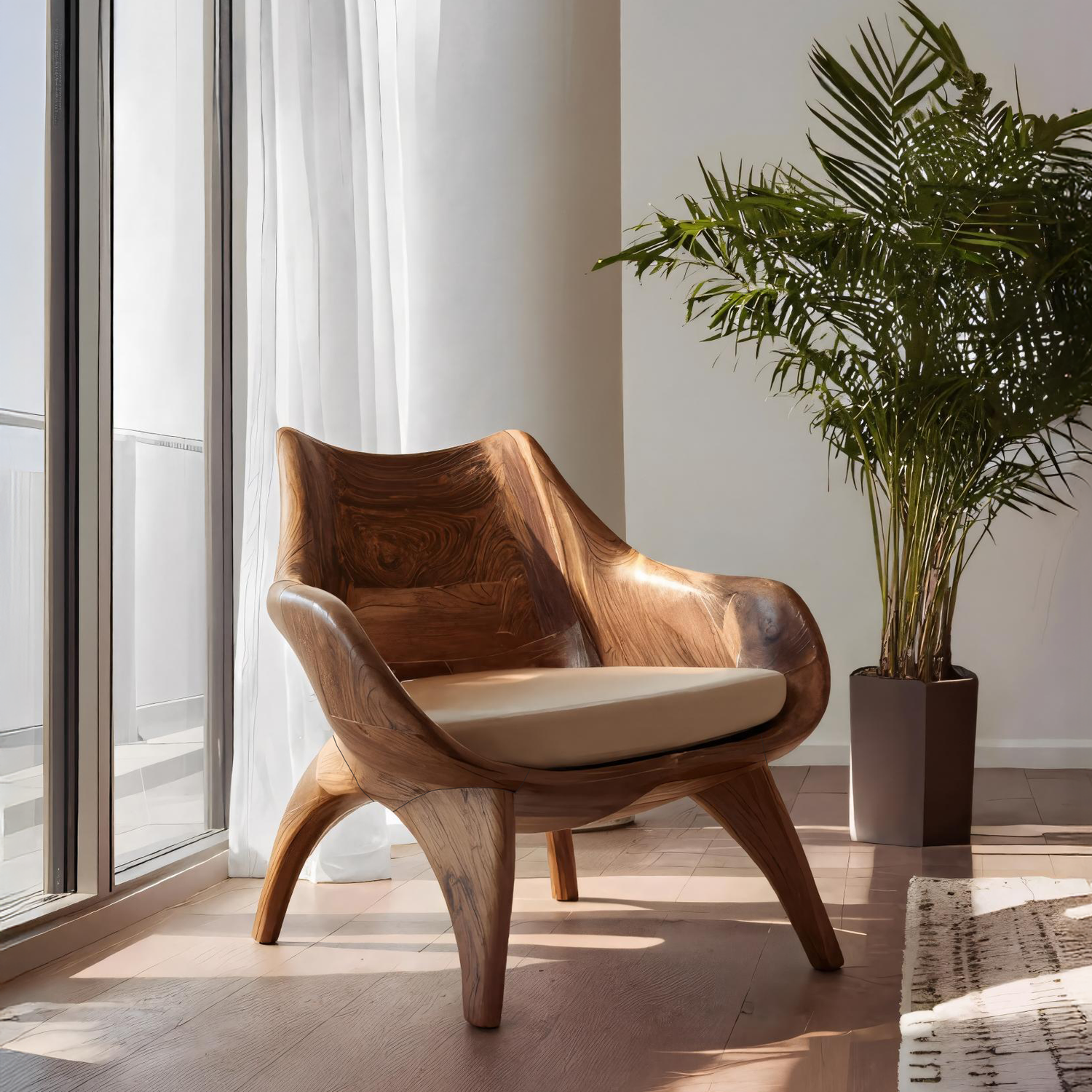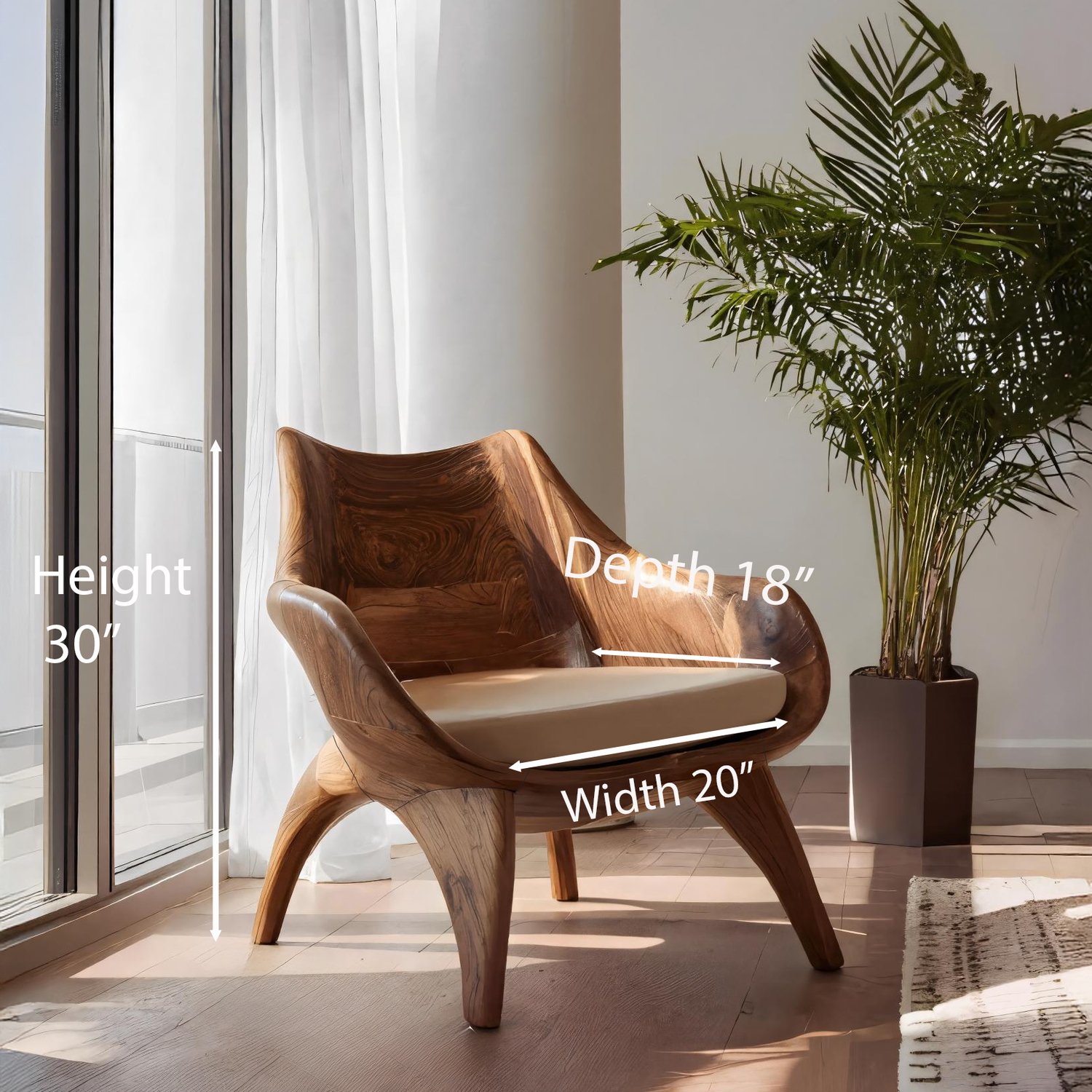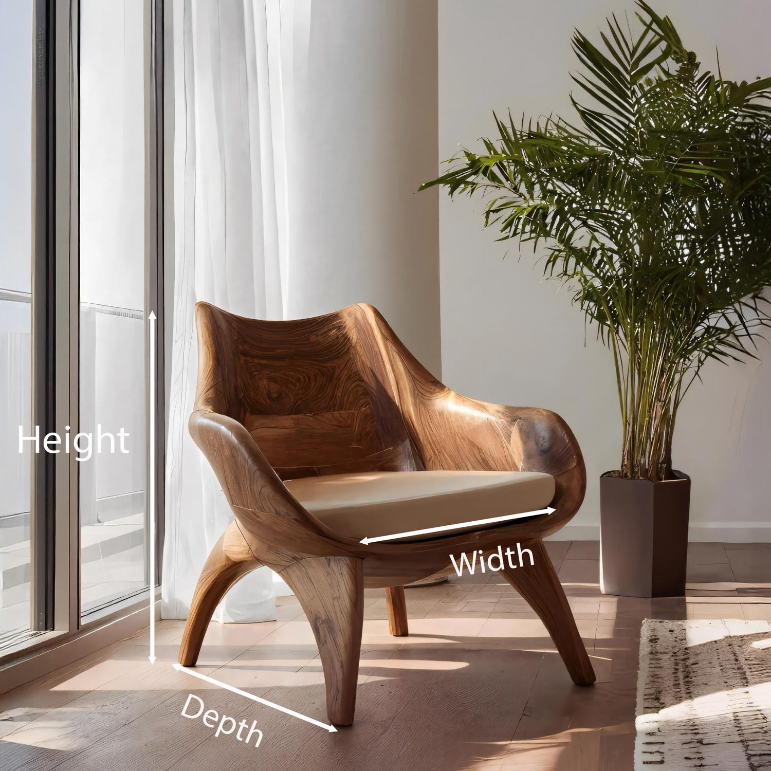 This lounge chair features a bold sculptural frame with sweeping curves and natural contours that emphasize the unique grain of solid wood. The softly upholstered seat provides comfort, while the open, fluid design blurs the line between functional seating and art. Perfect as both a statement piece and a relaxing retreat, it enhances any modern interior.