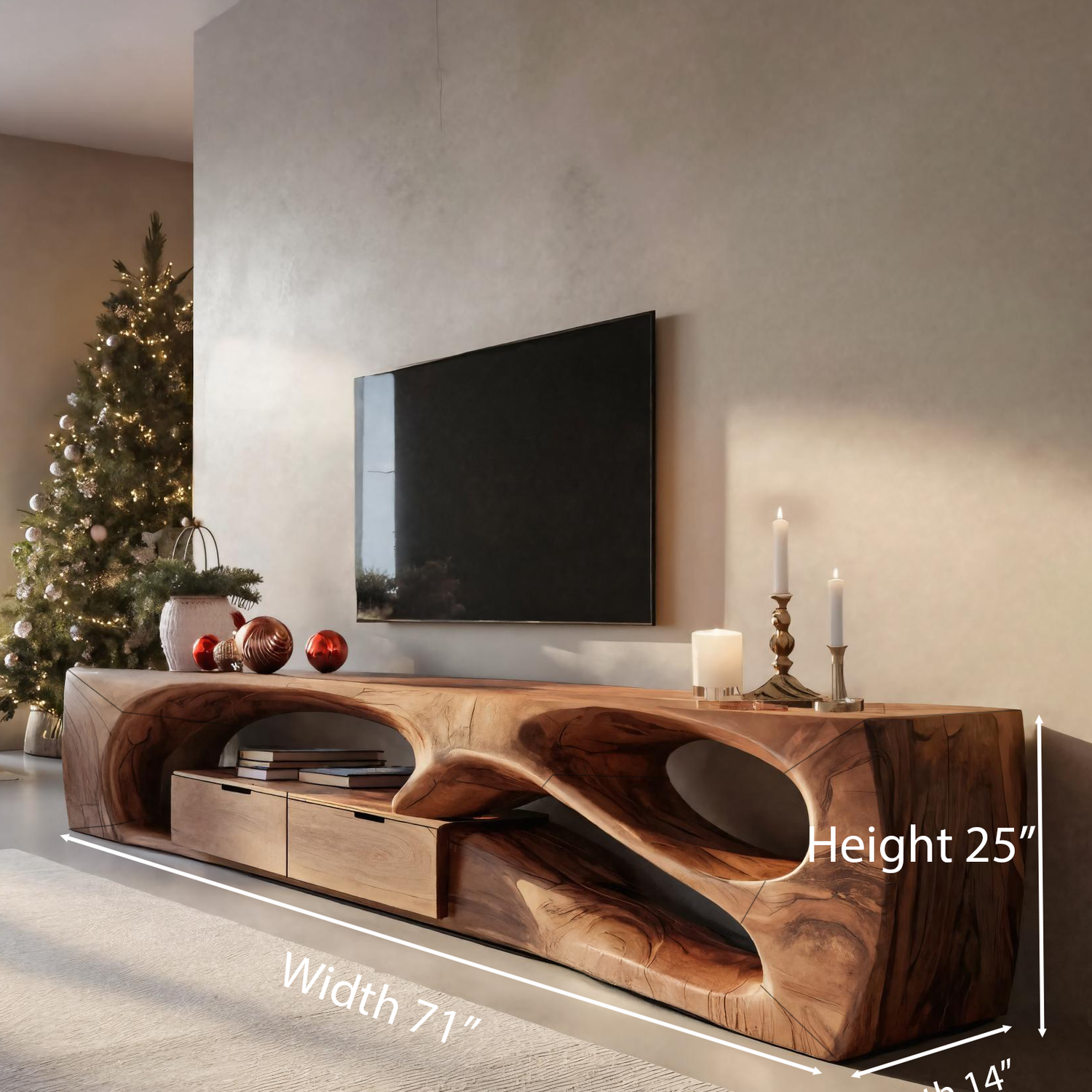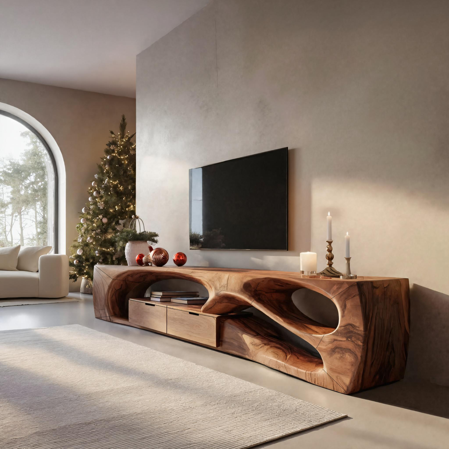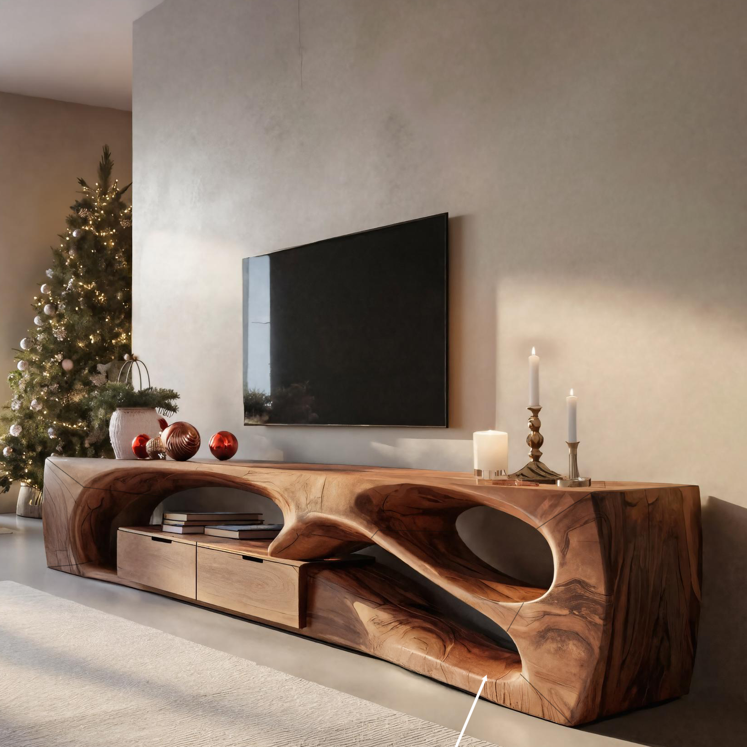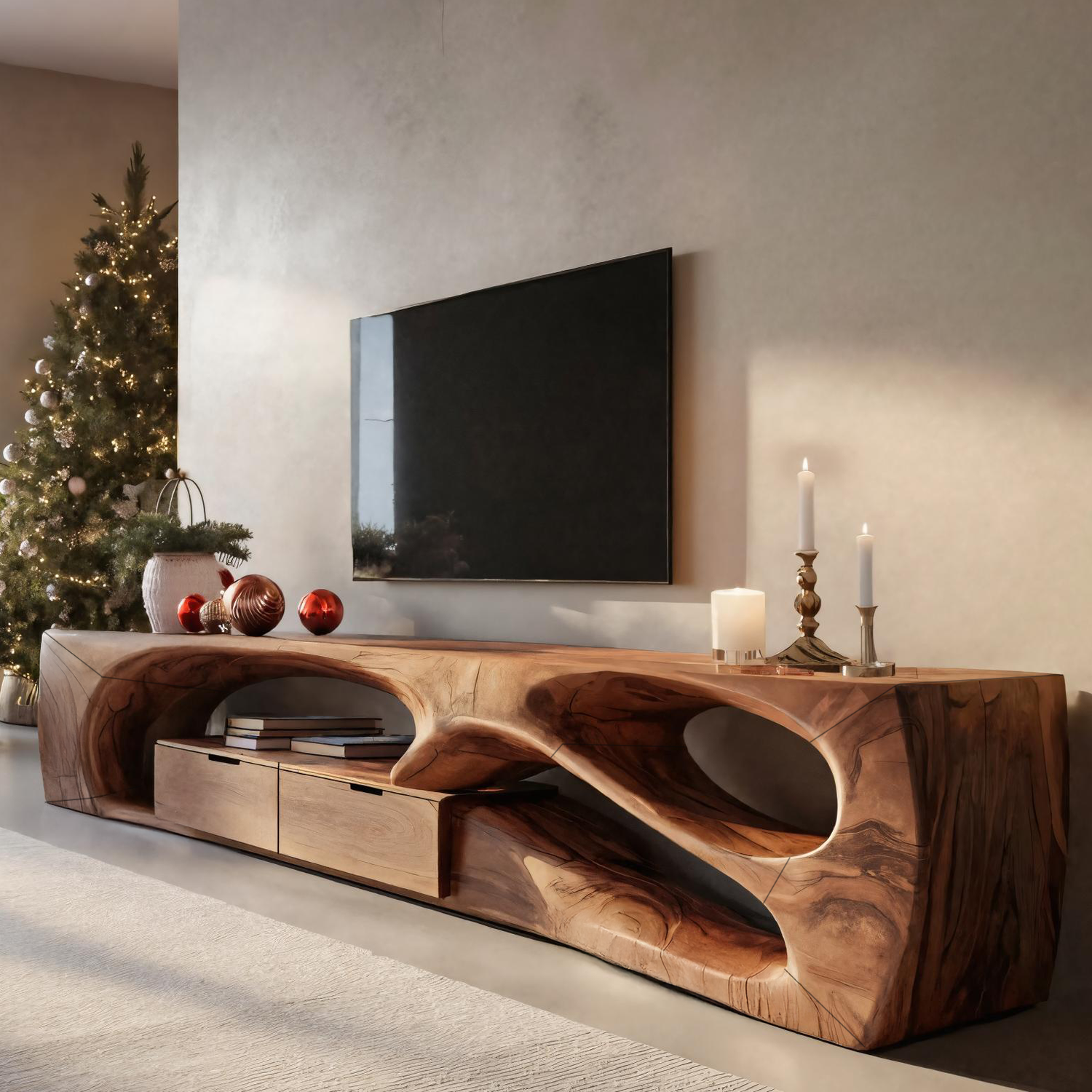 Celebrate the season with the Modern Sculptural TV Console For Holiday Decoration, a captivating fusion of art and function that transforms your living room into a space of warmth and refined beauty. Its flowing, organic form and natural wood texture create a timeless focal point — perfect for cozy gatherings and festive décor.