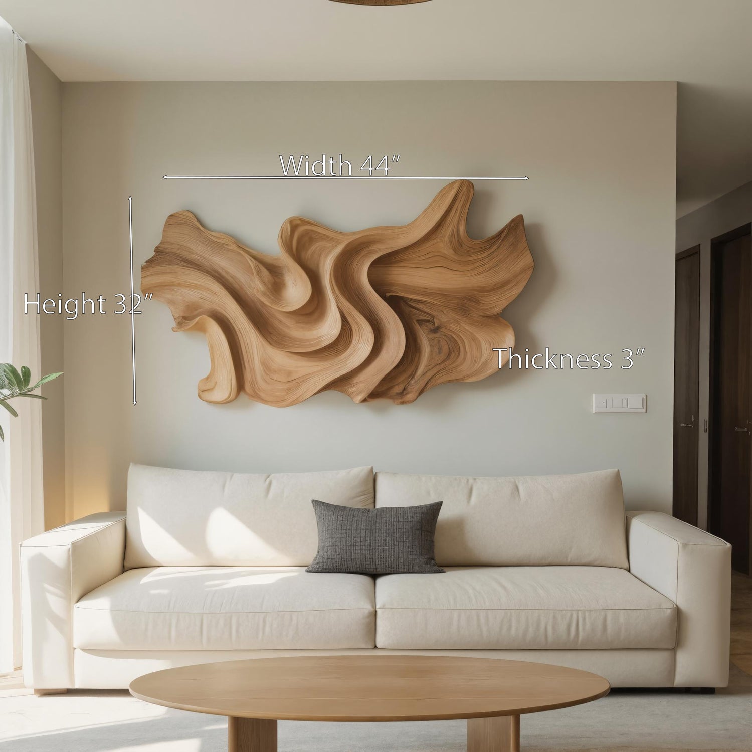 This wall-mounted artwork features sweeping curves and layered contours, carved to reflect a natural flow reminiscent of soft waves or draped fabric. Its abstract design adds movement and elegance to the bedroom, serving as both an artistic centerpiece and a calming visual element above the bed or along accent walls.