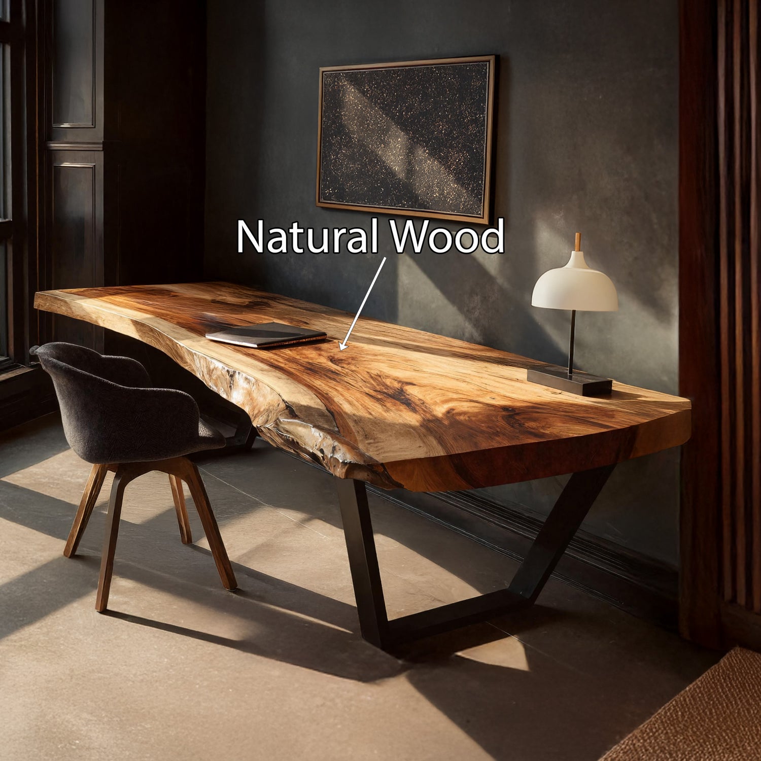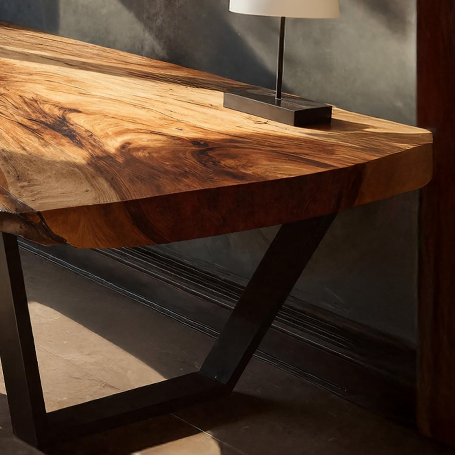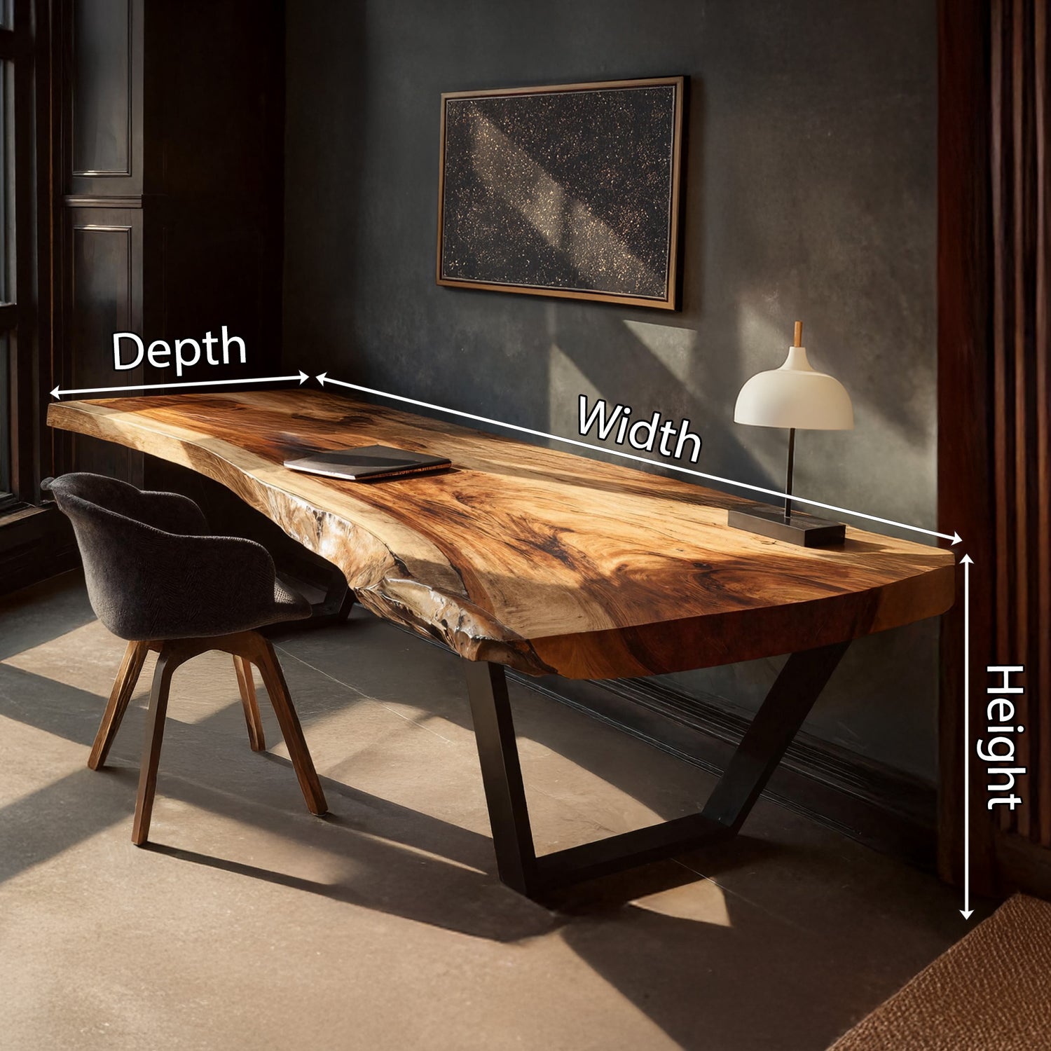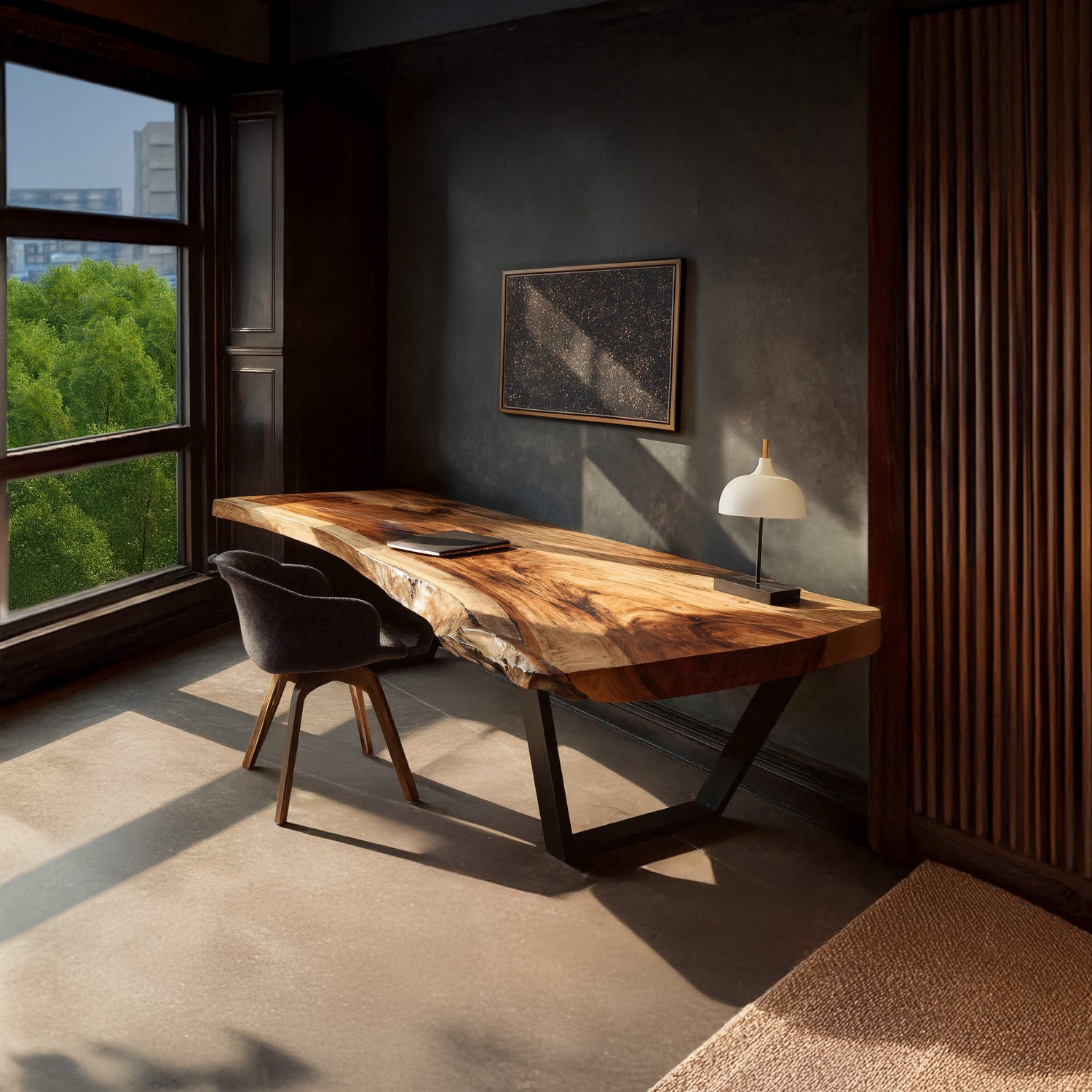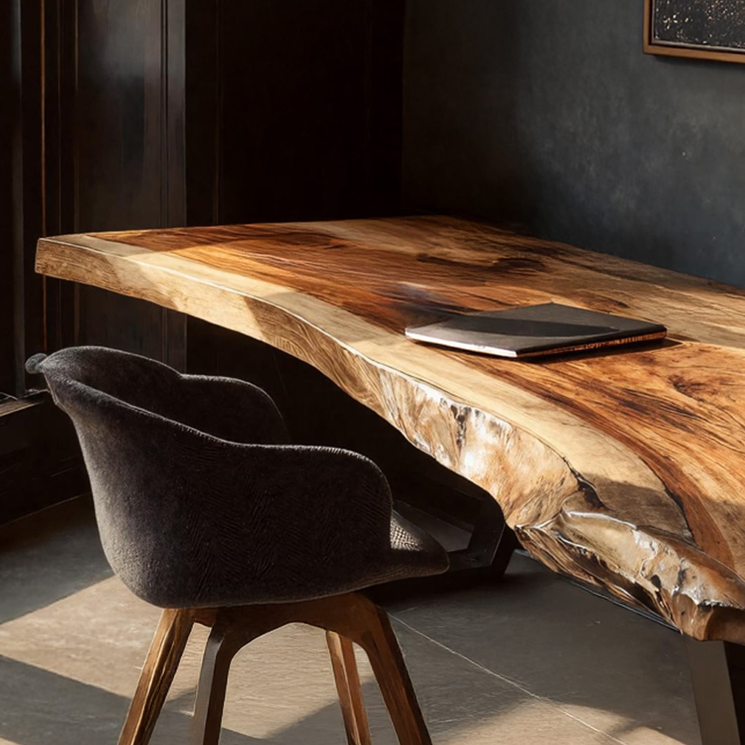 This desk is meticulously handcrafted from carefully selected solid monkey pod wood, showcasing flowing live edges, rich grain movement, and natural variations that make each piece one-of-a-kind. Designed with a timeless silhouette, it blends artisanal craftsmanship with enduring functionality, suitable for both contemporary and rustic-inspired spaces.