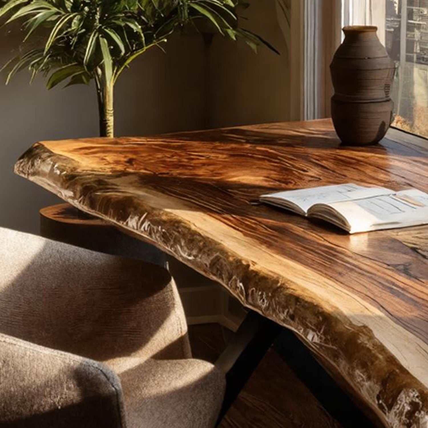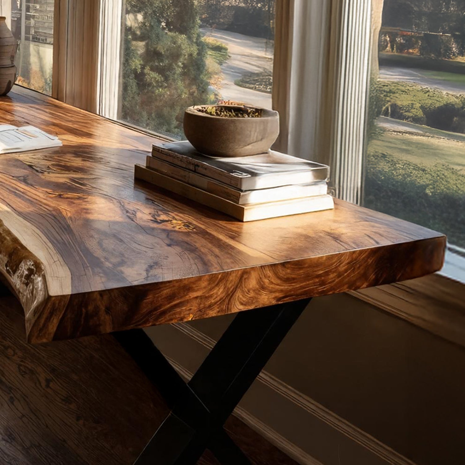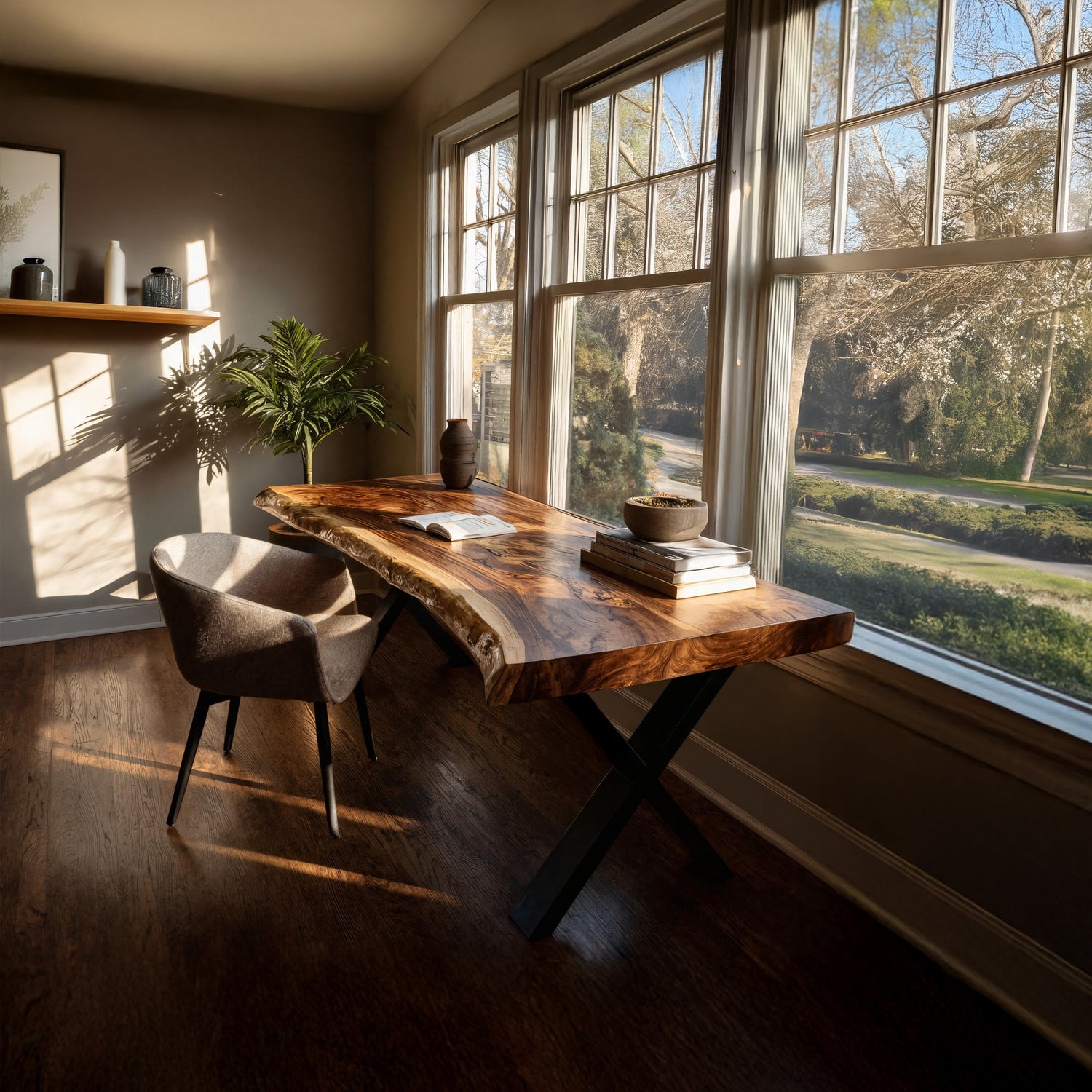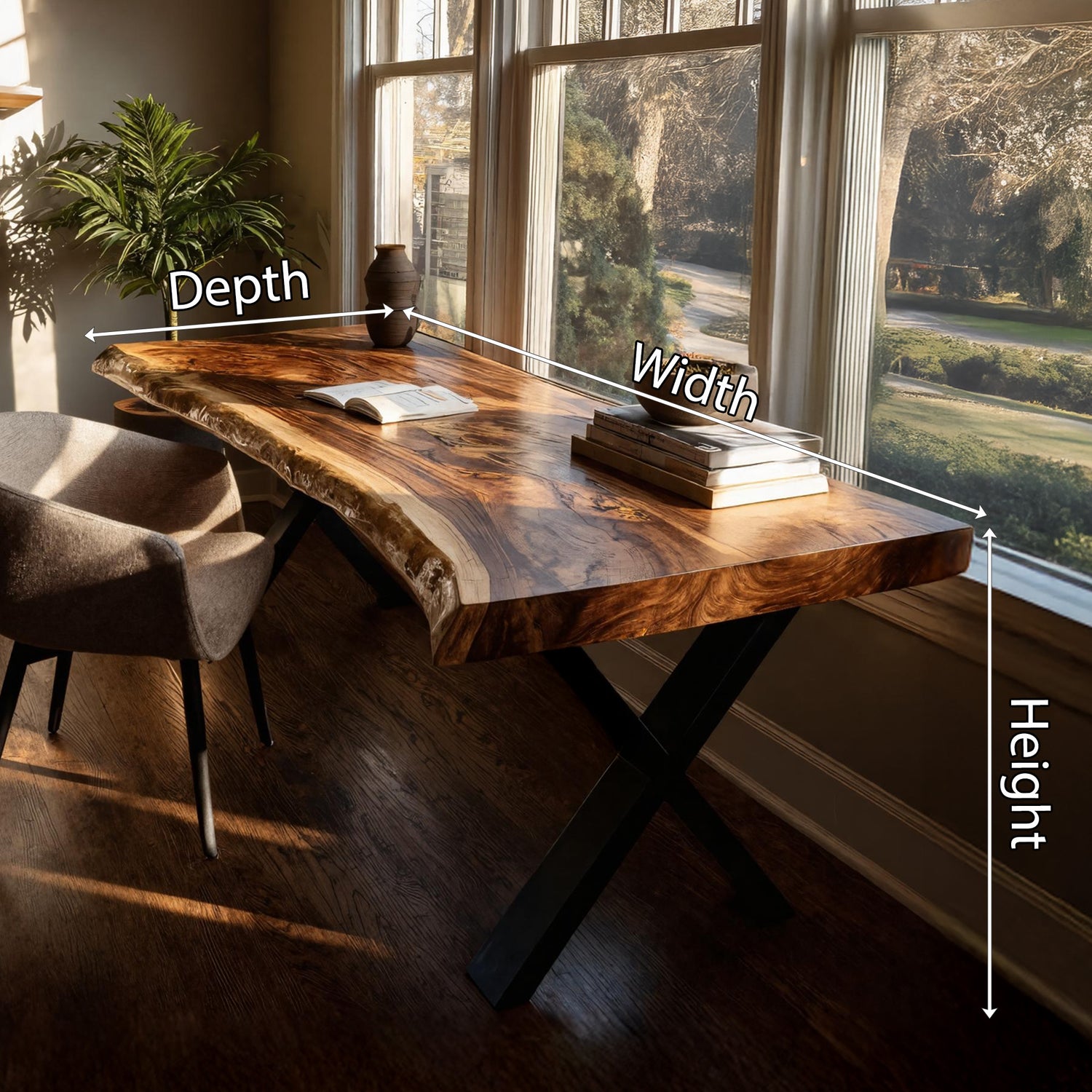 This desk is meticulously handcrafted from carefully selected solid monkey pod wood, showcasing flowing live edges, rich grain movement, and natural variations that make each piece one-of-a-kind. Designed with a timeless silhouette, it blends artisanal craftsmanship with enduring functionality, suitable for both contemporary and rustic-inspired spaces.