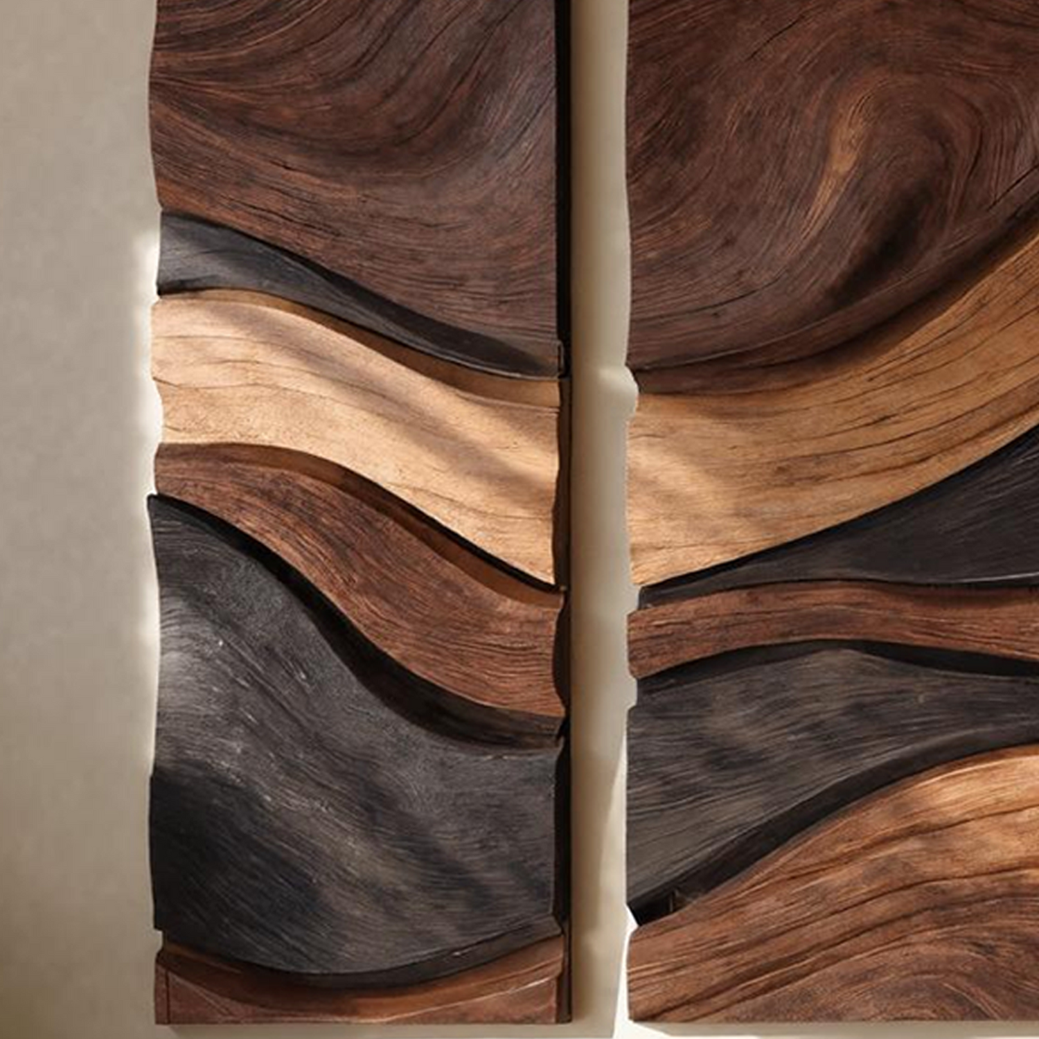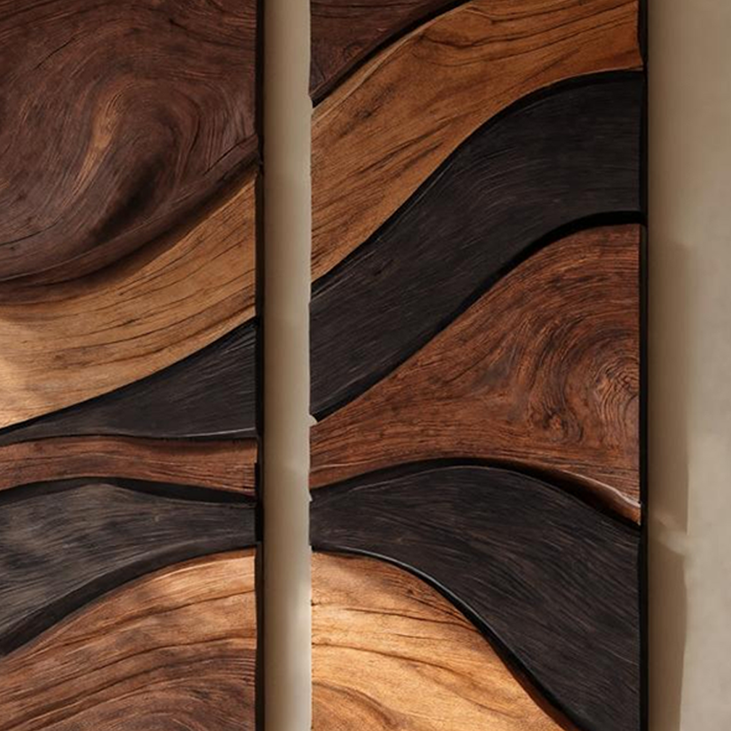 This wall-mounted sculpture blends fluid, organic contours with minimalist elegance. Hand-carved from solid hardwood, the rhythmic folds resemble ocean tides frozen in motion. The golden-toned wood grain is accentuated by deep charcoal edges, creating a striking interplay of warmth and contrast. Designed with a hidden mount, the piece floats seamlessly against your wall, enhancing its sculptural presence.