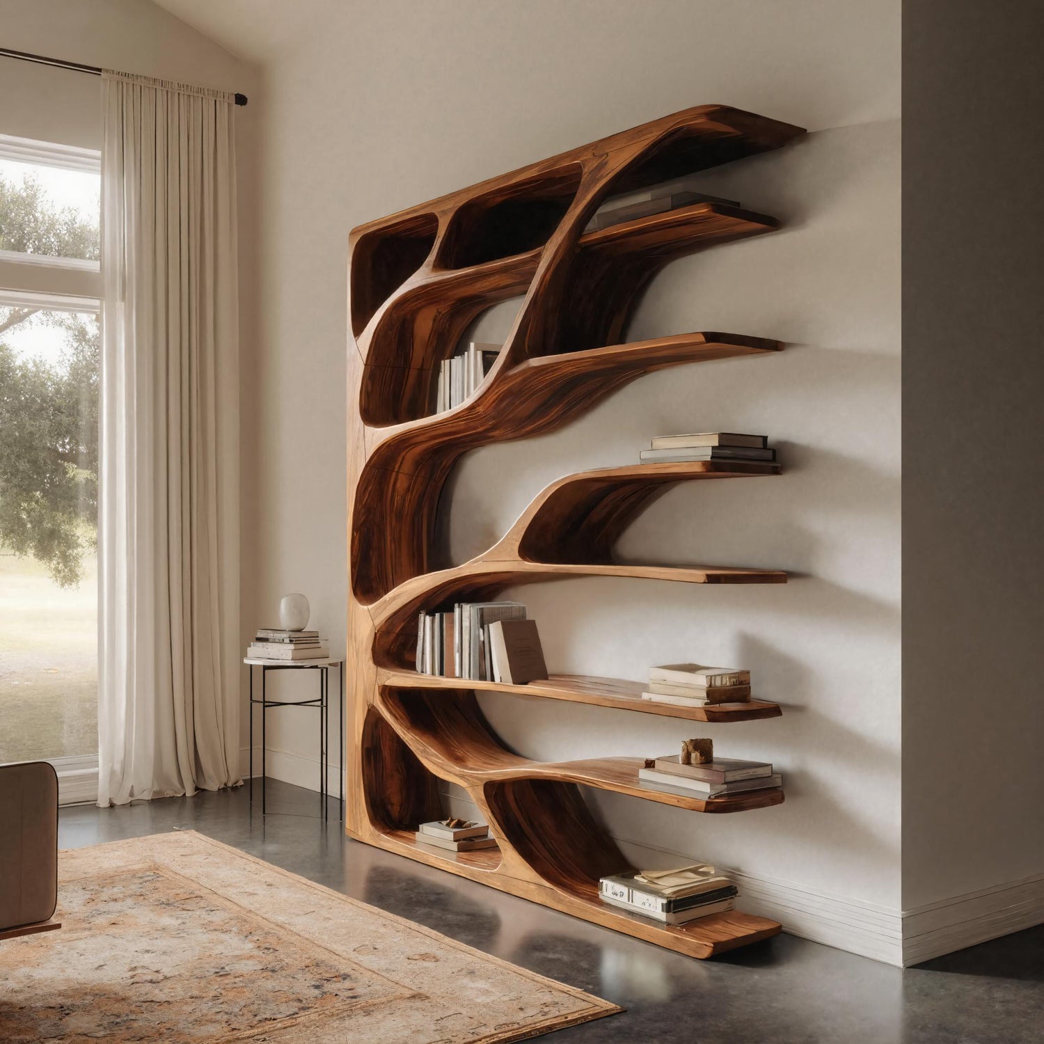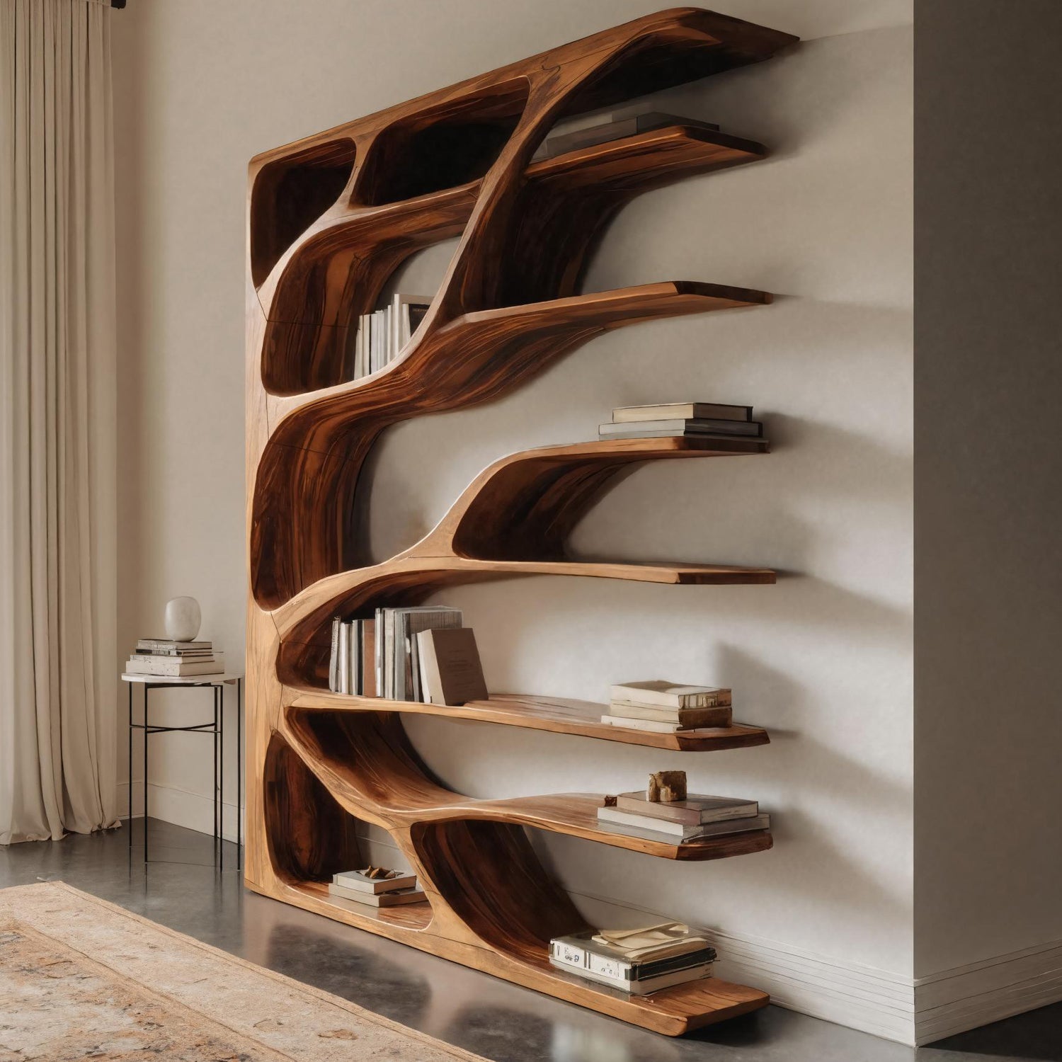 A bold shelving piece defined by flowing structure and sculptural presence, Modern Statement Bookshelf For Home Interiors Decor, created to introduce movement, depth, and natural warmth into contemporary living spaces. With its fluid vertical form and open layout, this bookshelf acts as both functional storage and a visual centerpiece within the room.The carved, wave-like framework guides the eye upward, allowing books and decorative objects to be displayed along gently contoured shelves. The open construction maintains visual lightness, while the expressive wood grain adds organic character and quiet contrast to clean interior walls.