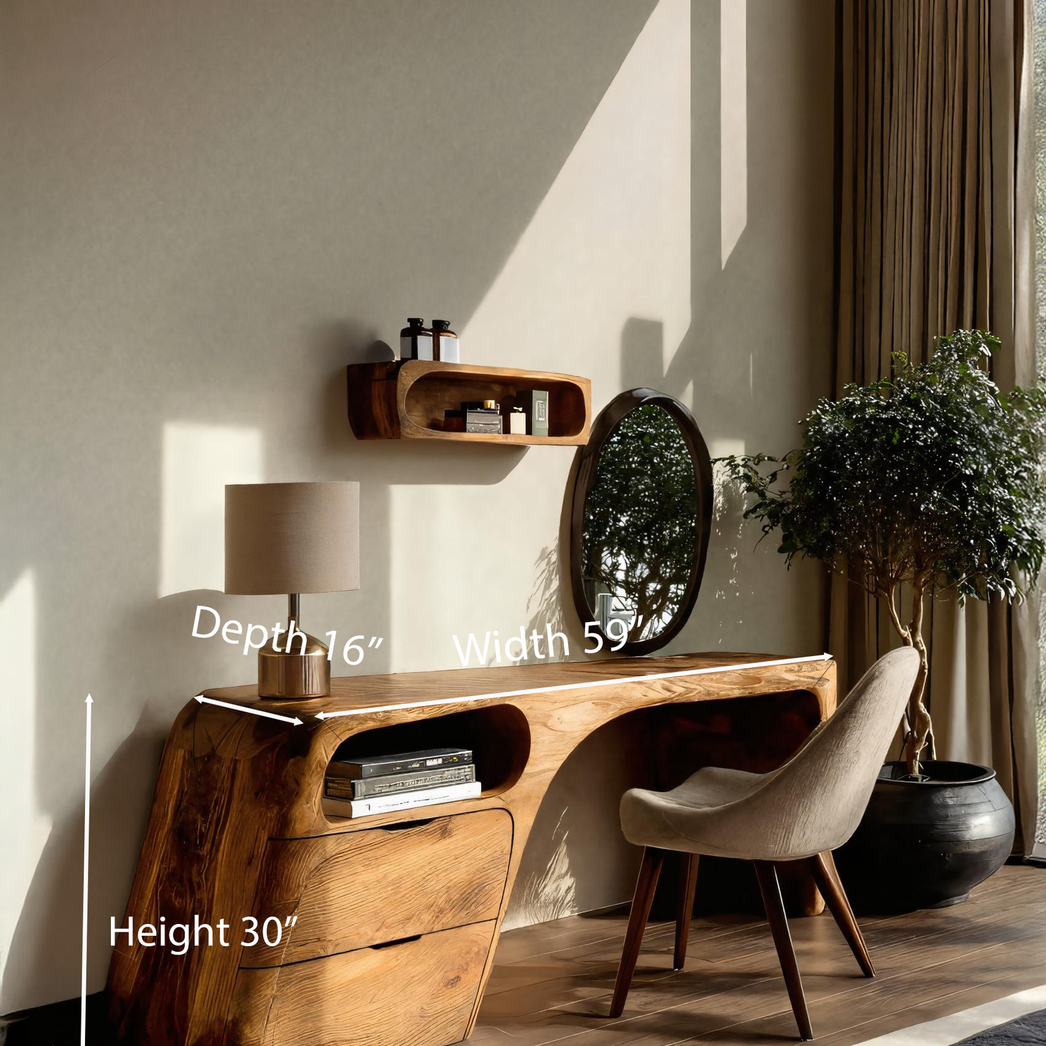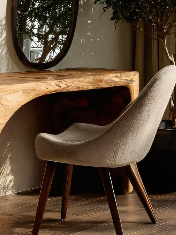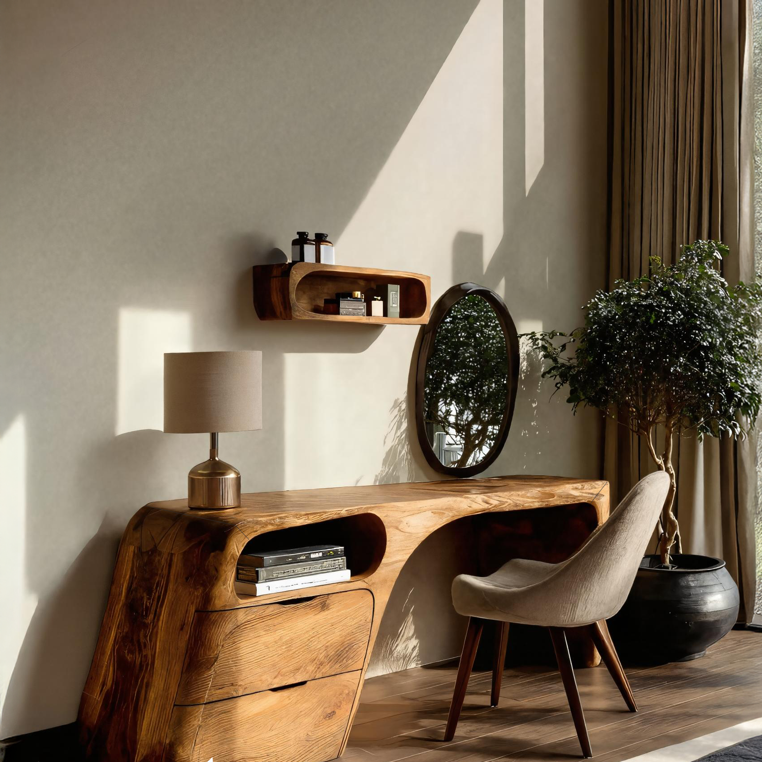 This vanity table features smooth flowing lines with integrated open shelving and drawers for convenient storage. The asymmetrical design highlights the organic character of solid wood, while the wide tabletop creates a functional surface for daily essentials. Paired with a round mirror, it becomes a centerpiece for any bedroom or dressing corner.