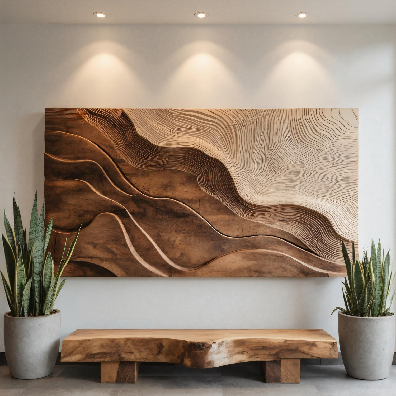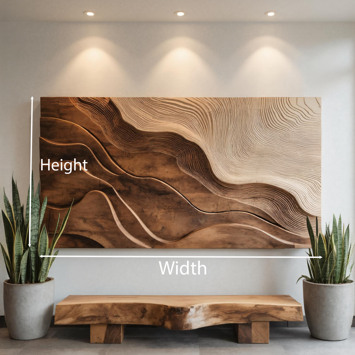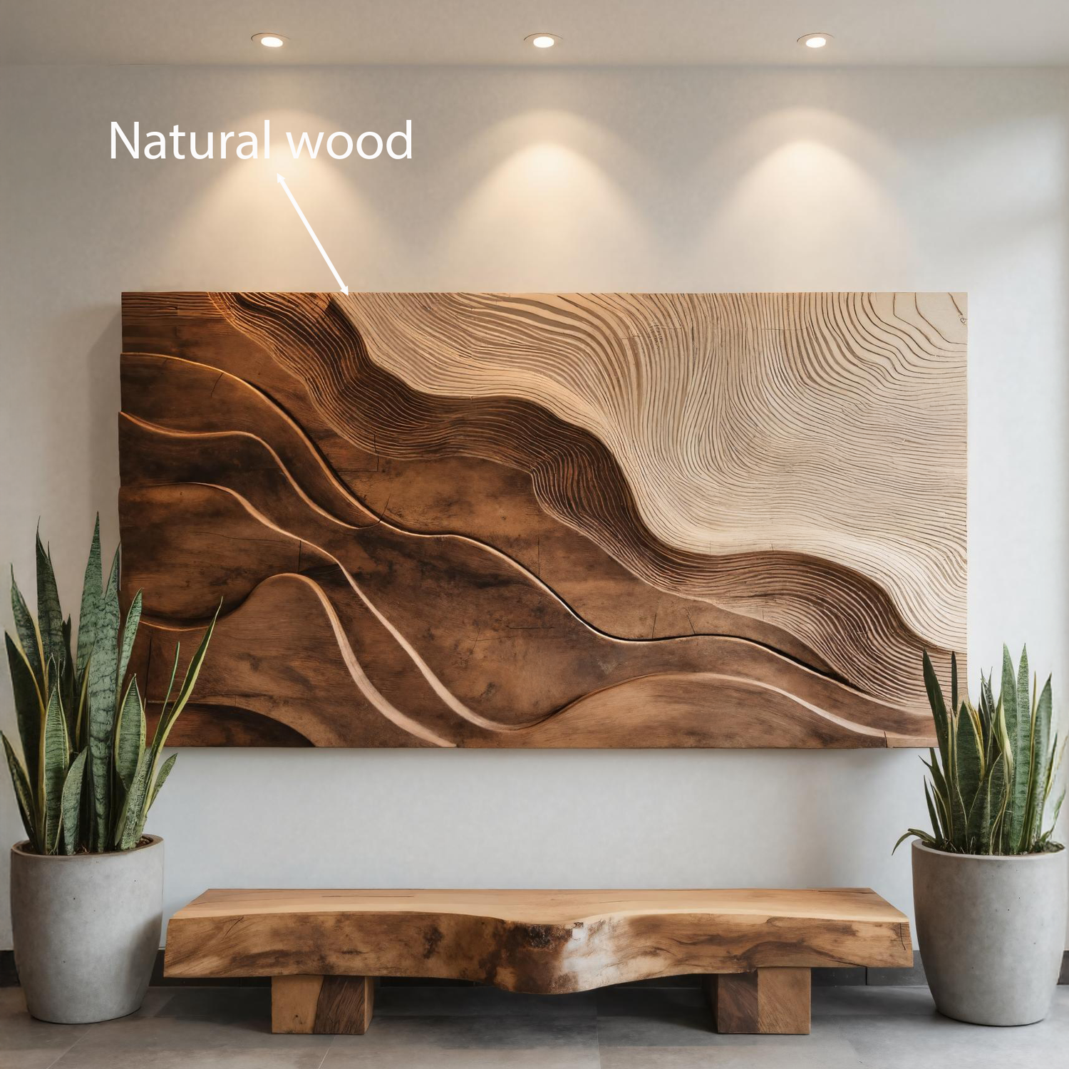 This wall art panel features intricate, flowing lines carved into solid wood, echoing the fluidity of wind-swept sand or gentle waves. The undulating surface plays beautifully with natural and artificial light, creating shifting highlights and shadows throughout the day. Its bold presence and refined detailing make it a focal point in modern interiors while maintaining a sense of calm and balance.