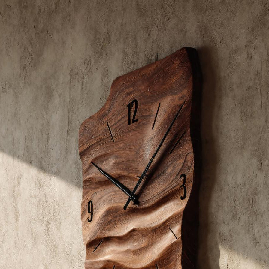 A sculptural timepiece shaped by natural contours and carved detail, Modern Wall Clock Carved Design For Living Room Space, created to add visual depth and organic character to interior walls. With its irregular silhouette and expressive wood grain, this wall clock functions as both a practical object and a decorative focal point.