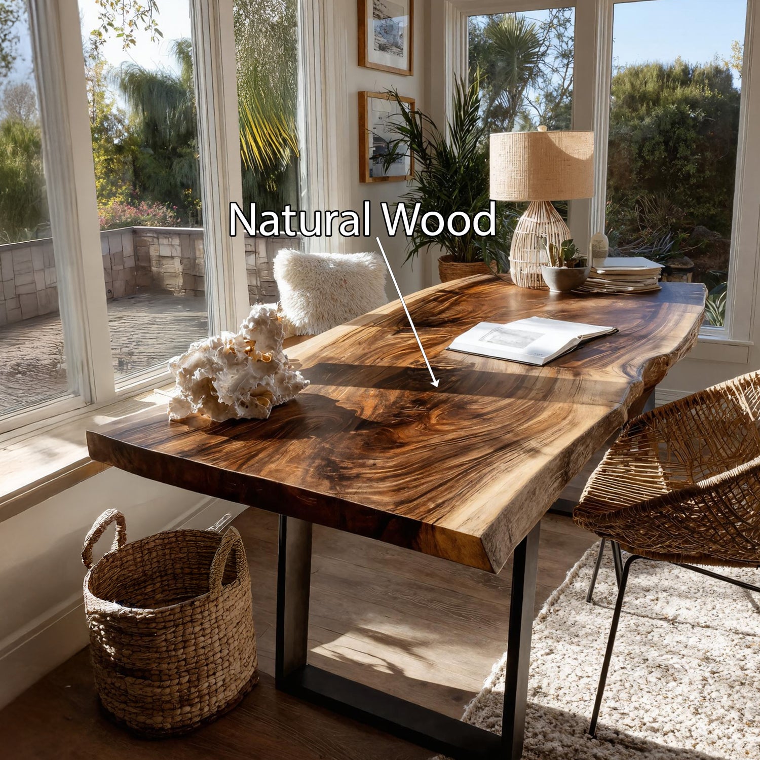Transform your personal space with this Modern Wooden Live Edge Desk For Bedroom Design, crafted to highlight the natural warmth and expressive grain of solid monkey pod wood. The flowing live edge and smooth wooden surface bring an organic elegance to your room, creating a calming environment for working, reading, or creative tasks. Designed as both a functional desk and a decorative focal point, it blends seamlessly with contemporary, minimalist, and modern-style interiors—adding a refined touch to any bedroom setting.