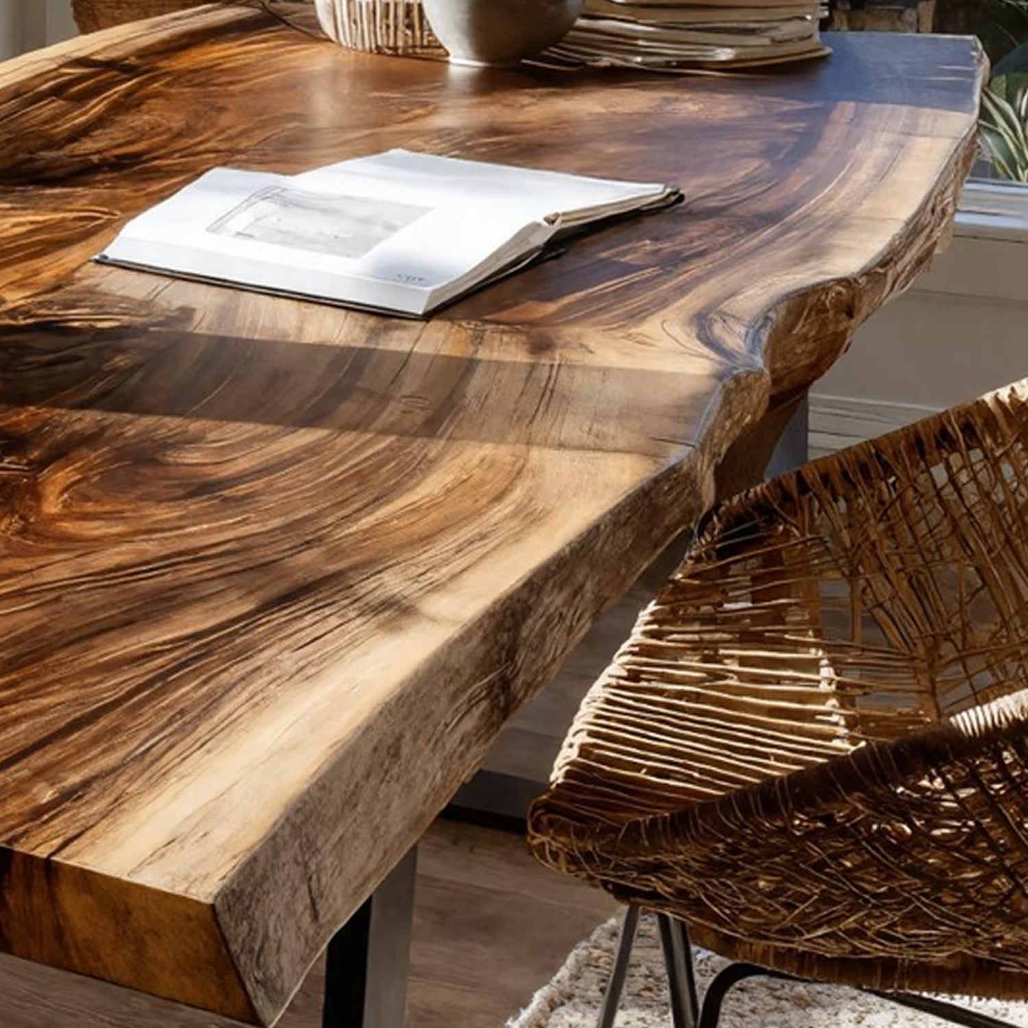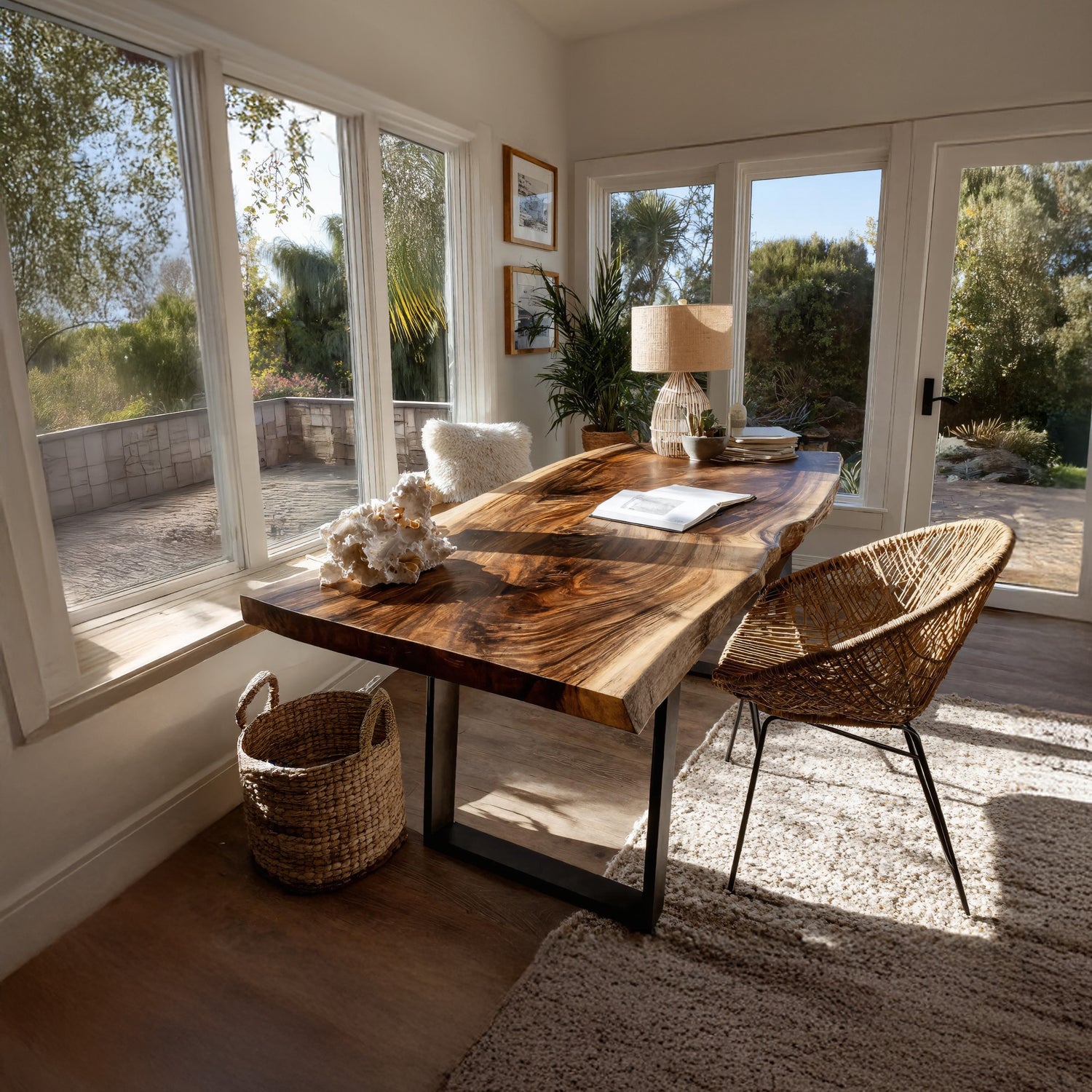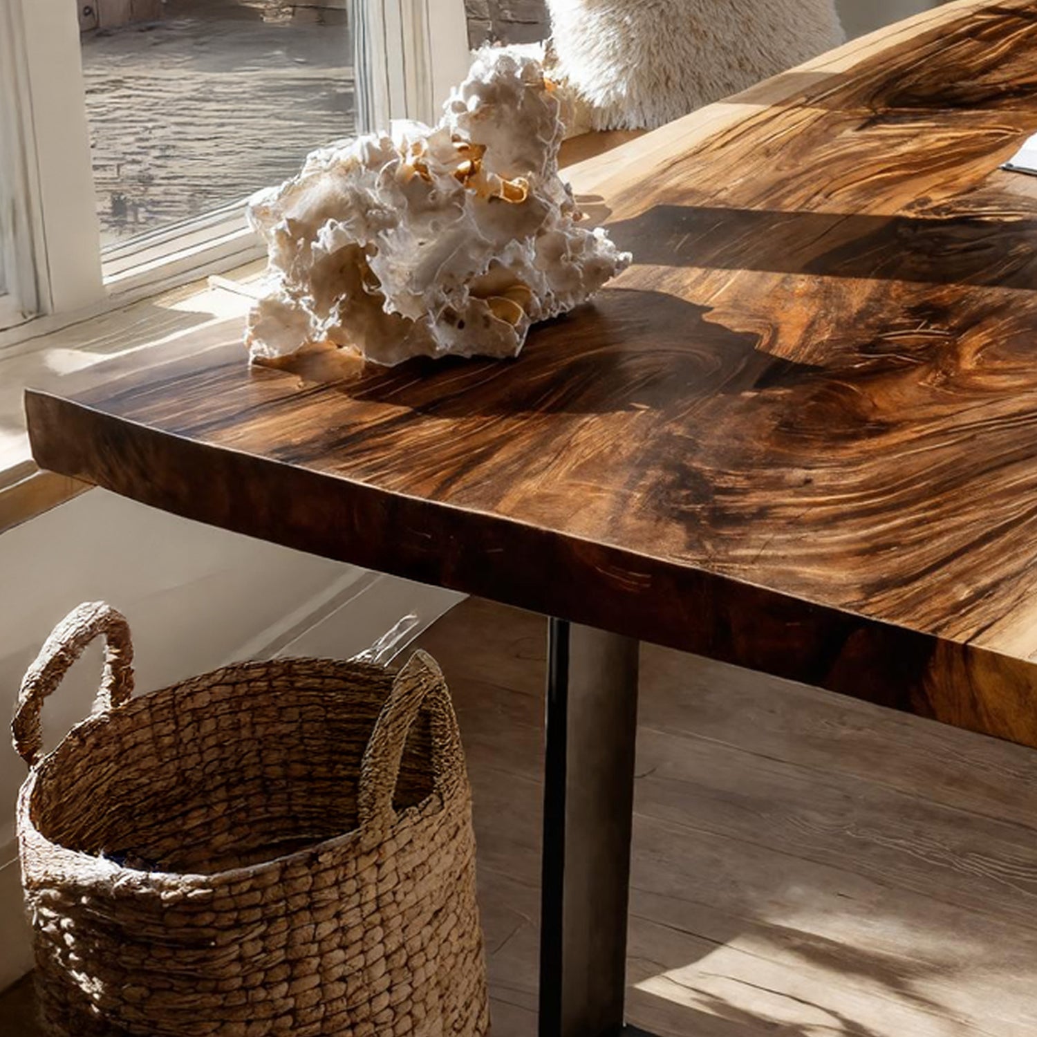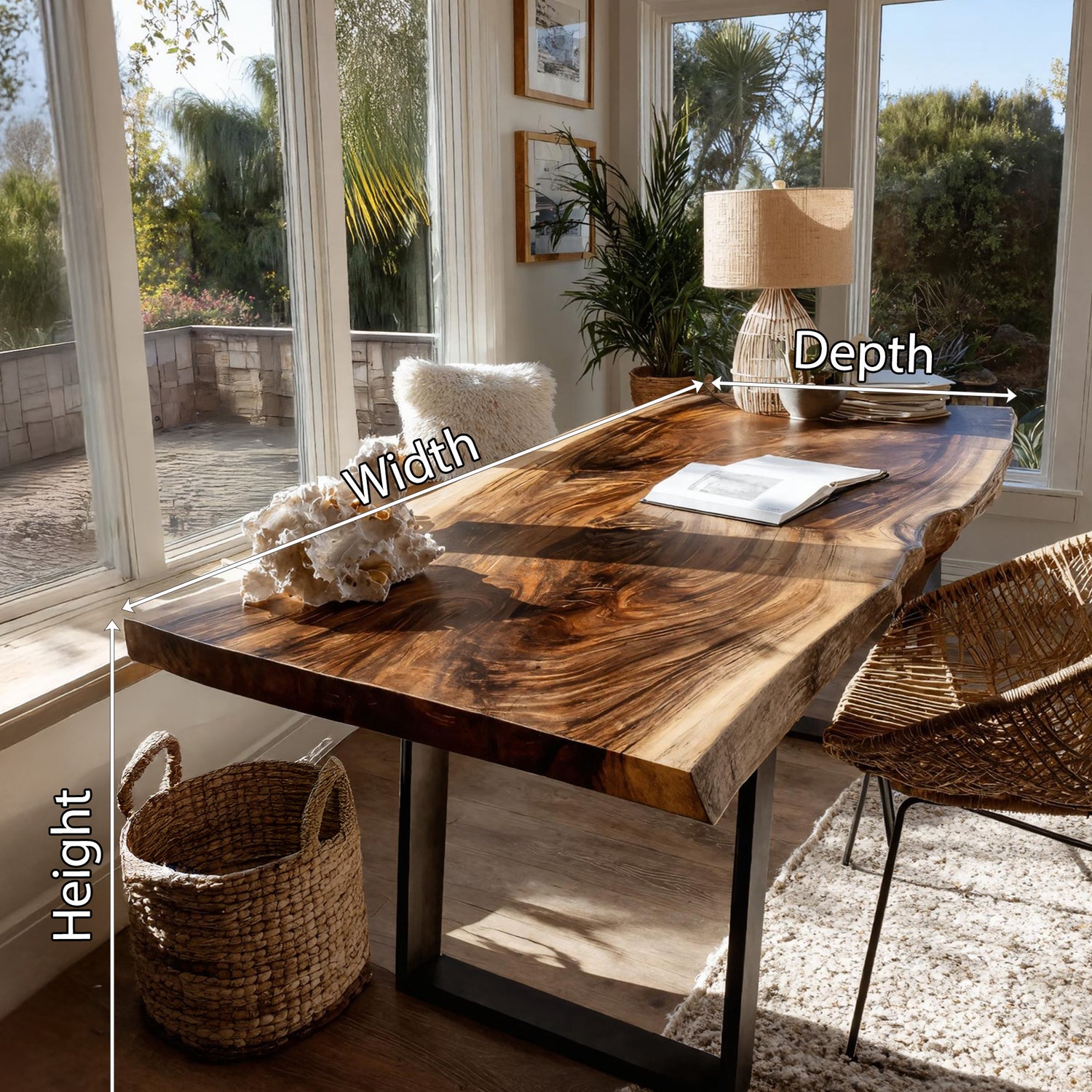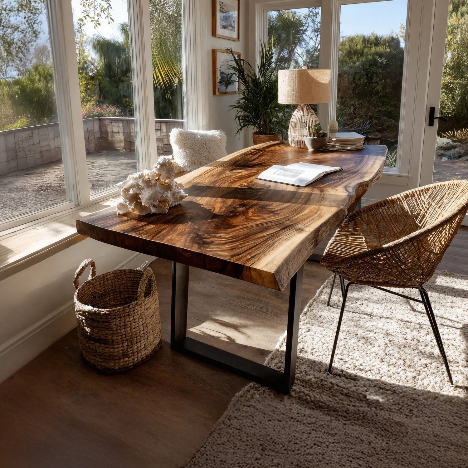 This desk is meticulously handcrafted from carefully selected solid monkey pod wood, showcasing flowing live edges, rich grain movement, and natural variations that make each piece one-of-a-kind. Designed with a timeless silhouette, it blends artisanal craftsmanship with enduring functionality, suitable for both contemporary and rustic-inspired spaces.