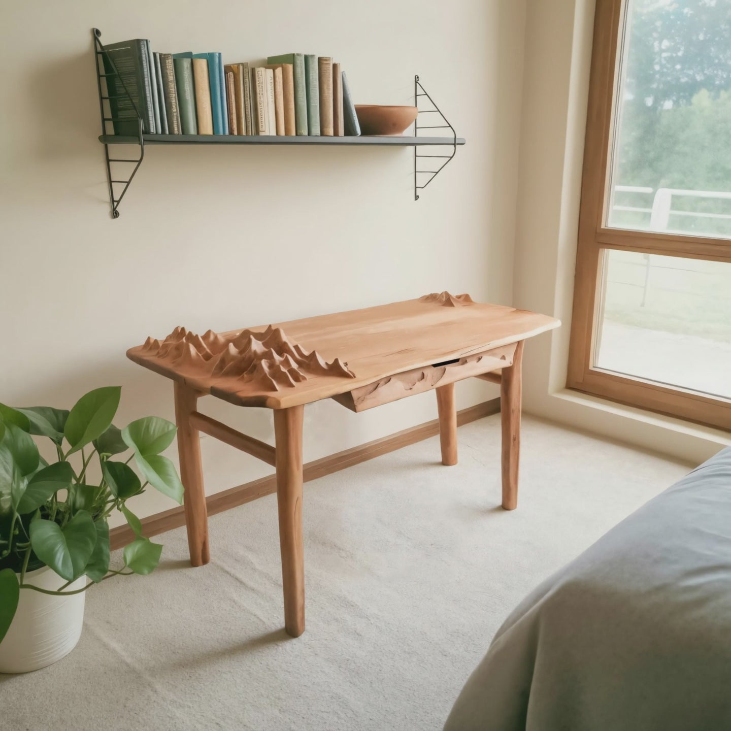 This freestanding desk features a desktop sculpted with a detailed mountain ridge relief, preserving the raw contours of the wood. The three‑dimensional peaks and valleys provide both visual intrigue and tactile interest, while the clean, rectangular profile and sturdy legs ensure a balanced, minimalist silhouette.