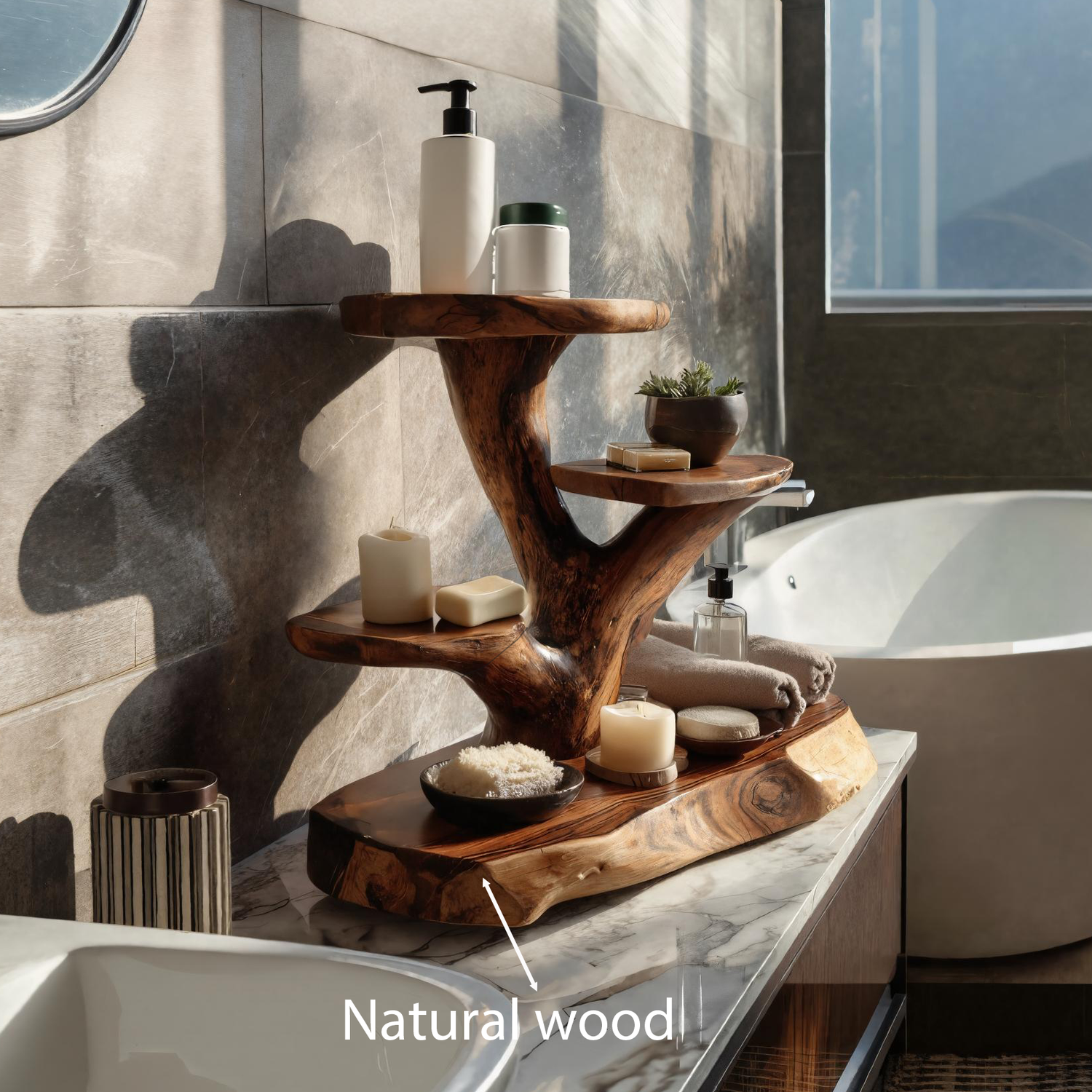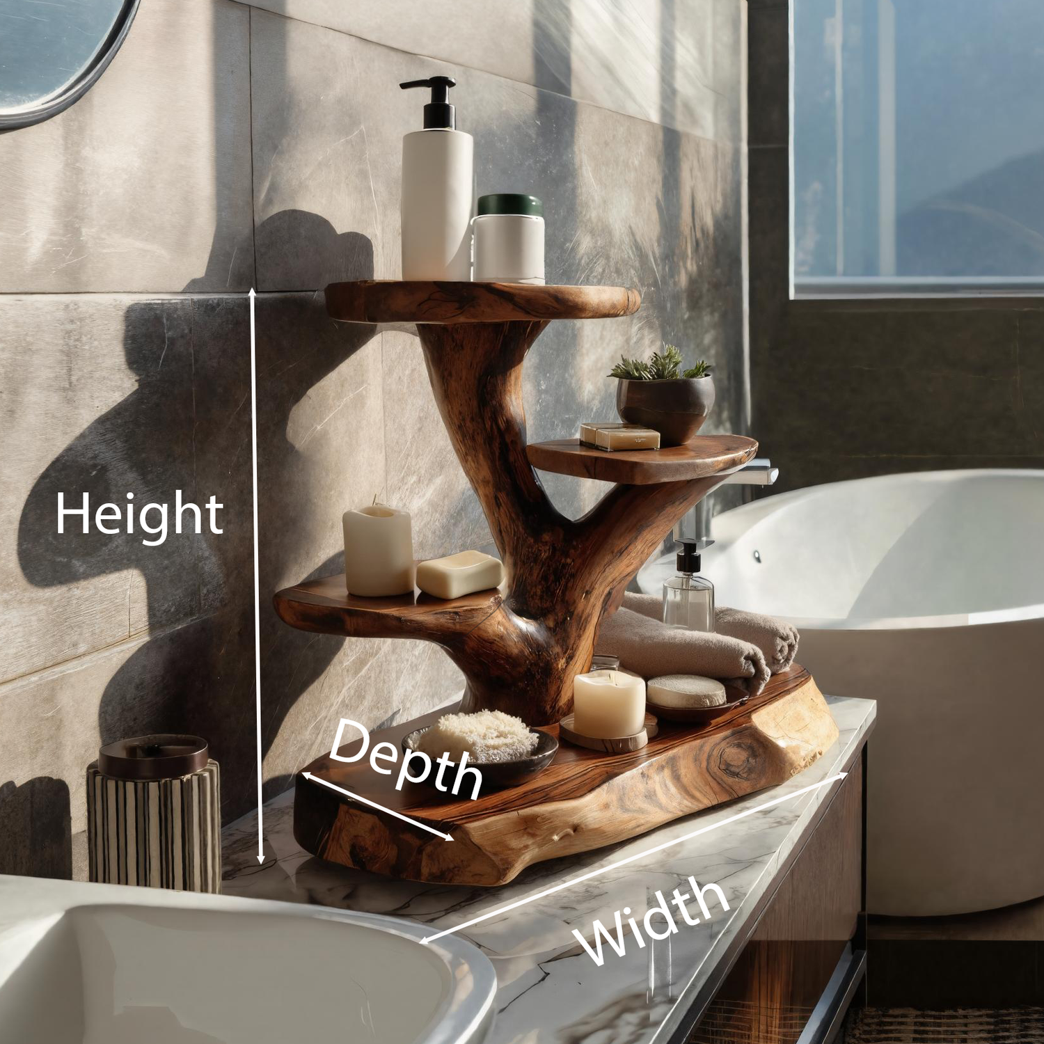 This multi-tier shelf features an organically shaped silhouette inspired by branching forms found in nature. The curved platforms offer practical space for candles, soaps, skincare items, plants, or rolled towels, while the expressive carved base brings a sense of movement and texture to the bathroom. Designed to sit comfortably on countertops, bath ledges, or vanities, it enhances the room with both utility and artistic presence.