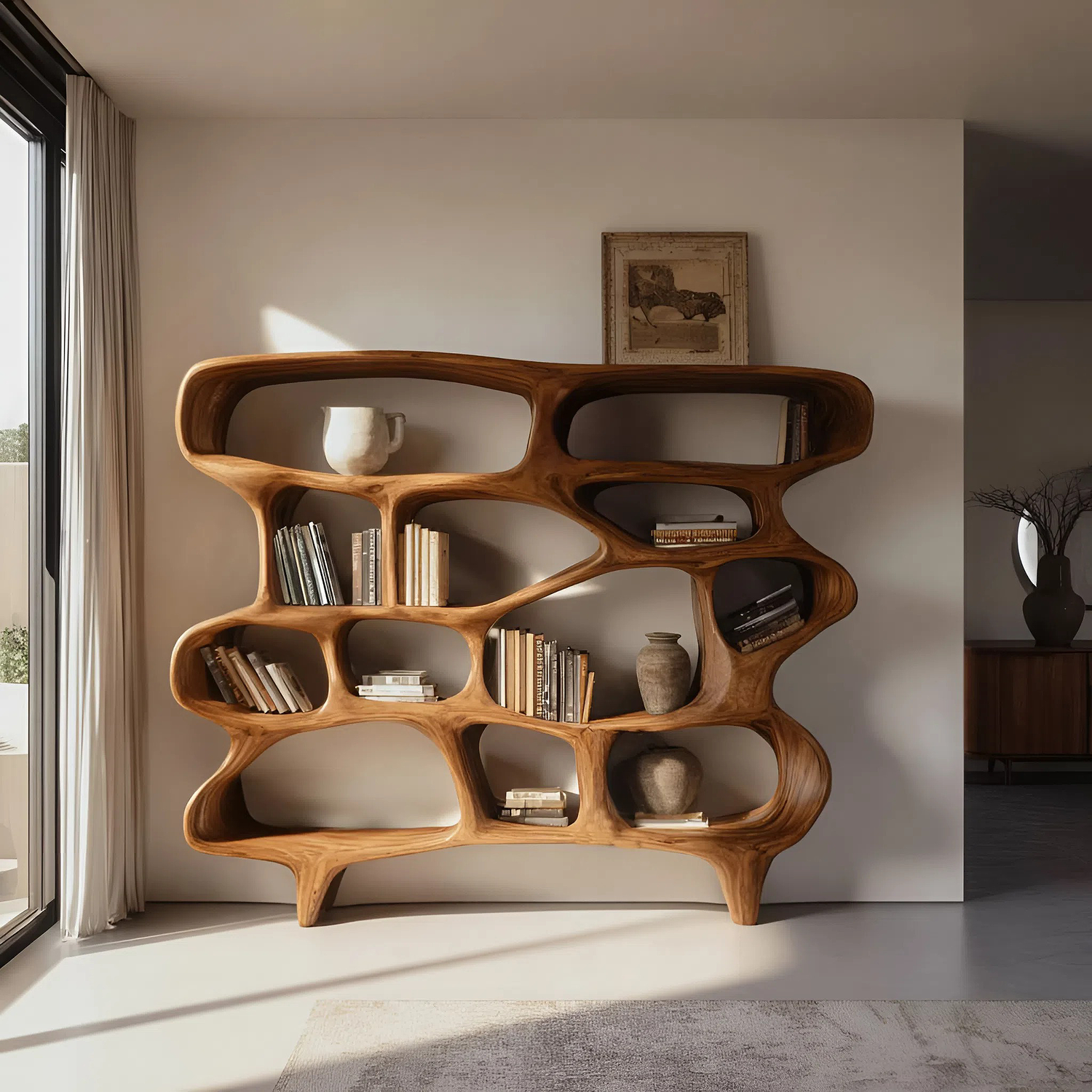 Introduce a striking yet calming centerpiece to your interior with our Organic Sculptural Bookshelf For Living Room Or Office Decor. Designed with flowing carved forms and interconnected shelves, this piece brings a sense of movement and natural harmony into any environment. Its open, artistic structure elevates the room while offering thoughtful display and storage space.