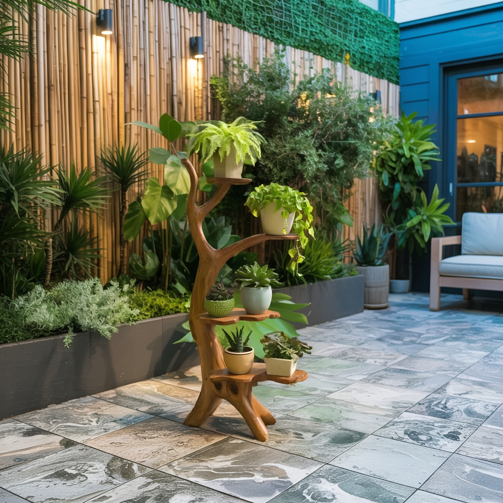 Crafted to mimic the natural flow of tree limbs, each tier emerges gracefully from the central trunk, offering unique perches for a variety of pots. Its asymmetrical silhouette adds an artistic and fluid touch to outdoor or indoor garden spaces.