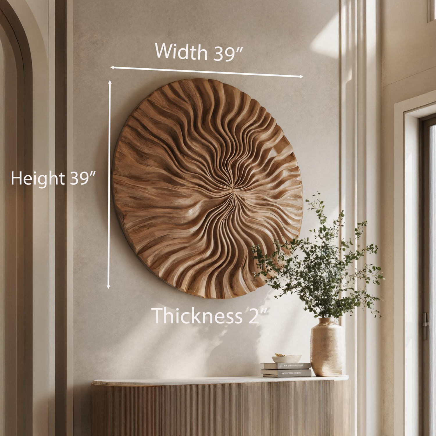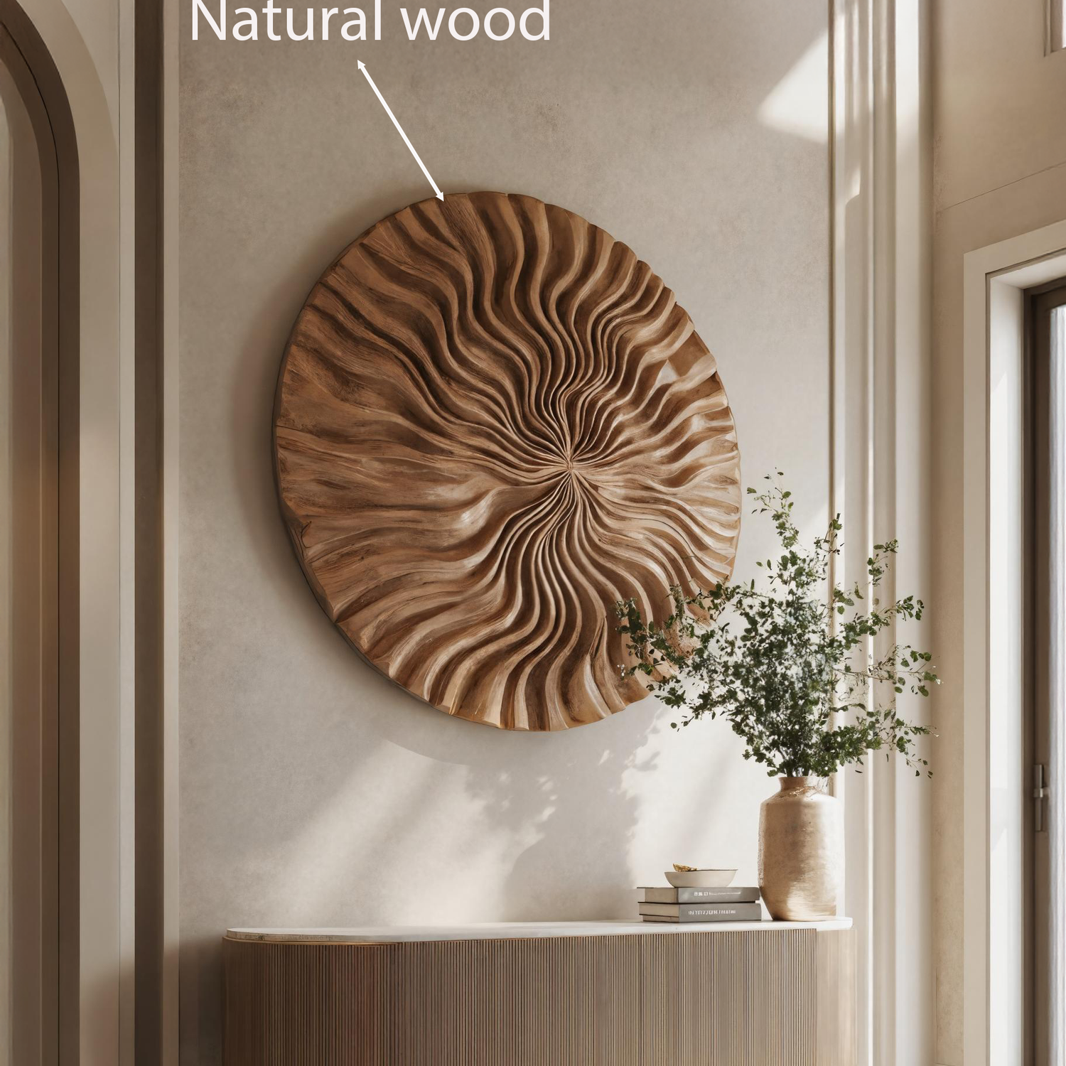 This wall art highlights sculptural waves arranged in a harmonious radial pattern. The round silhouette makes it an ideal statement piece for entryways, where its organic flow enhances both the wall and surrounding décor. Natural shadows shift throughout the day, offering a dynamic visual effect.
