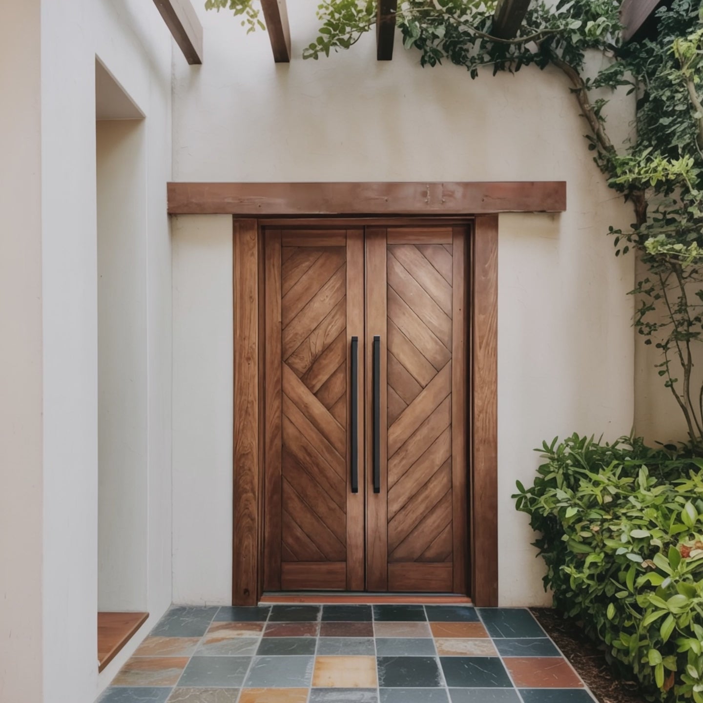 These handcrafted double doors showcase a striking chevron‑style panel layout, framed by clean, robust stiles and rails. The perfectly aligned grain patterns create visual movement, while the balanced proportions and substantial handles deliver a commanding yet approachable facade.