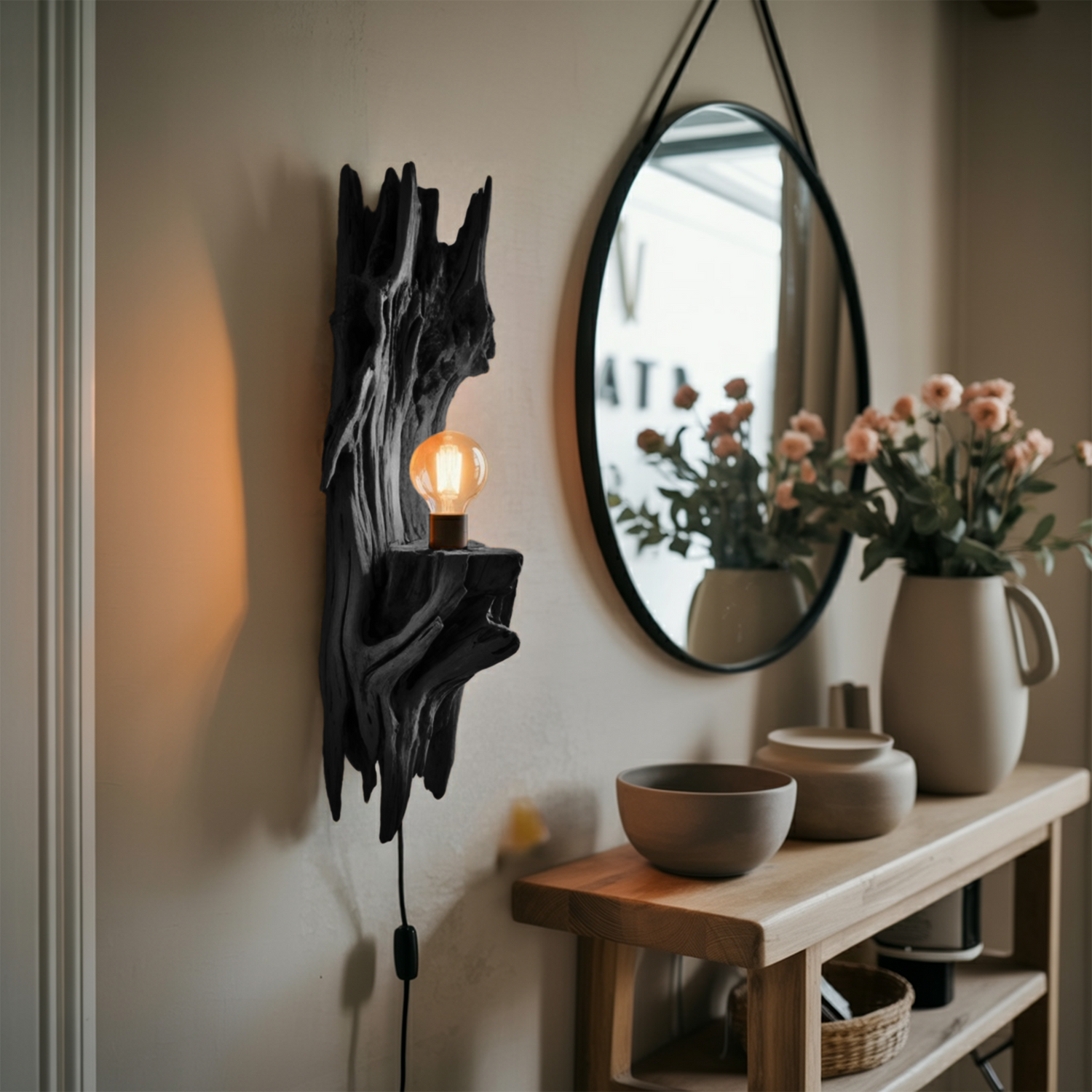 This wall-mounted lamp is crafted from naturally weathered driftwood, its sculptural contours forming a unique stage for a warm glowing bulb. The combination of organic texture and gentle lighting creates a cozy ambiance, making it perfect for intimate corners, reading spaces, or accent walls.