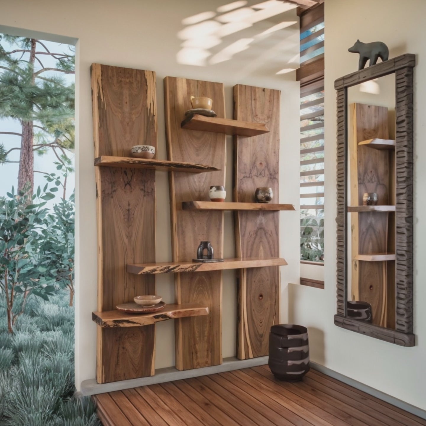 Crafted from solid wood slabs with natural edges and organic shapes, each shelf celebrates the raw and unpredictable character of nature. Mounted on vertical wooden back panels, the shelves appear to float, creating a gallery-like installation that merges art and utility. This design brings depth and movement to your walls, complementing rustic, boho, modern, Japandi, and industrial-inspired interiors alike.