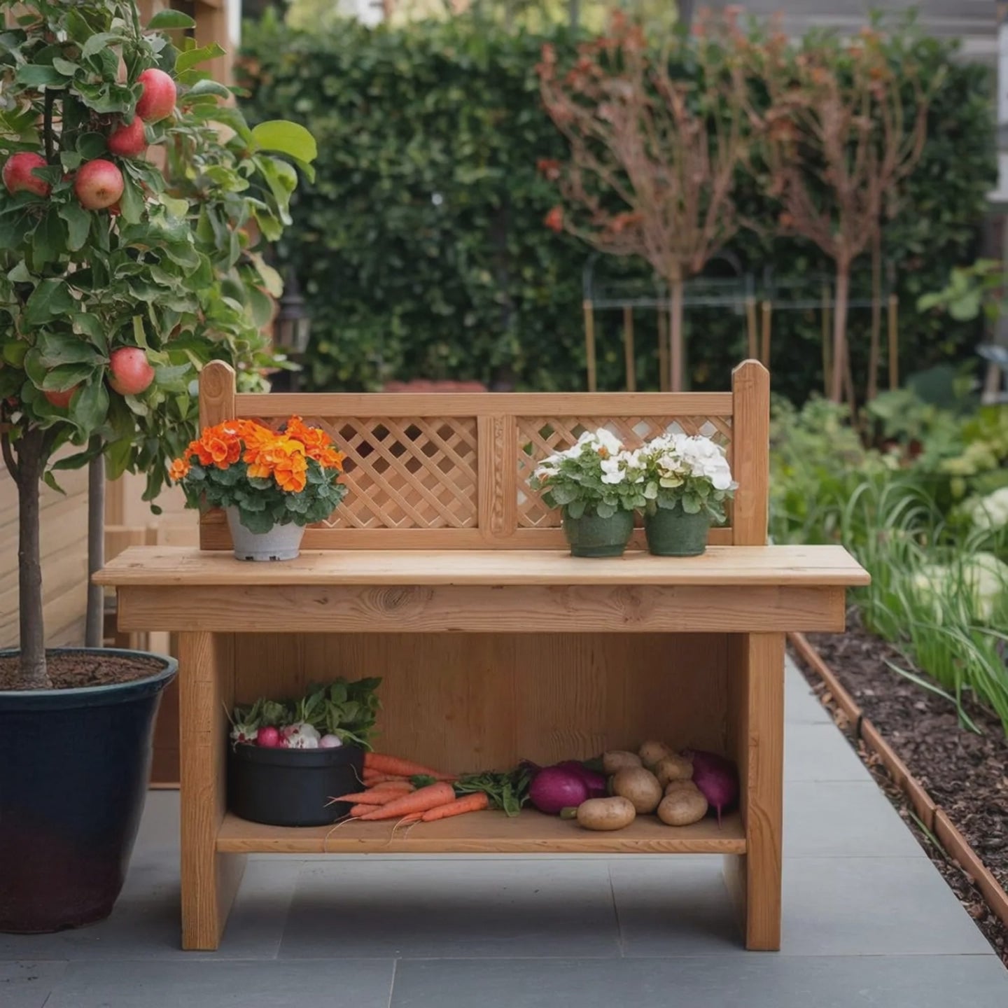 This potting bench features a solid wood frame with a slatted back panel and generous workspace, combining charm and utility. The lattice detail adds visual interest while doubling as a convenient structure for hanging tools or garden accessories. A lower shelf provides easy access to gardening essentials, making it a useful and appealing addition to any outdoor setup.