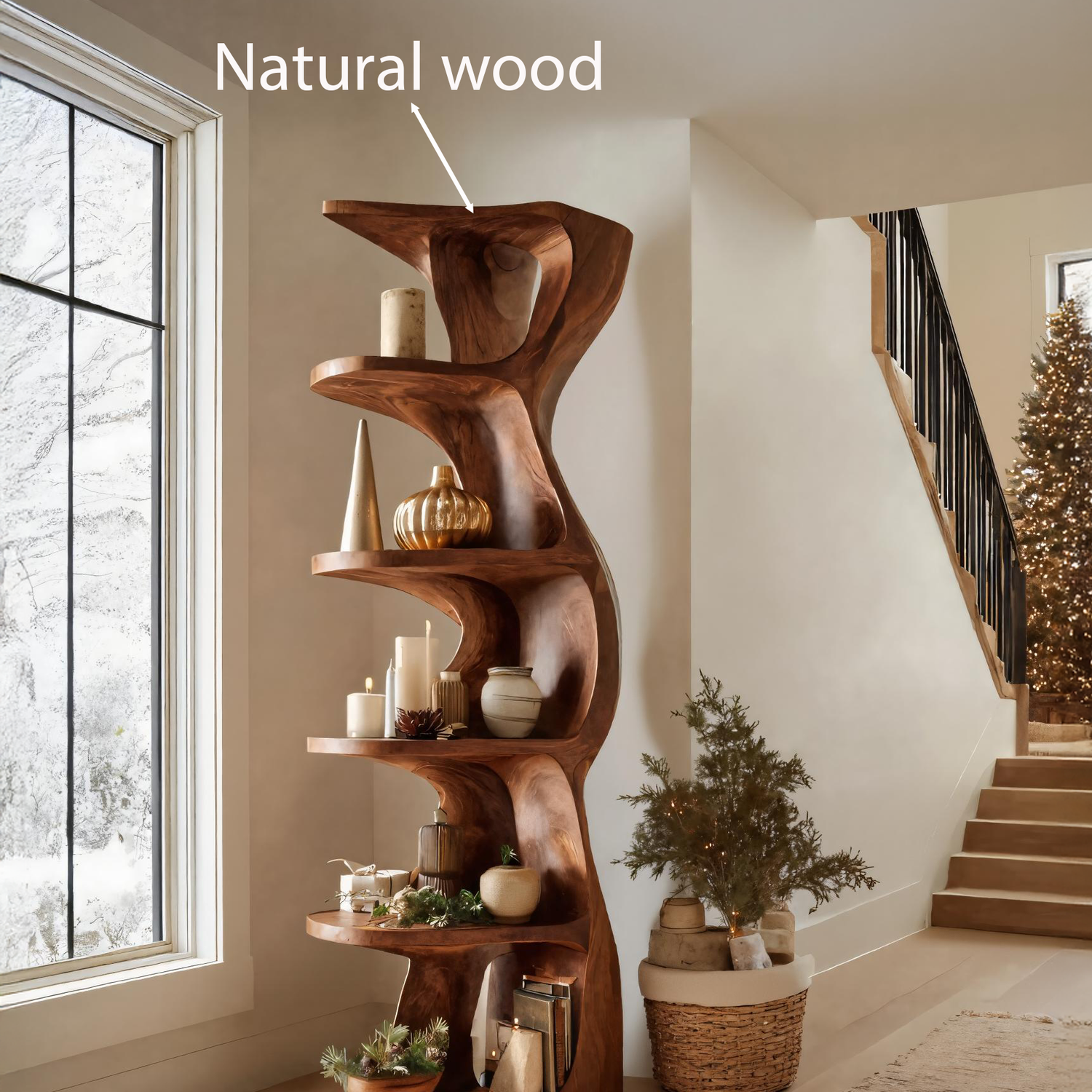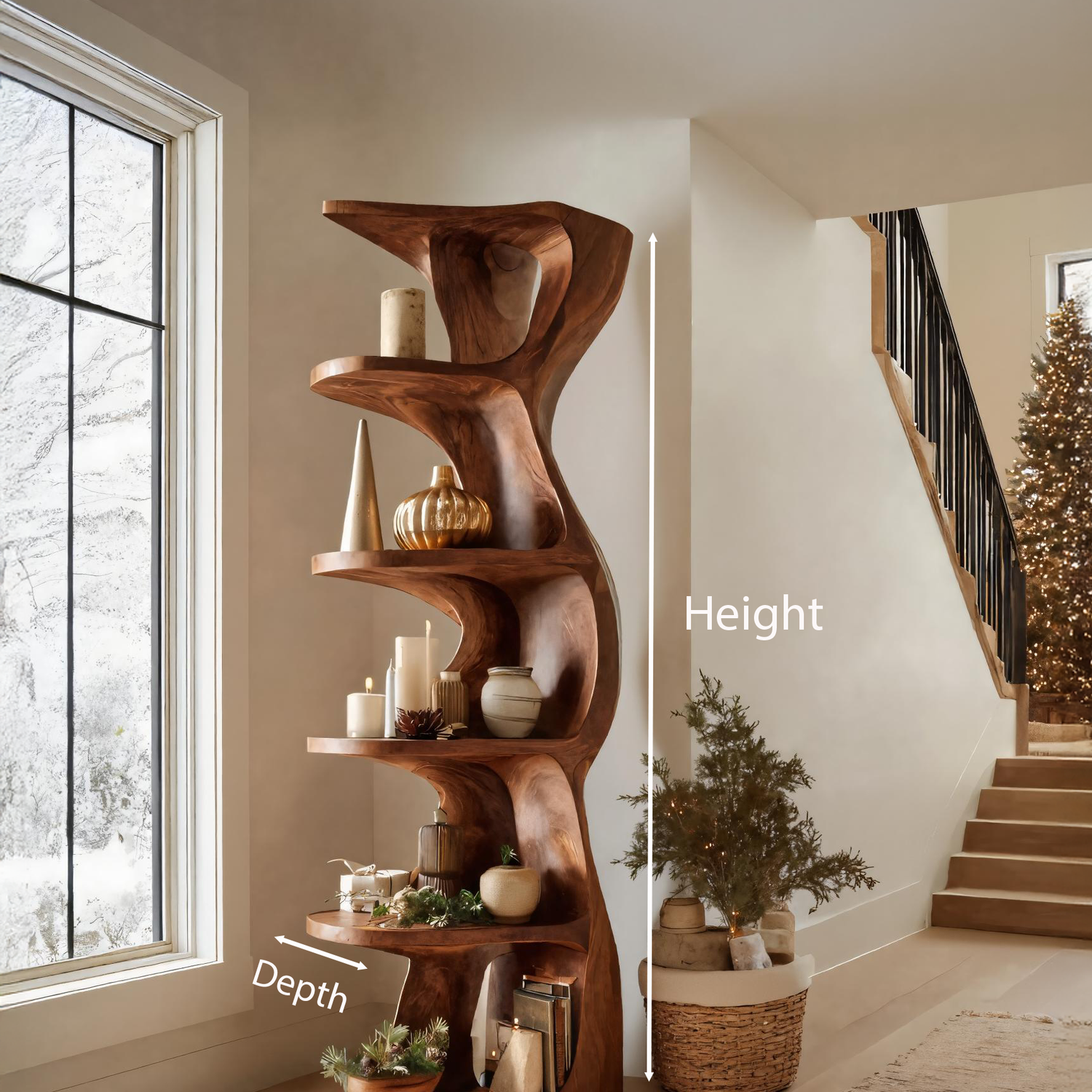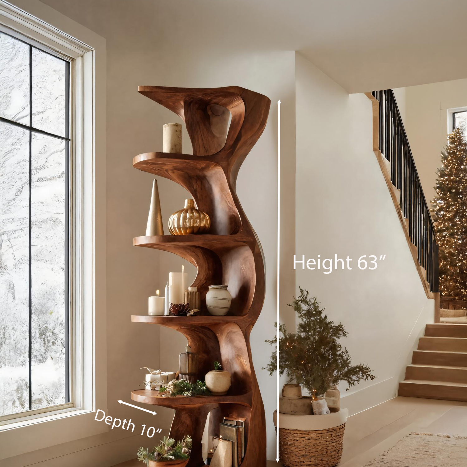 This freestanding shelf captures the rhythm of nature through its sinuous curves and vertical flow. Each level transitions seamlessly into the next, creating a sense of movement while offering practical display surfaces. Perfect for entryways, living rooms, or reading corners, it introduces a calm, grounded presence to contemporary interiors.
