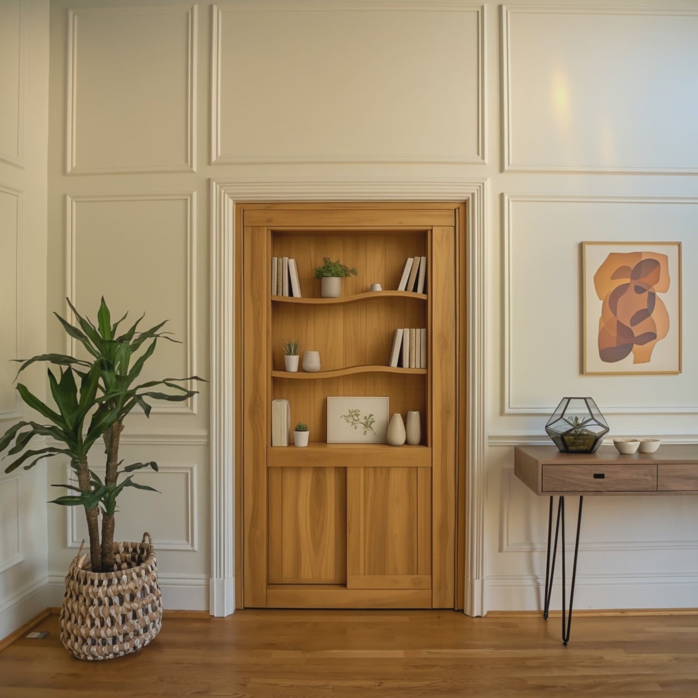 This cleverly designed bookshelf doubles as a fully functional door, crafted from solid wood with gently flowing lines and natural grain patterns. The subtle curvature of the shelves adds organic rhythm to the composition, while the sliding panel below offers concealed storage. Whether leading to a secret reading nook or a private home office, this piece invites curiosity while maintaining a warm, cohesive atmosphere.
