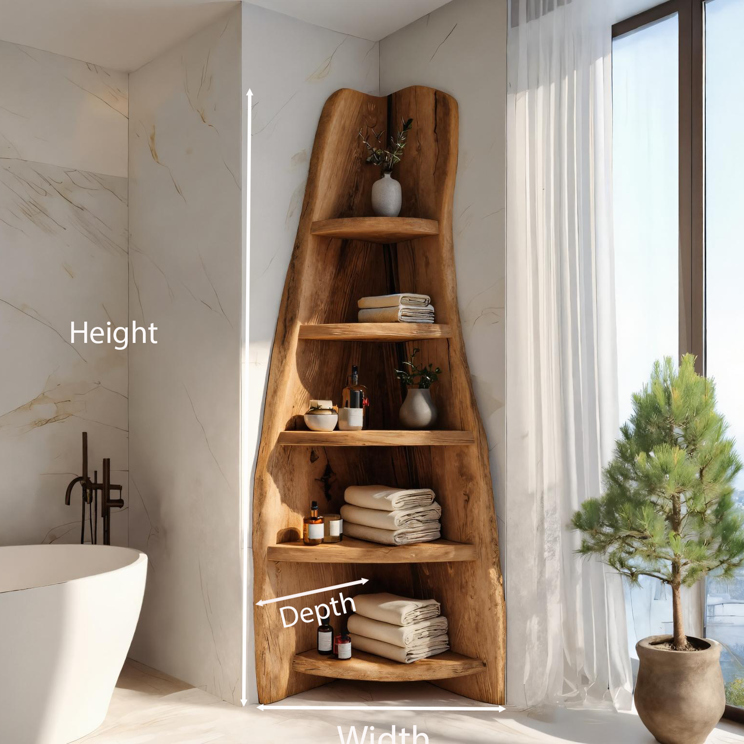 Featuring multiple tiers with a vertical silhouette, this corner shelf showcases the natural edge of solid wood. Its organic curves and unique grain variations bring a sense of character and artistry, making it ideal for storing towels, spa essentials, or decorative items while saving space.