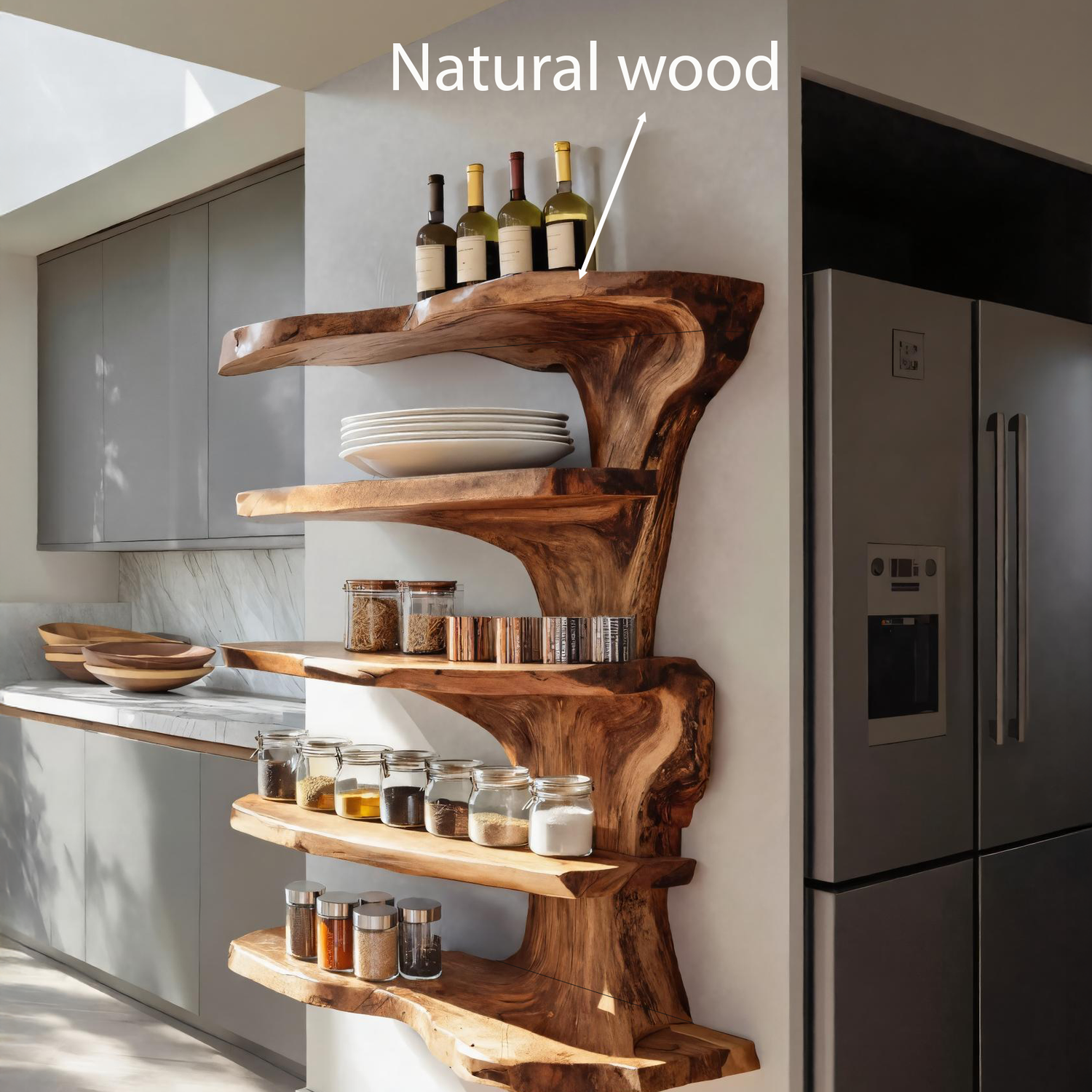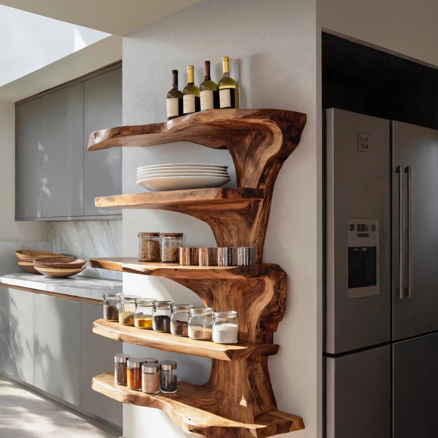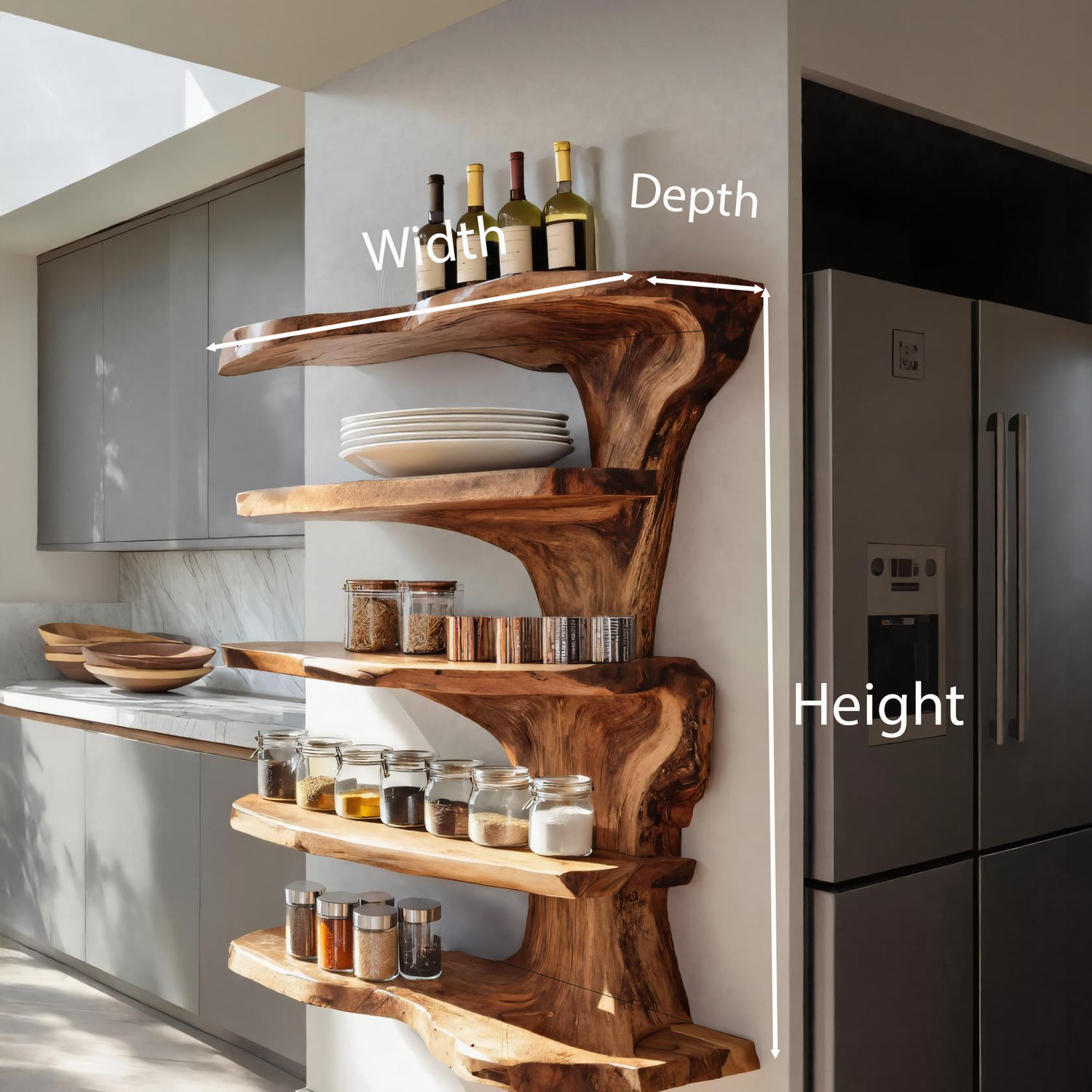 This wall-mounted floating shelf highlights a bold live edge form that captures the raw elegance of solid wood. Its asymmetrical silhouette and clean floating installation give the kitchen a refined yet organic look. The tiered shelving offers versatile storage and display options while emphasizing the shelf’s sculptural flow.