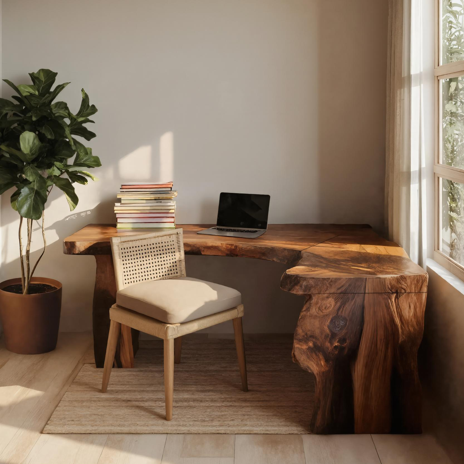 This L-shaped desk embraces the irregular edges and natural shapes of live wood, turning each piece into a one-of-a-kind design. The expansive surface provides generous space for daily tasks, study, or creative projects, while the rustic character of the wood makes it a striking centerpiece in any workspace.