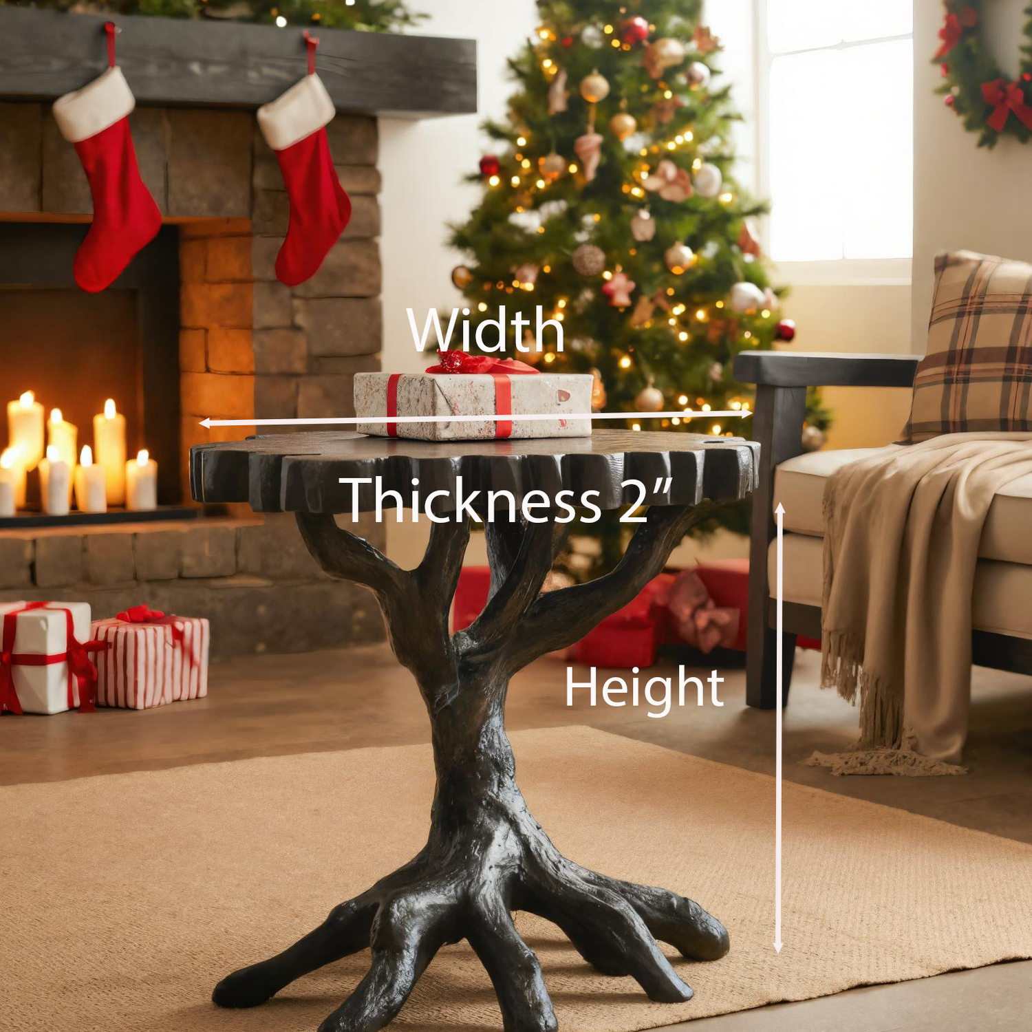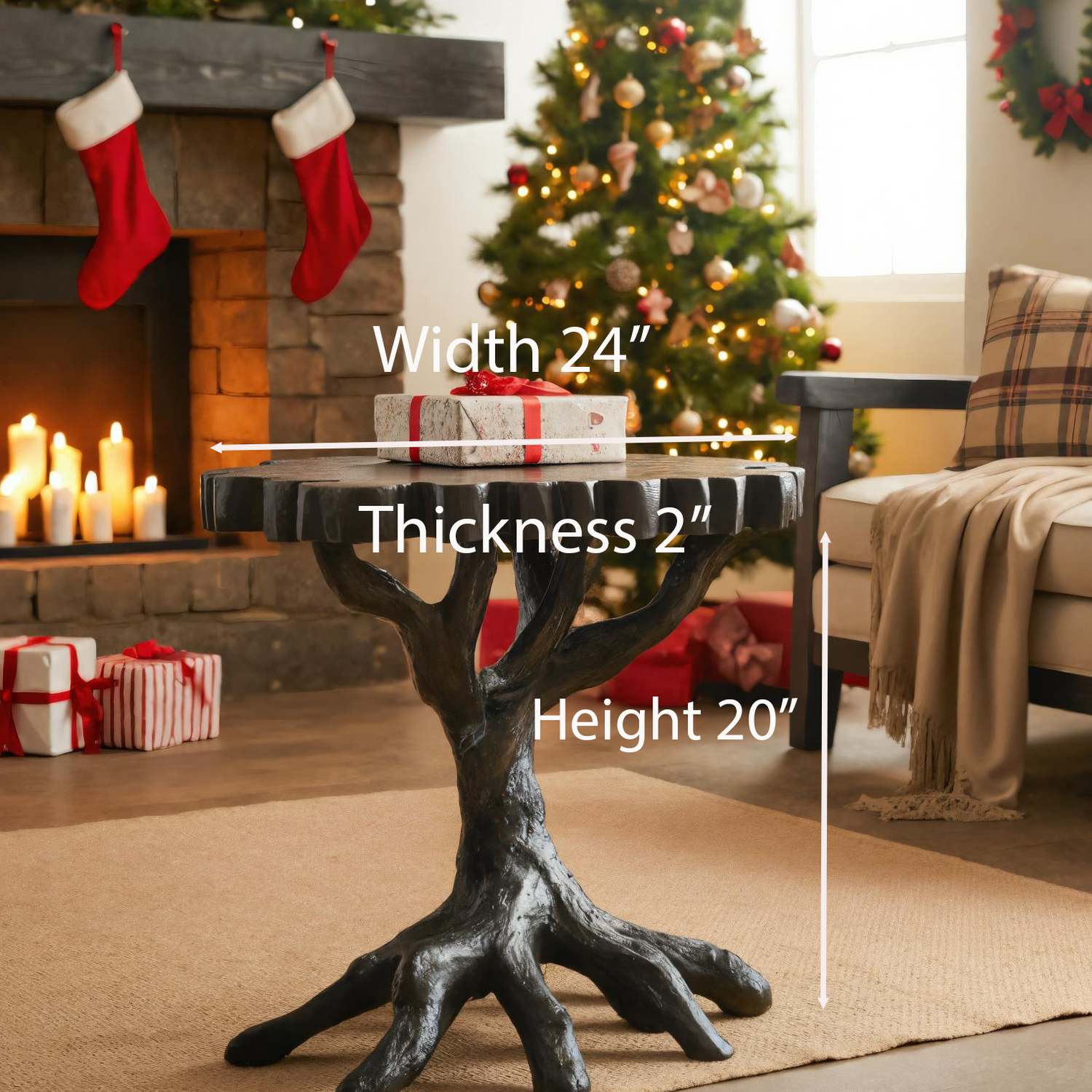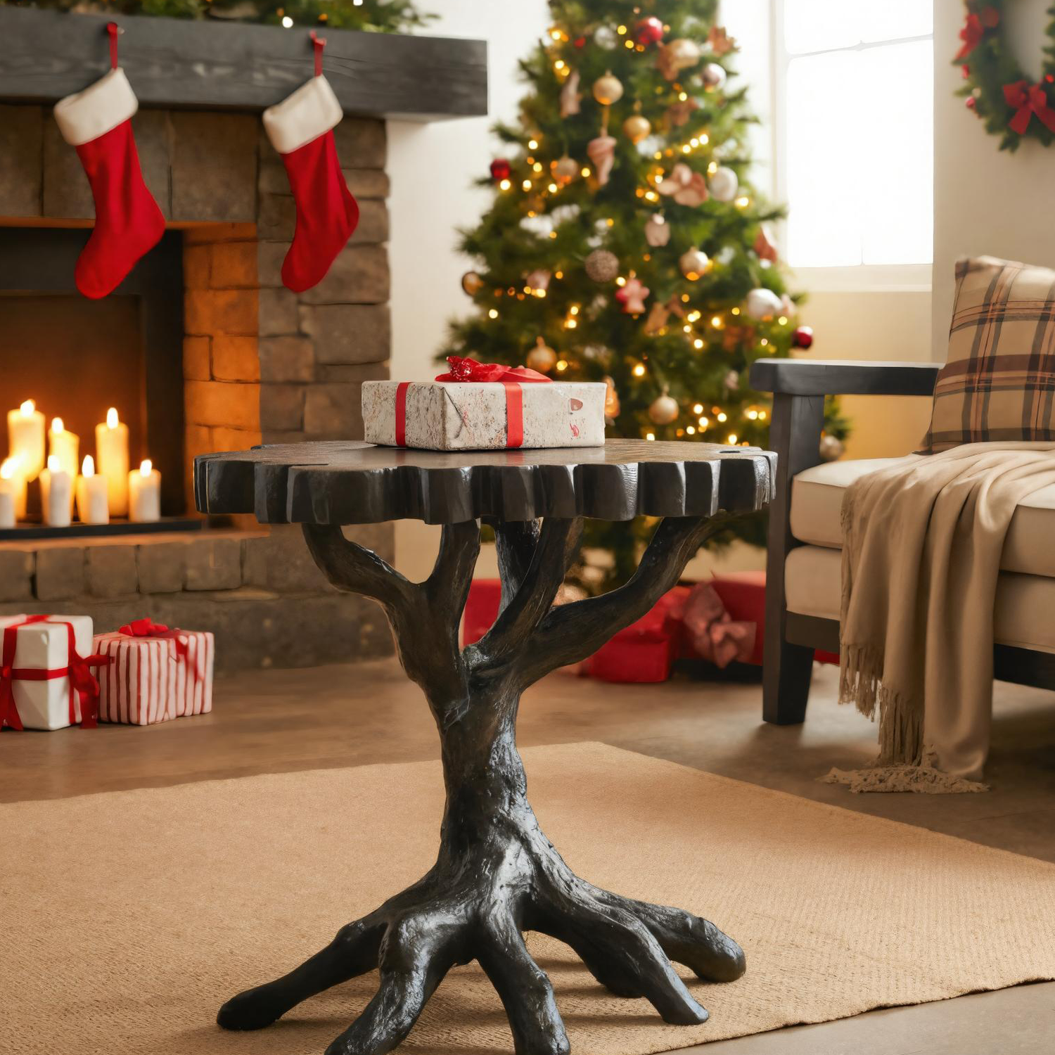 This side table highlights a unique root-inspired base paired with a solid round top, offering both visual interest and practical use. Its organic silhouette adds rhythm and depth, making it an eye-catching feature in living rooms, near fireplaces, or holiday-inspired spaces. The balanced proportions provide a versatile surface for books, décor, or seasonal displays.